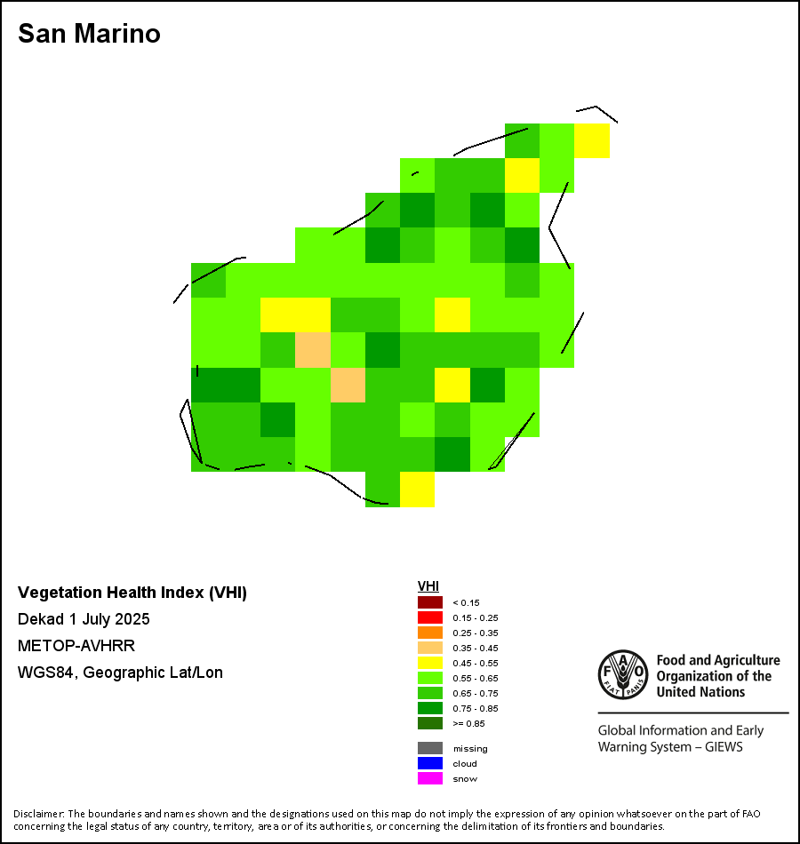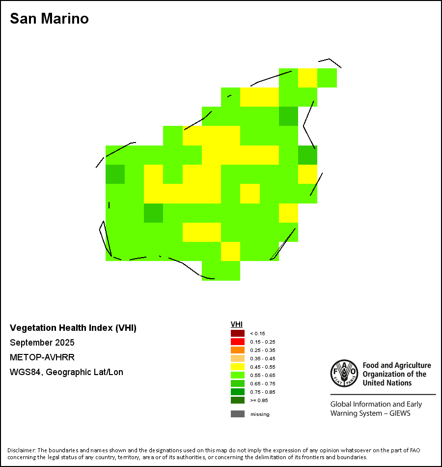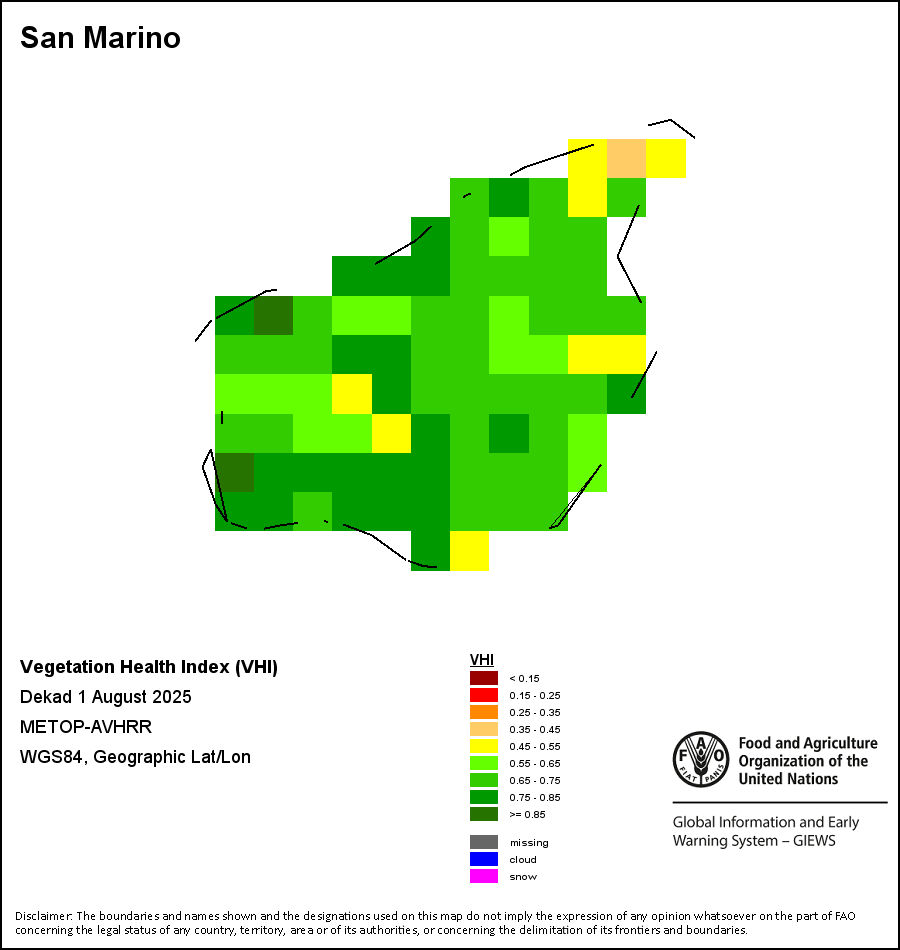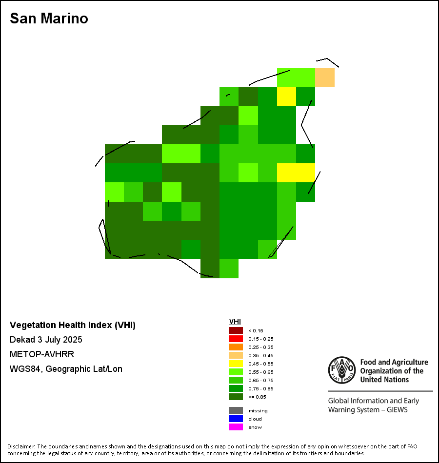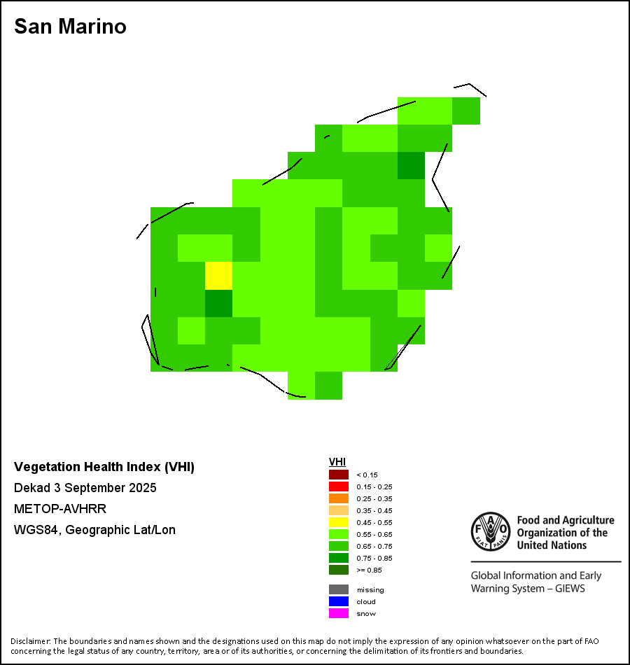 The Vegetation Health Index (VHI) illustrates the severity of drought based on the vegetation health and the influence of temperature on plant conditions. The VHI is a composite index and the elementary indicator used to compute the ASI. It combines both the Vegetation Condition Index (VCI) and the Temperature Condition Index (TCI). The TCI is calculated using a similar equation to the VCI, but relates the current temperature to the long-term maximum and minimum , as it is assumed that higher temperatures tend to cause a deterioration in vegetation conditions. A decrease in the VHI would, for example, indicate relatively poor vegetation conditions and warmer temperatures, signifying stressed vegetation conditions, and over a longer period would be indicative of drought. The VHI images are computed for the two main seasons and in three modalities: dekadal, monthly and annual.