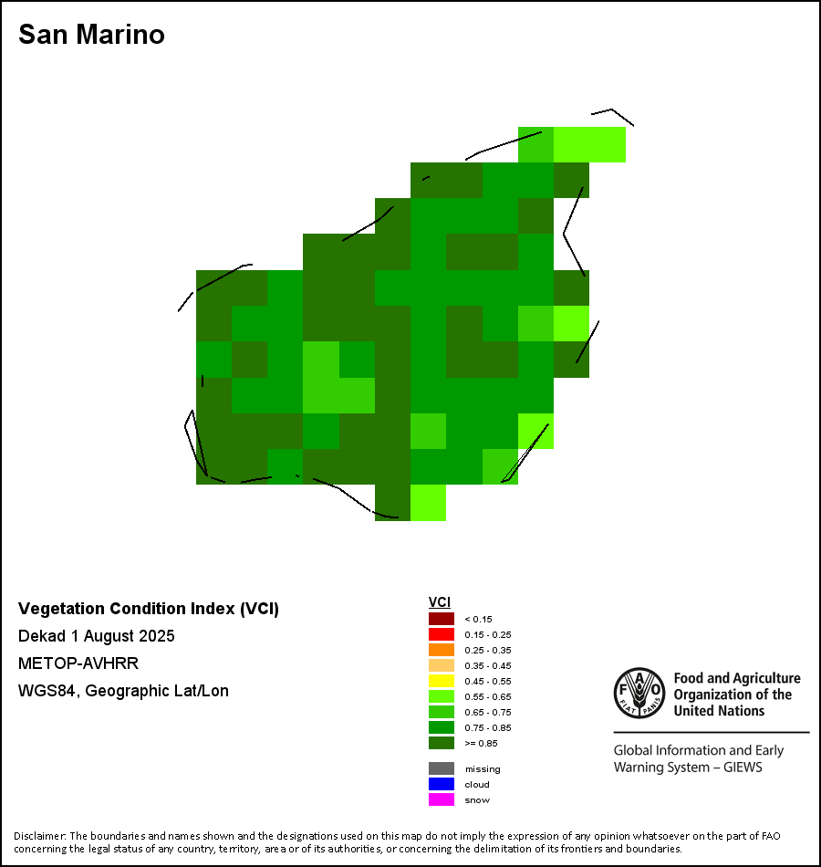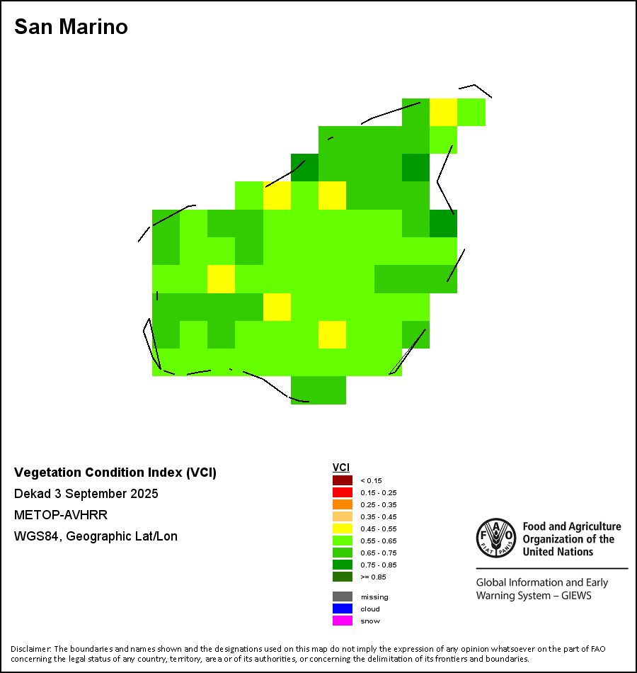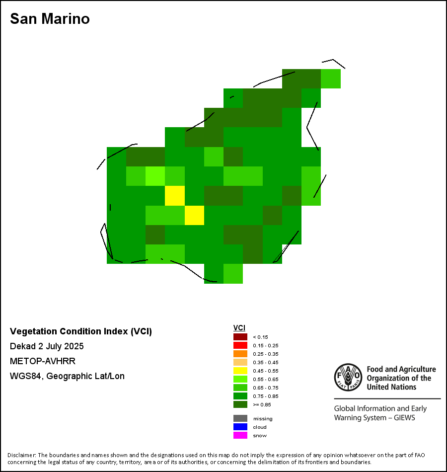 The Vegetation Condition Index (VCI) evaluates the current vegetation health in comparison to the historical trends. The VCI relates current dekadal Normalized Difference Vegetation Index (NDVI) to its long-term minimum and maximum, normalized by the historical range of NDVI values for the same dekad. The VCI was designed to separate the weather-related component of the NDVI from the ecological element.