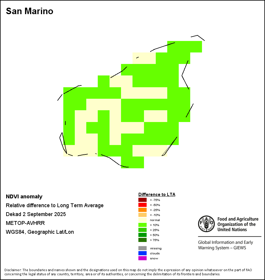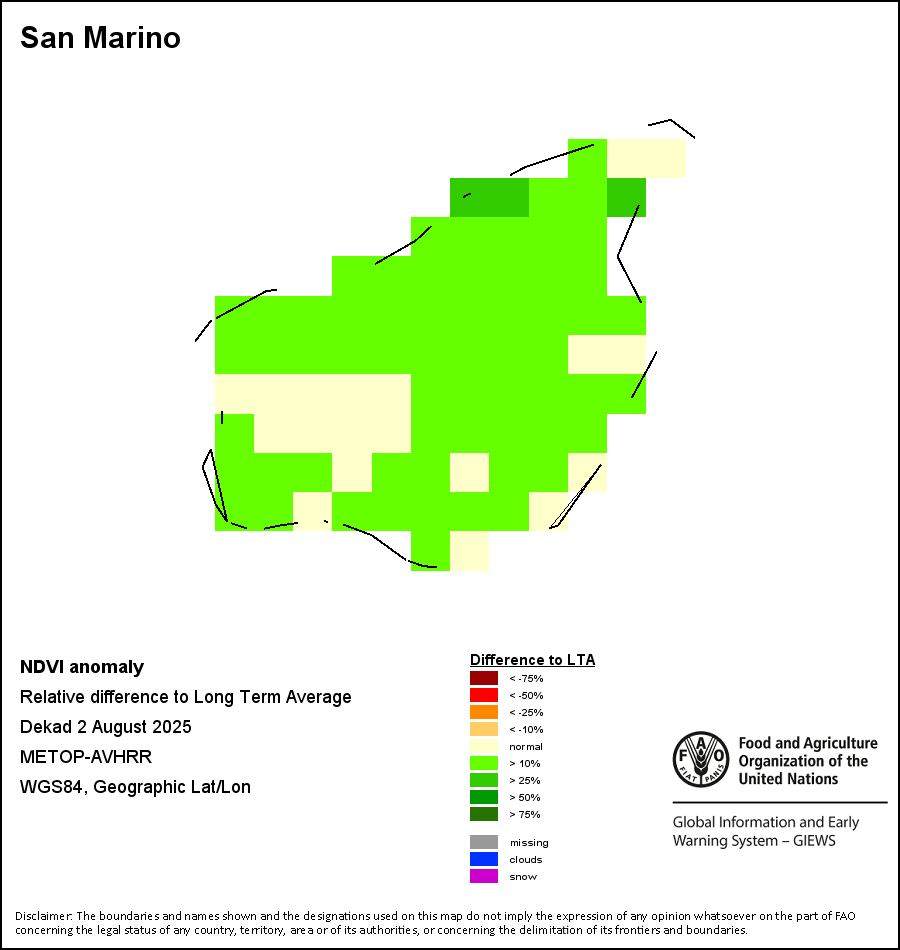 The Normalized Difference Vegetation Index (NDVI) measures the “greenness” of ground cover and is used as a proxy to indicate the density and health of vegetation. NDVI values range from +1 to -1, with high positive values corresponding to dense and healthy vegetation, and low and/or negative NDVI values indicating poor vegetation conditions or sparse vegetative cover. The NDVI anomaly indicates the variation of the current dekad to the long-term average, where a positive value (for example 20 percent) would signify enhanced vegetation conditions compared to the average, while a negative value (for instance -40 percent) would indicate comparatively poor vegetation conditions.