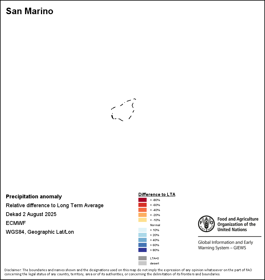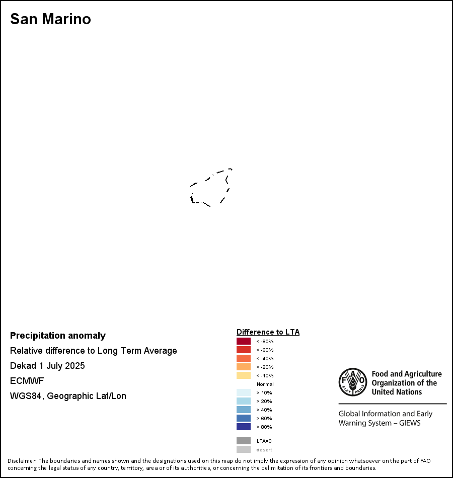 The map illustrates the difference between the current rainfall volume and the average level. Rainfall levels are compared with the Long-Term Average (LTA), which refers to the period 1989-2015. Warmer colours identify areas which have received lower-than-average rainfall, while colder colours are given to areas where precipitation has been above average.