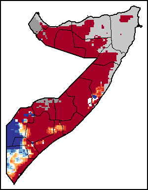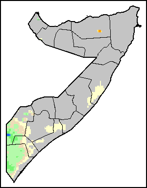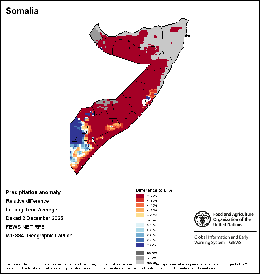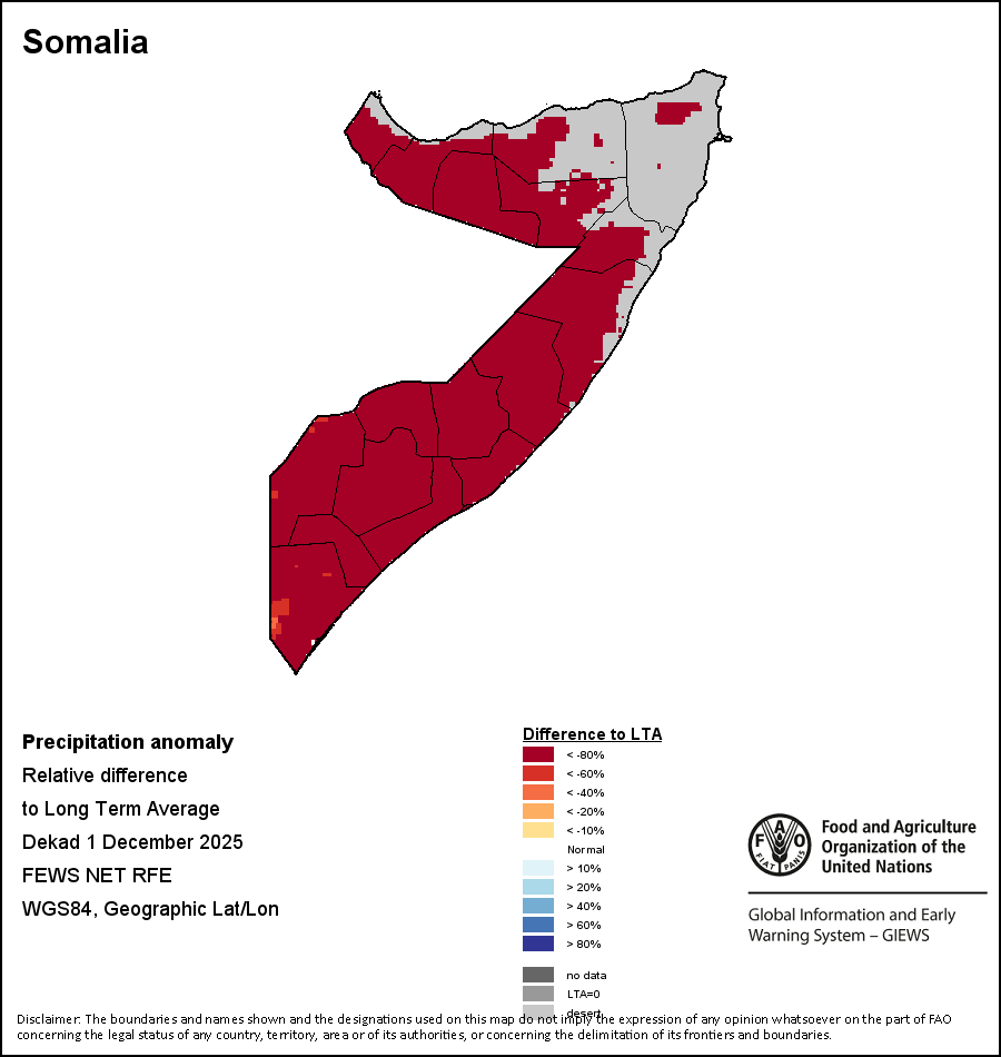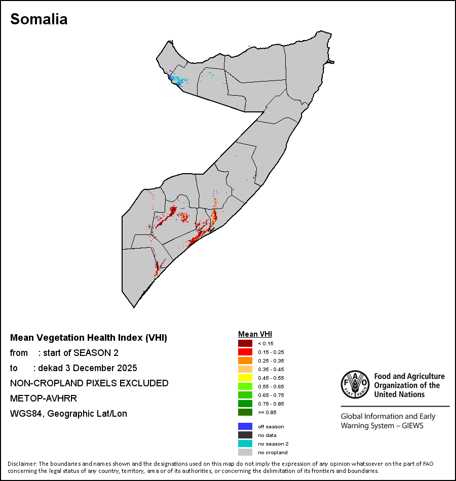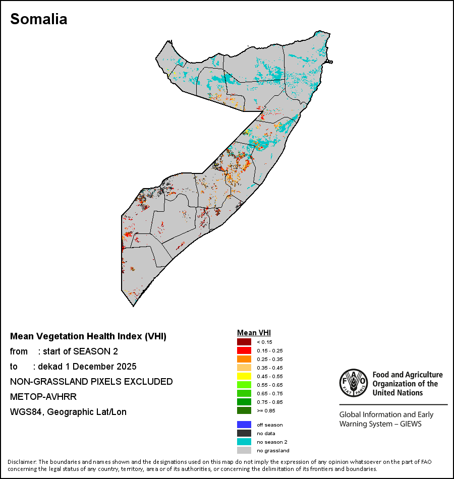 The Normalized Difference Vegetation Index (NDVI) measures the “greenness” of ground cover and is used as a proxy to indicate the density and health of vegetation. NDVI values range from +1 to -1, with high positive values corresponding to dense and healthy vegetation, and low and/or negative NDVI values indicating poor vegetation conditions or sparse vegetative cover. The NDVI anomaly indicates the variation of the current dekad to the long-term average, where a positive value (for example 20 percent) would signify enhanced vegetation conditions compared to the average, while a negative value (for instance -40 percent) would indicate comparatively poor vegetation conditions.