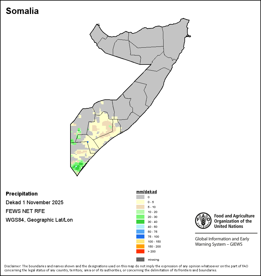 The country level maps and graphs depict the latest 36-month period of the seasonal, vegetation and precipitation indicators. The data is presented by dekad and month. All three vegetation indicators are based on 10-day (dekadal) vegetation data from the METOP-AVHRR sensor at 1 km resolution (2007 and after). Data at 1 km resolution for the period 1984-2006 are derived from the NOAA-AVHRR dataset at 16 km resolution. Precipitation estimates for all African countries (except Cabo Verde and Mauritius) are taken from NOAA/FEWSNet (16 km resolution), while for the remaining countries data is obtained from ECMWF (25 km resolution). Owing to the higher resolution of vegetation indicators (e.g., NDVI, VHI) compared to coarser precipitation indicators, the number of sub-national units for which valid zonal statistics can be generated for vegetation indices is greater than the number of units for precipitation indicators for certain countries.