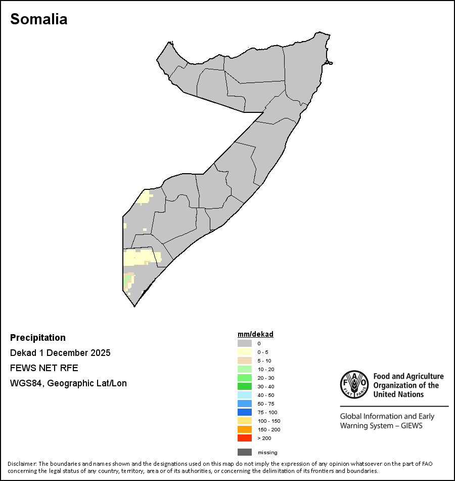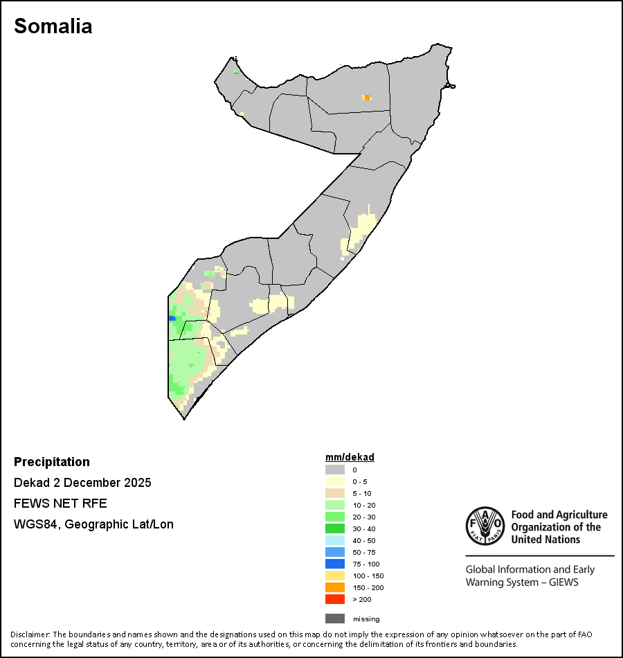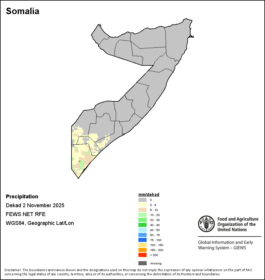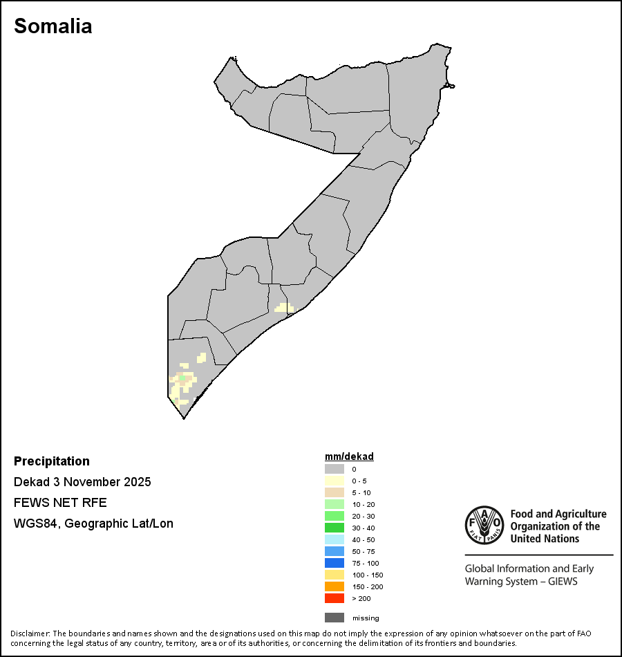 The map depicts cumulative rainfall volumes over a dekad (a 10-day period). Precipitation estimates for all African countries (except Cabo Verde and Mauritius) are taken from NOAA/FEWSNet, while for the remaining countries data is obtained from ECMWF.