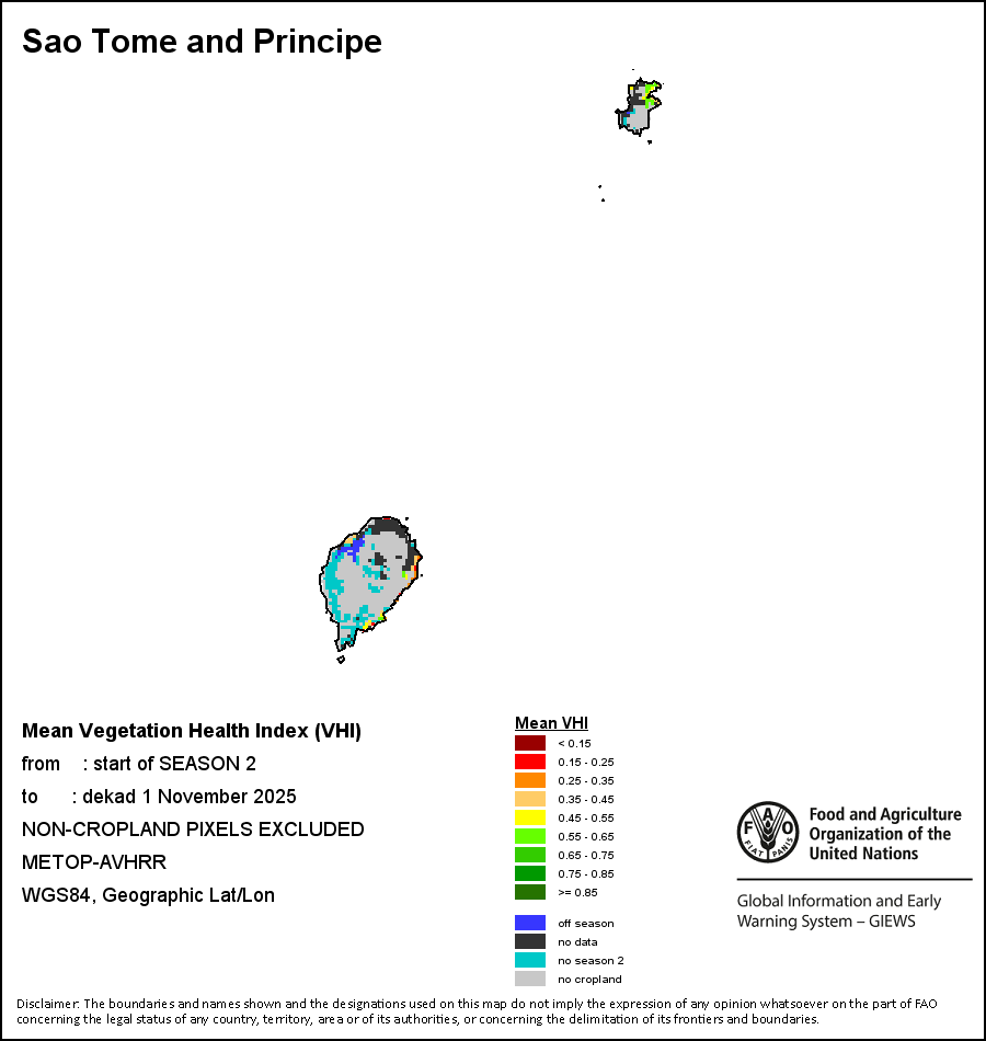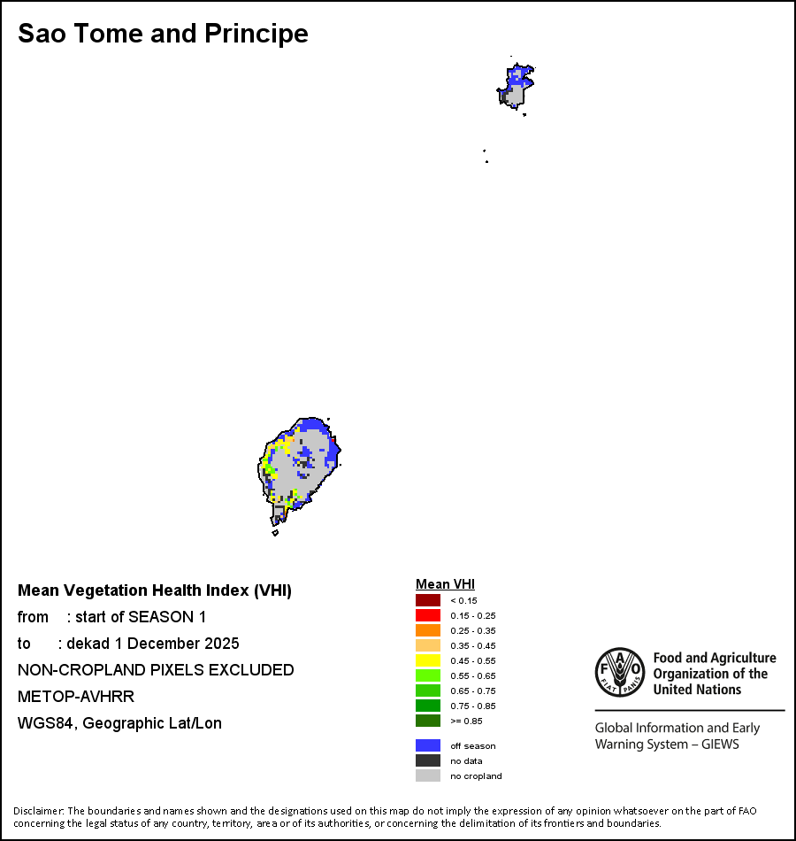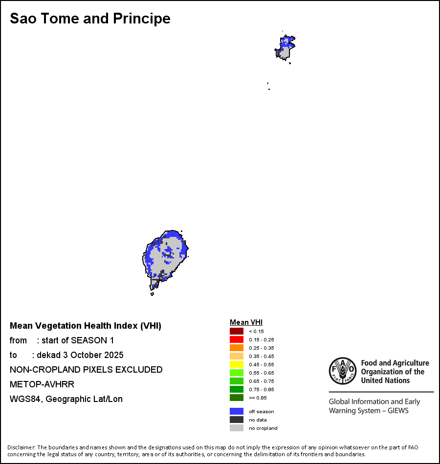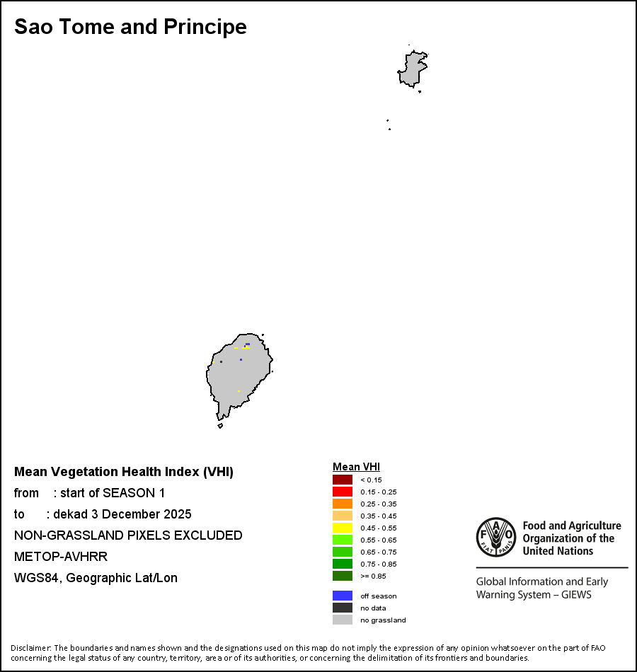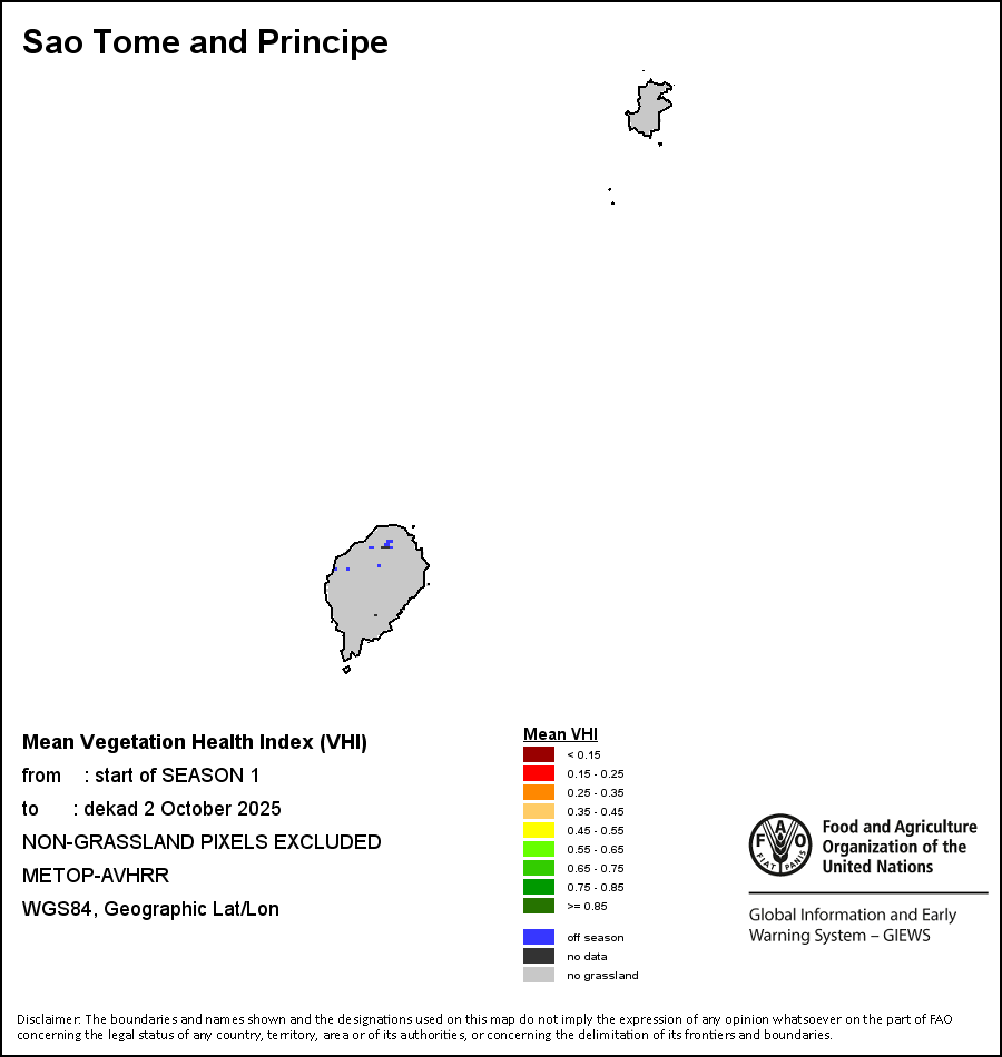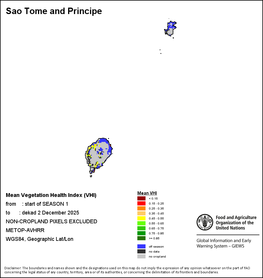 The country level maps and graphs depict the latest 36-month period of the seasonal, vegetation and precipitation indicators. The data is presented by dekad and month. All three vegetation indicators are based on 10-day (dekadal) vegetation data from the METOP-AVHRR sensor at 1 km resolution (2007 and after). Data at 1 km resolution for the period 1984-2006 are derived from the NOAA-AVHRR dataset at 16 km resolution. Precipitation estimates for all African countries (except Cabo Verde and Mauritius) are taken from NOAA/FEWSNet (16 km resolution), while for the remaining countries data is obtained from ECMWF (25 km resolution). Owing to the higher resolution of vegetation indicators (e.g., NDVI, VHI) compared to coarser precipitation indicators, the number of sub-national units for which valid zonal statistics can be generated for vegetation indices is greater than the number of units for precipitation indicators for certain countries.