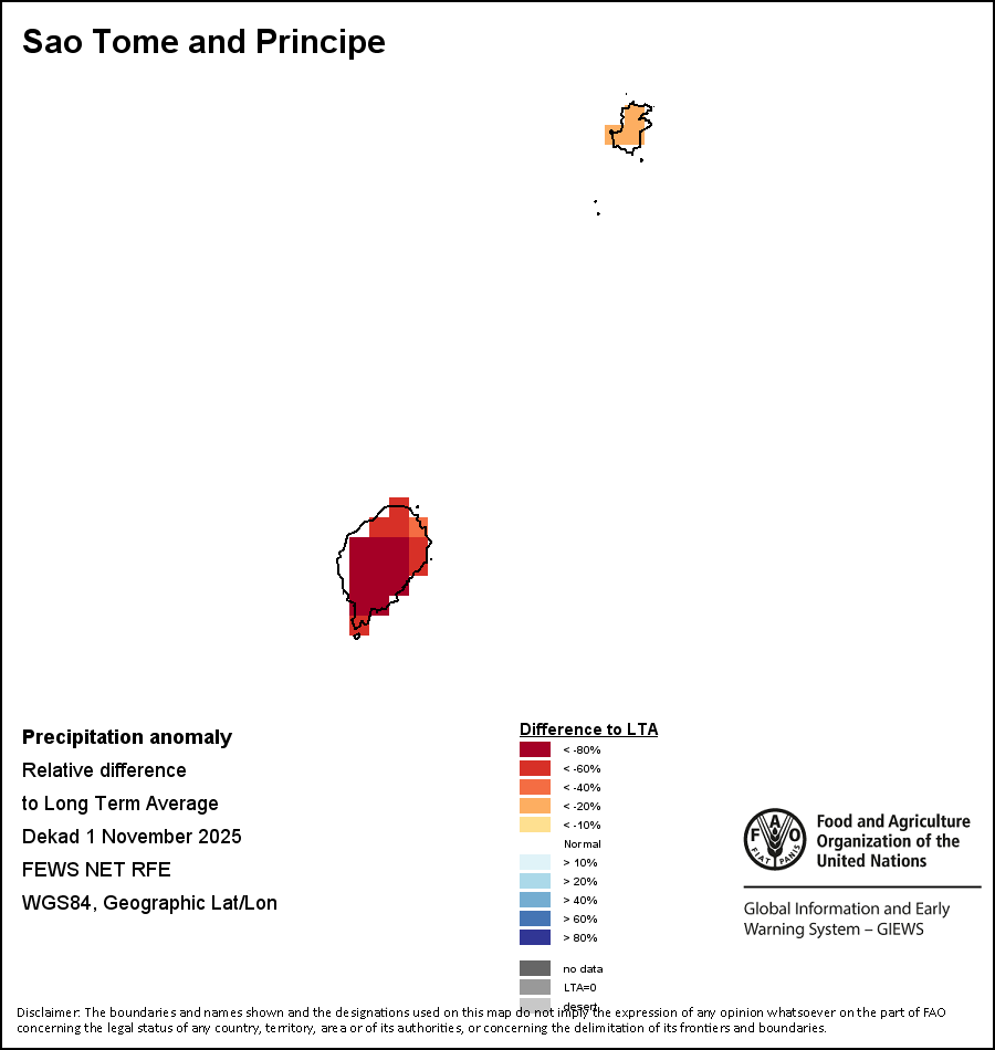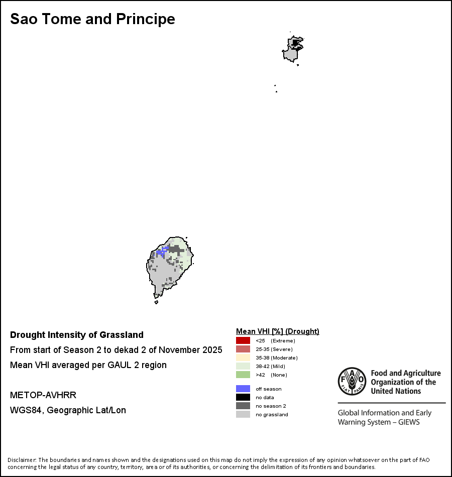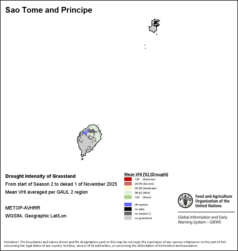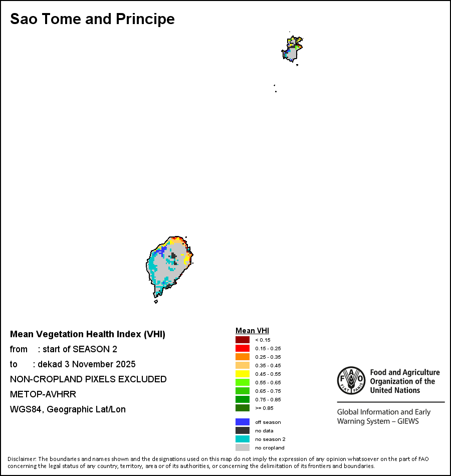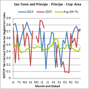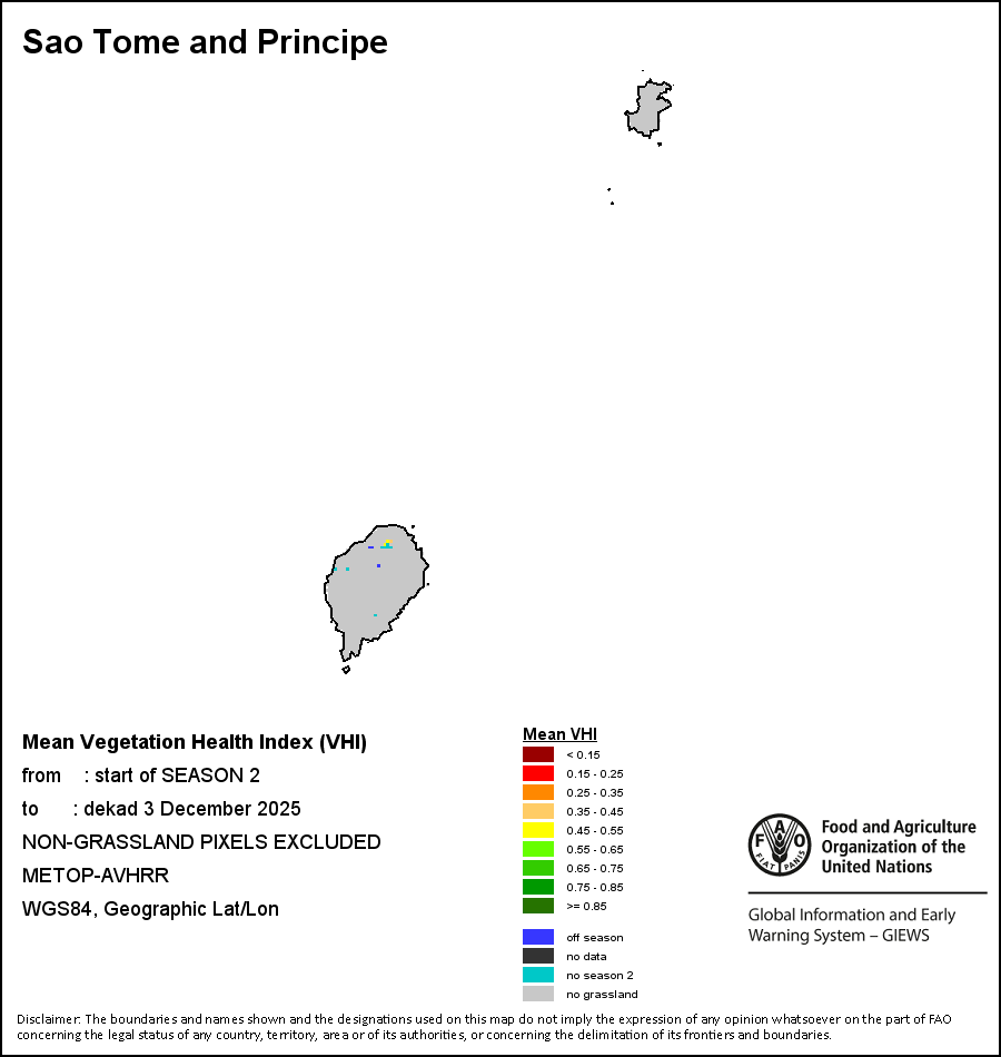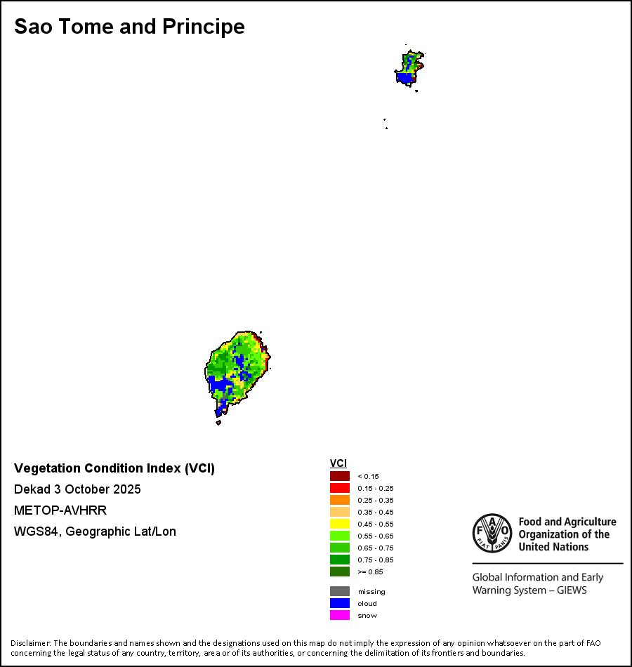 The country level maps and graphs depict the latest 36-month period of the seasonal, vegetation and precipitation indicators. The data is presented by dekad and month. All three vegetation indicators are based on 10-day (dekadal) vegetation data from the METOP-AVHRR sensor at 1 km resolution (2007 and after). Data at 1 km resolution for the period 1984-2006 are derived from the NOAA-AVHRR dataset at 16 km resolution. Precipitation estimates for all African countries (except Cabo Verde and Mauritius) are taken from NOAA/FEWSNet (16 km resolution), while for the remaining countries data is obtained from ECMWF (25 km resolution). Owing to the higher resolution of vegetation indicators (e.g., NDVI, VHI) compared to coarser precipitation indicators, the number of sub-national units for which valid zonal statistics can be generated for vegetation indices is greater than the number of units for precipitation indicators for certain countries.