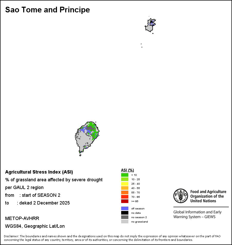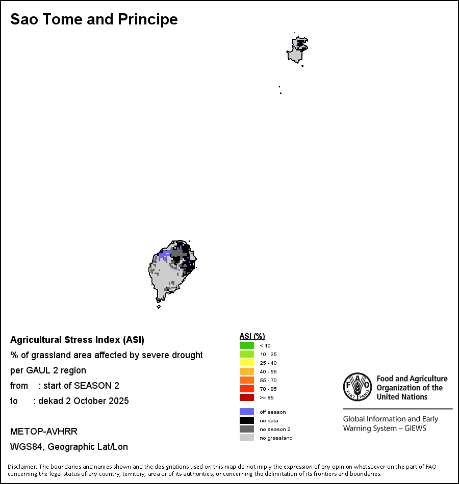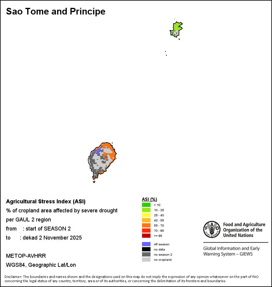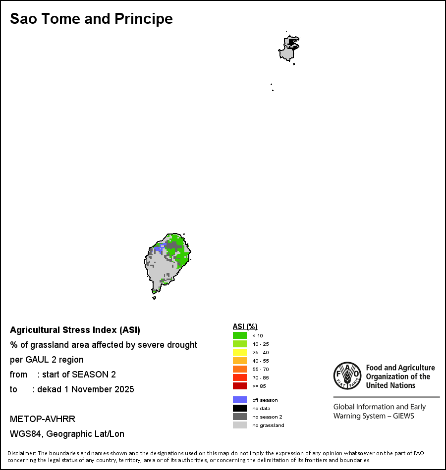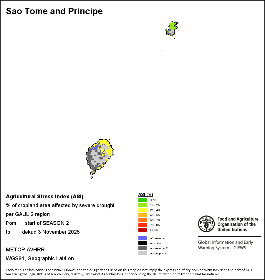The Agricultural Stress Index (ASI) is a quick-look indicator that facilitates the early identification of cropped land with a high likelihood of water stress (drought). The Index is based on the integration of the Vegetation Health Index (VHI) in two dimensions that are critical in the assessment of a drought event in agriculture: temporal and spatial. The first step of the ASI calculation is a temporal averaging of the VHI, assessing the intensity and duration of dry periods occurring during the crop cycle at the pixel level; this calculation includes the use of crop coefficients, which introduces sensitivity of a crop to water stress during each phenological phase. The second step determines the spatial extent of drought events by calculating the percentage of pixels in arable areas with a VHI value below 35 percent (this value was identified as a critical threshold in assessing the extent of drought in previous research by Kogan, 1995). Each administrative area is classified according to the percentage of the affected area to facilitate the quick interpretation of results.