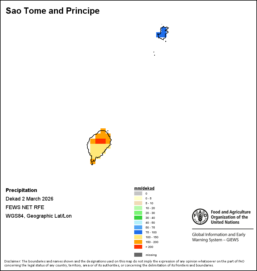 The map depicts cumulative rainfall volumes over a dekad (a 10-day period). Precipitation estimates for all African countries (except Cabo Verde and Mauritius) are taken from NOAA/FEWSNet, while for the remaining countries data is obtained from ECMWF.