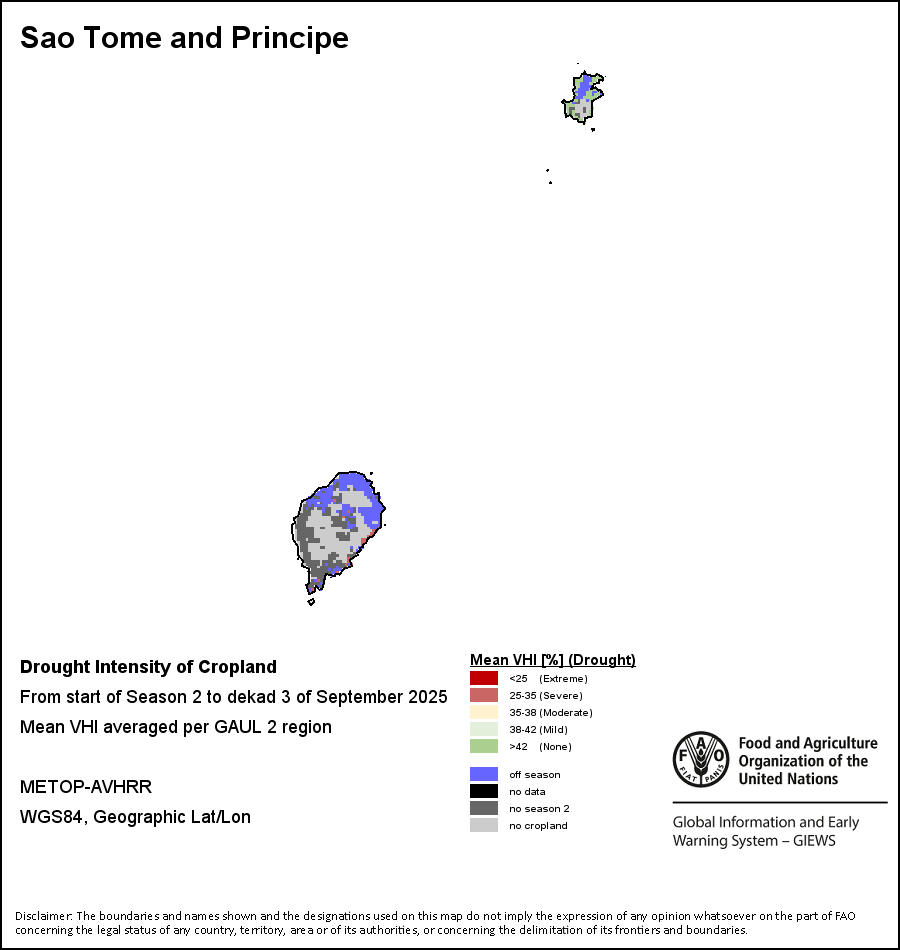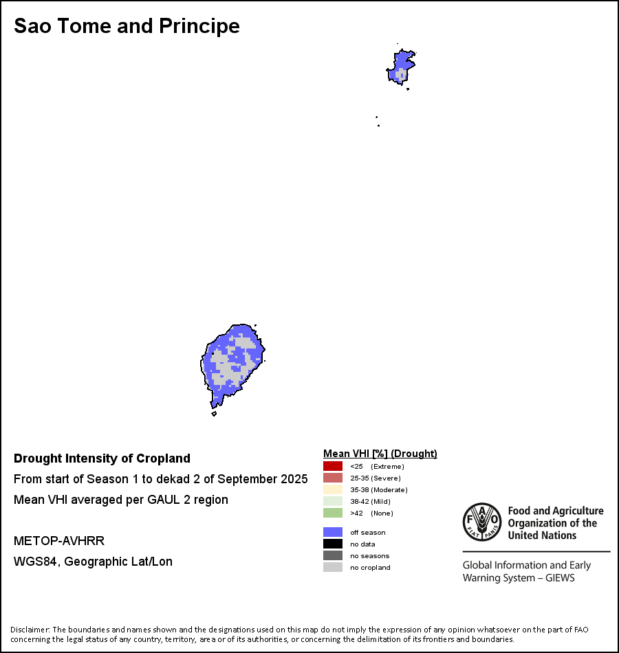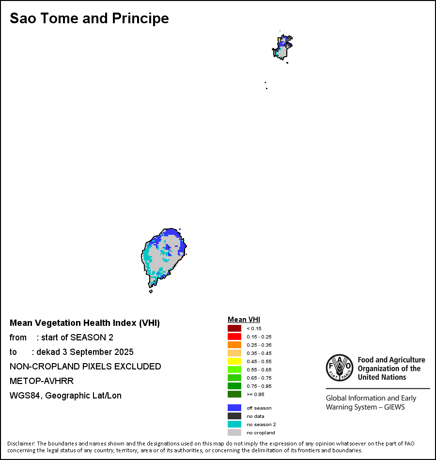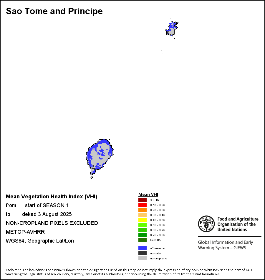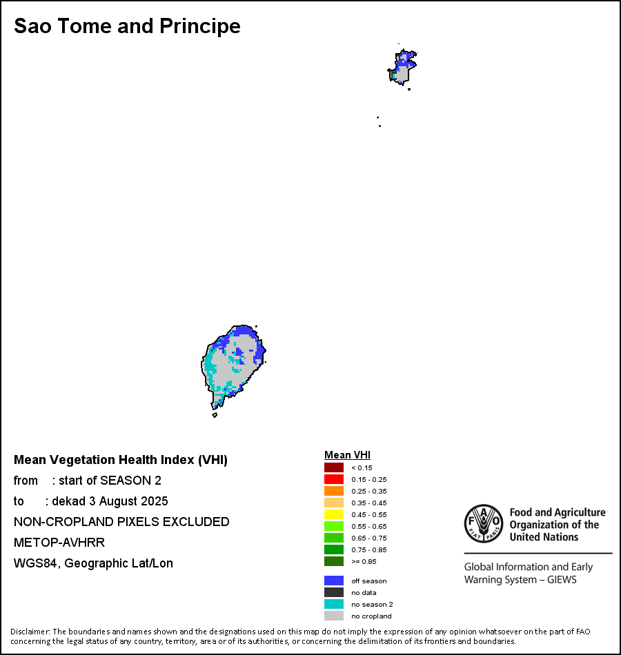 L'indice de santé de la végétation moyen pondérée (VHI moyen pondérée) permet à l'utilisateur d'évaluer la gravité de la sécheresse depuis le début de la saison de croissance et d'examiner l'état de santé de la végétation et l'influence de la température sur les conditions des plantes. Le VHI moyen pondérée est une moyenne des valeurs décadaires du VHI au cours de la saison de croissance des cultures (du début jusqu’à la dernière décade d’analyse), pondérée par les coefficients culturaux (Kc), attribués aux valeurs du VHI aux décades correspondant au début de la saison (SOS), maximum de la saison (MOS) et fin de la saison (EOS). L’application des coefficients culturaux vise à refléter la sensibilité des cultures face à un stress hydrique à différents stades phénologiques.