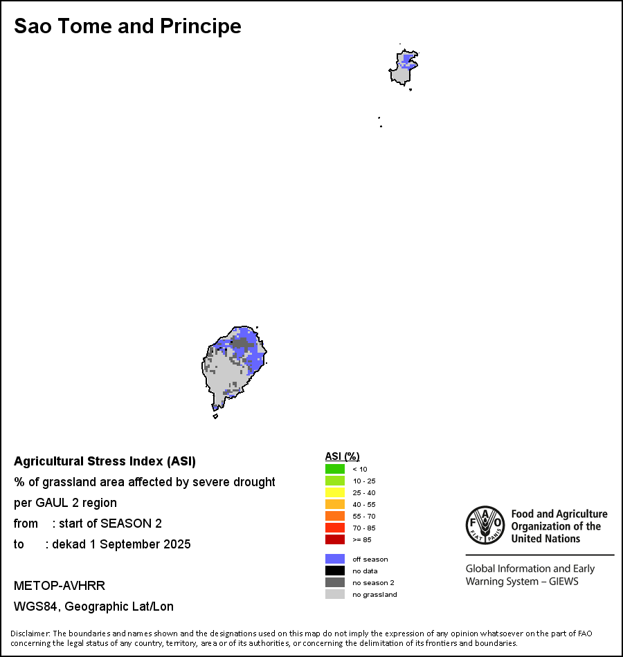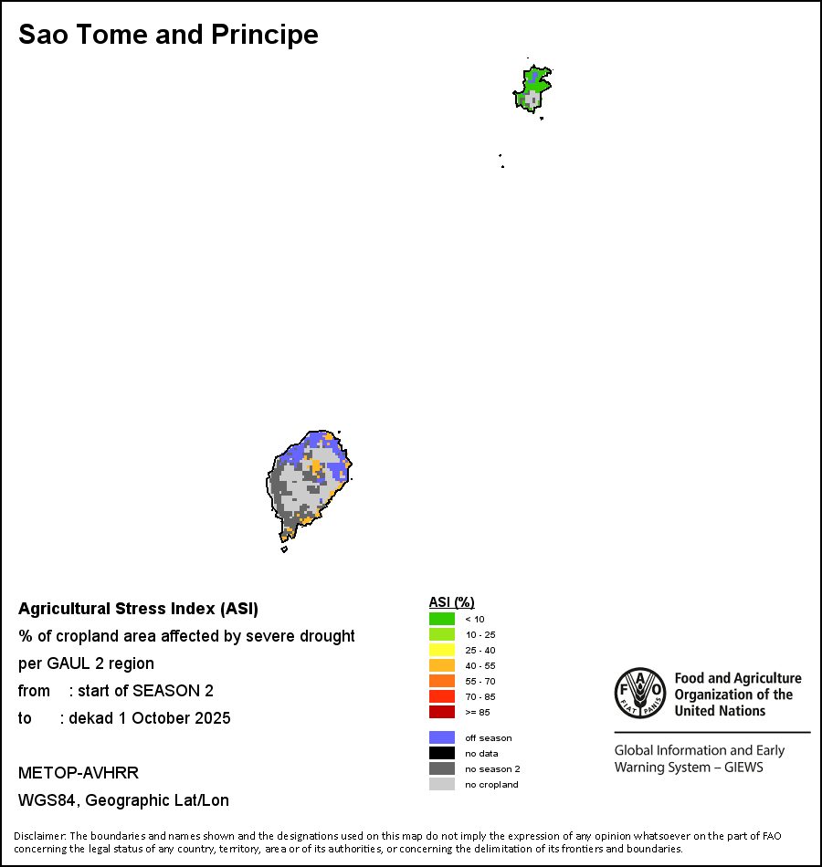 L'indice de stress hydrique (ASI – Agricultural Stress Index) est un indicateur qui facilite l'identification précoce des terres cultivées souffrant probablement de stress hydrique (sécheresse). L’indice se base sur l'Indice de santé de la végétation (VHI – Vegetation Health Index) auquel sont intégrées les dimensions espace-temps, essentielles pour évaluer un épisode de sécheresse dans le contexte agricole. La première étape du calcul de l’ASI consiste à établir une moyenne temporelle du VHI, en évaluant l'intensité et la durée des périodes de sécheresse se produisant pendant le cycle de culture au niveau du pixel; ce calcul comprend l'utilisation de coefficients de culture, qui permettent de tenir compte de la sensibilité d’une culture au stress hydrique pendant chaque phase phénologique. La deuxième étape consiste à déterminer l'étendue spatiale des épisodes de sécheresse en calculant le pourcentage de pixels dans les zones arables pour lequel la valeur du VHI est inférieure à 35 pour cent (cette valeur a été identifiée comme seuil critique dans l'évaluation de l'étendue de la sécheresse lors de précédentes recherches, Kogan, 1995). Enfin, chaque zone administrative est classée selon son pourcentage de superficie touchée afin de faciliter une interprétation rapide des résultats.