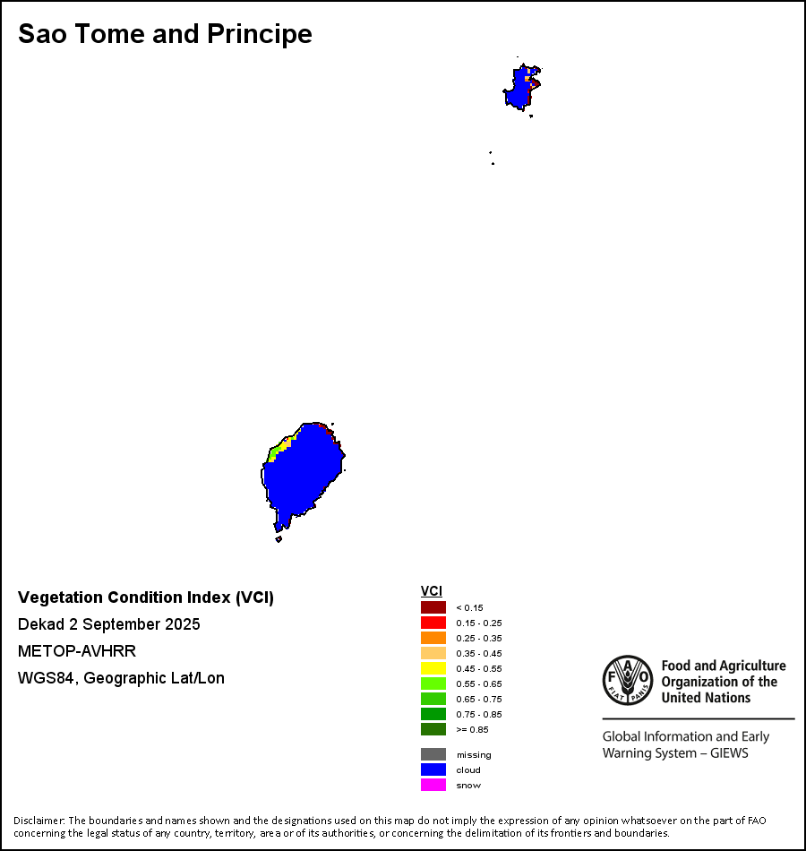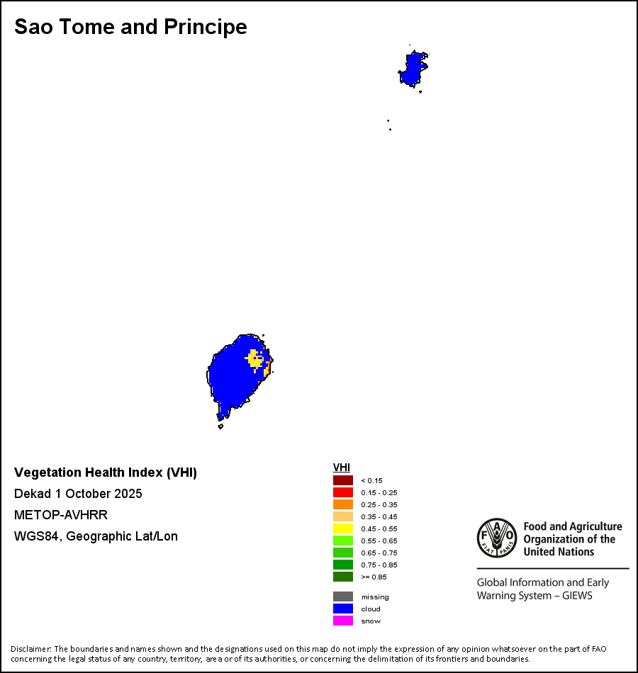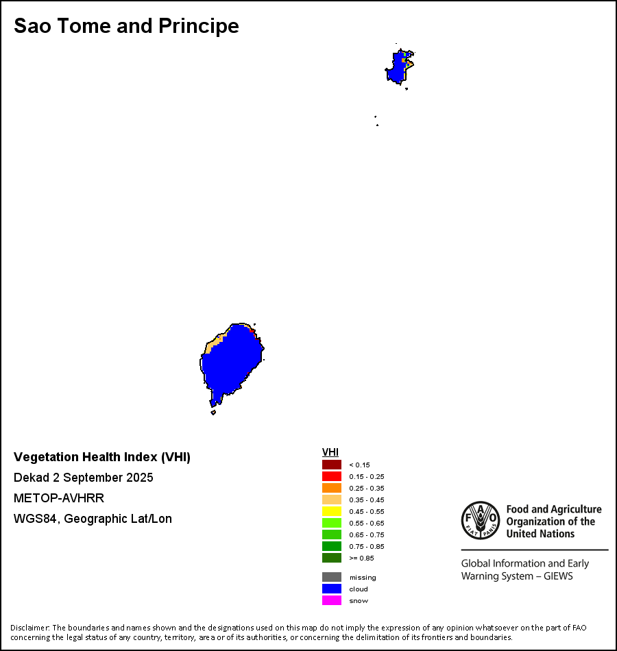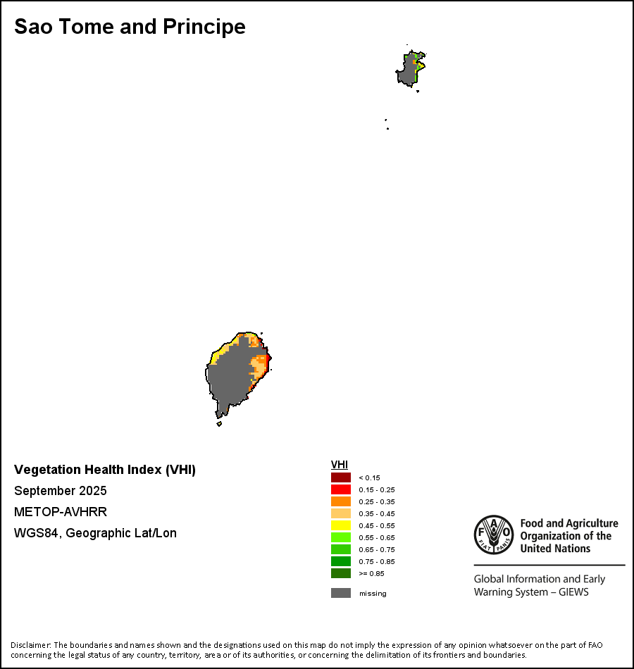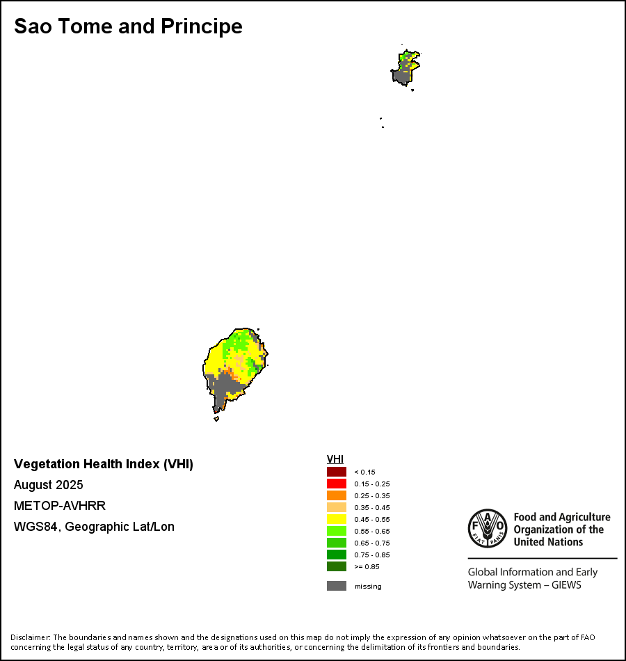 L'indicateur de santé de la végétation (VHI – Vegetation Health Index) illustre la gravité des sécheresses en se fondant sur l'état de la végétation et l'influence des températures sur les conditions des plantes. Le VHI est un indice composite et l'indicateur primaire utilisé pour calculer l’ASI. Les composantes du VHI (VCI et TCI) reçoivent la même pondération dans le calcul de l'indice. Il combine à la fois le VCI et l'Indice des conditions de température (TCI – Temperature Condition Index). Le TCI est calculé à l’aide d’une équation similaire au VCI, mais rapporte les températures actuelles à leur maximum et minimum à long terme, en supposant qu’une élévation des températures tend à provoquer une détérioration des conditions de la végétation. Une diminution du VHI indique, par exemple, un état de la végétation relativement mauvais et une augmentation des températures, ce qui signifie que les conditions de végétation sont soumises à un stress, voire une sécheresse sur une période longue. Les données du VHI sont calculées pour les deux principales campagnes et sous trois formes: décadaires, mensuelles et annuelles.