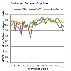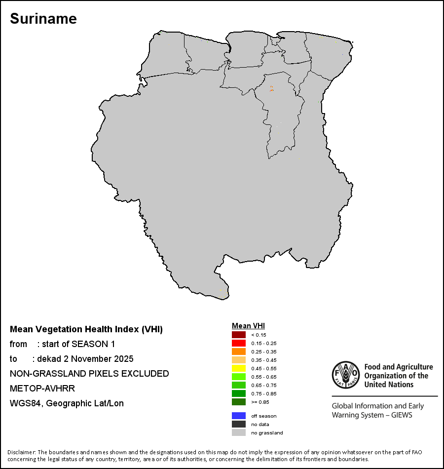 The country level maps and graphs depict the latest 36-month period of the seasonal, vegetation and precipitation indicators. The data is presented by dekad and month. All three vegetation indicators are based on 10-day (dekadal) vegetation data from the METOP-AVHRR sensor at 1 km resolution (2007 and after). Data at 1 km resolution for the period 1984-2006 are derived from the NOAA-AVHRR dataset at 16 km resolution. Precipitation estimates for all African countries (except Cabo Verde and Mauritius) are taken from NOAA/FEWSNet (16 km resolution), while for the remaining countries data is obtained from ECMWF (25 km resolution). Owing to the higher resolution of vegetation indicators (e.g., NDVI, VHI) compared to coarser precipitation indicators, the number of sub-national units for which valid zonal statistics can be generated for vegetation indices is greater than the number of units for precipitation indicators for certain countries.