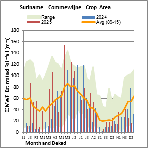 The map depicts cumulative rainfall volumes over a dekad (a 10-day period). Precipitation estimates for all African countries (except Cabo Verde and Mauritius) are taken from NOAA/FEWSNet, while for the remaining countries data is obtained from ECMWF.