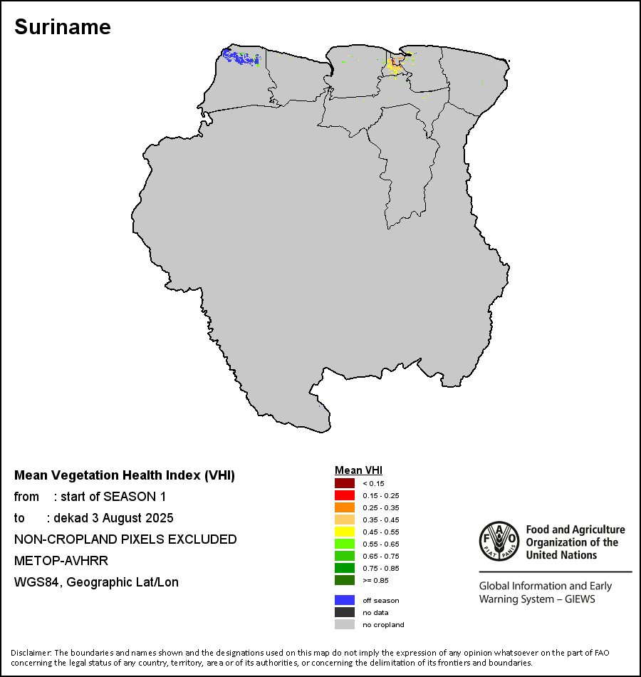 The Weighted Mean Vegetation Health Index (Weighted Mean VHI) allows the user to assess the severity of the drought from the start of the growing season, examining the vegetation health and the influence of temperature on plant conditions. The Mean VHI is an average of the dekadal VHI values over the crop growing season (from the start until the last dekad of analysis), weighted by crop coefficients (Kc), assigned to VHI values at the dekads corresponding to the Start of the Season (SOS), Maximum of the Season (MOS) and End of the Season (EOS). Crop coefficient is applied for the purpose of reflecting the crop’s water sensitivity at different phenology stages.