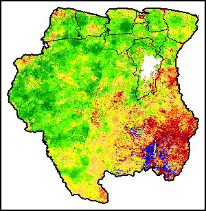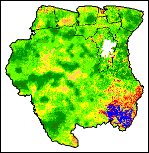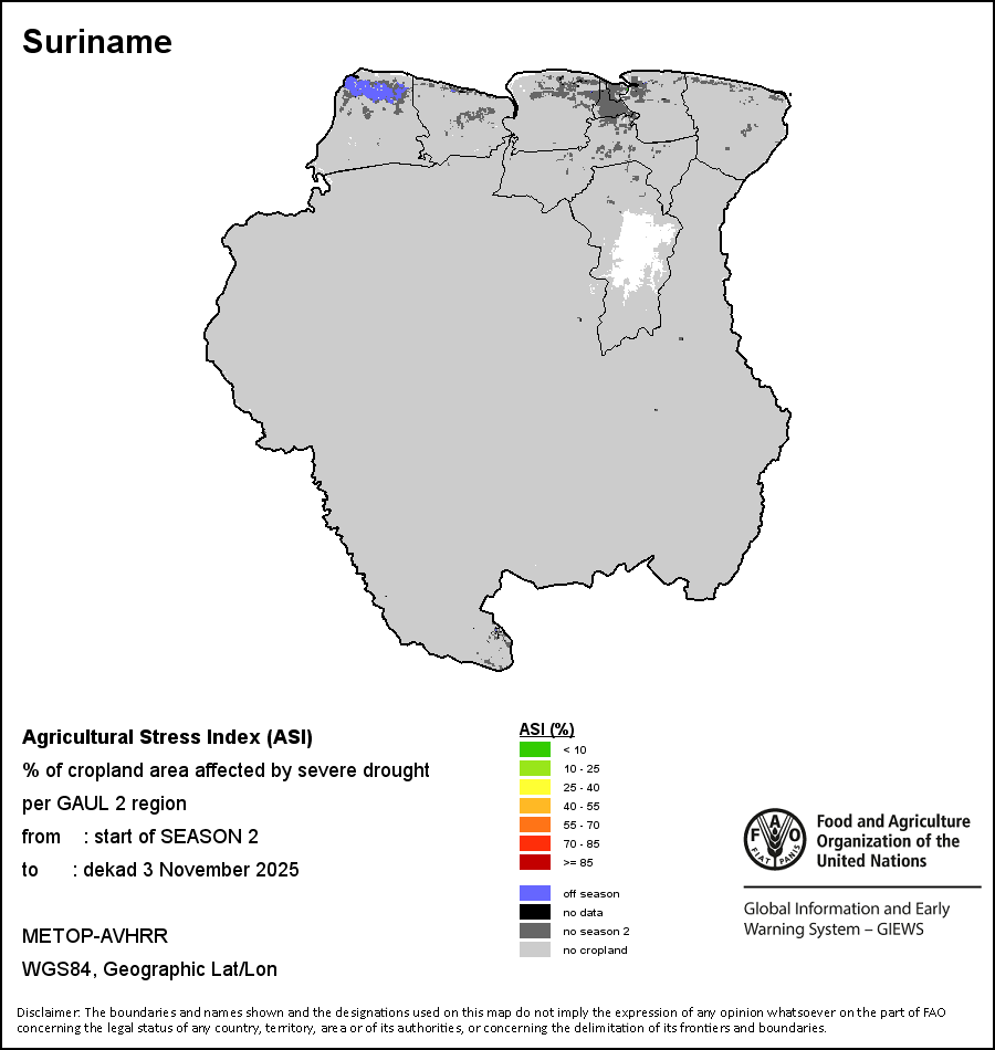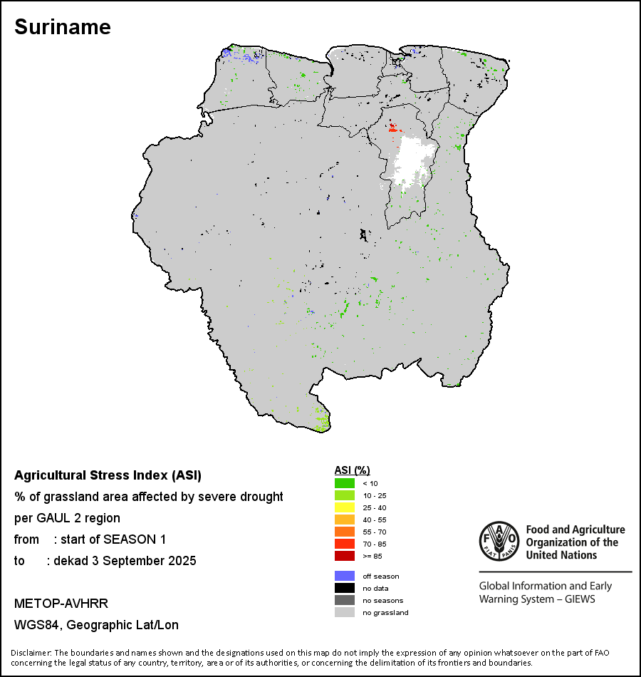 The Agricultural Stress Index (ASI) is a quick-look indicator that facilitates the early identification of cropped land with a high likelihood of water stress (drought). The Index is based on the integration of the Vegetation Health Index (VHI) in two dimensions that are critical in the assessment of a drought event in agriculture: temporal and spatial. The first step of the ASI calculation is a temporal averaging of the VHI, assessing the intensity and duration of dry periods occurring during the crop cycle at the pixel level; this calculation includes the use of crop coefficients, which introduces sensitivity of a crop to water stress during each phenological phase. The second step determines the spatial extent of drought events by calculating the percentage of pixels in arable areas with a VHI value below 35 percent (this value was identified as a critical threshold in assessing the extent of drought in previous research by Kogan, 1995). Each administrative area is classified according to the percentage of the affected area to facilitate the quick interpretation of results.