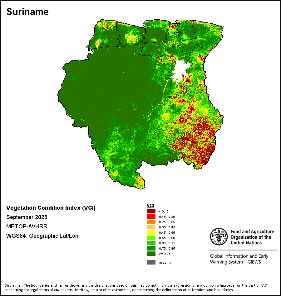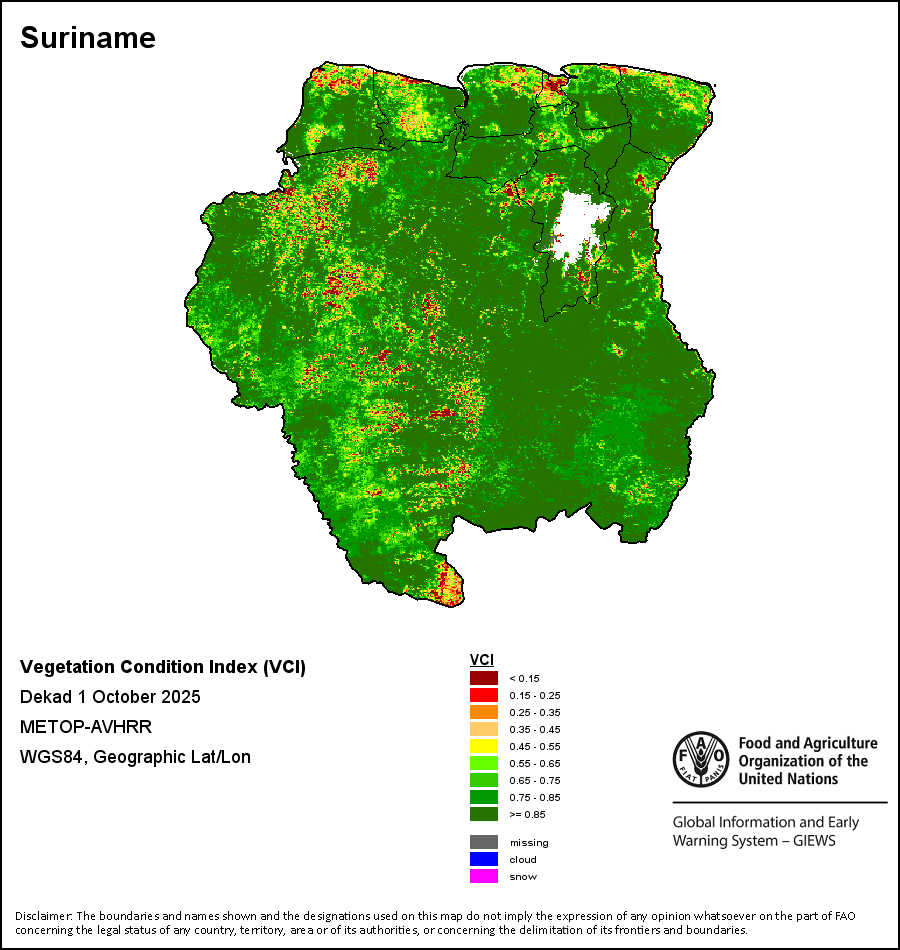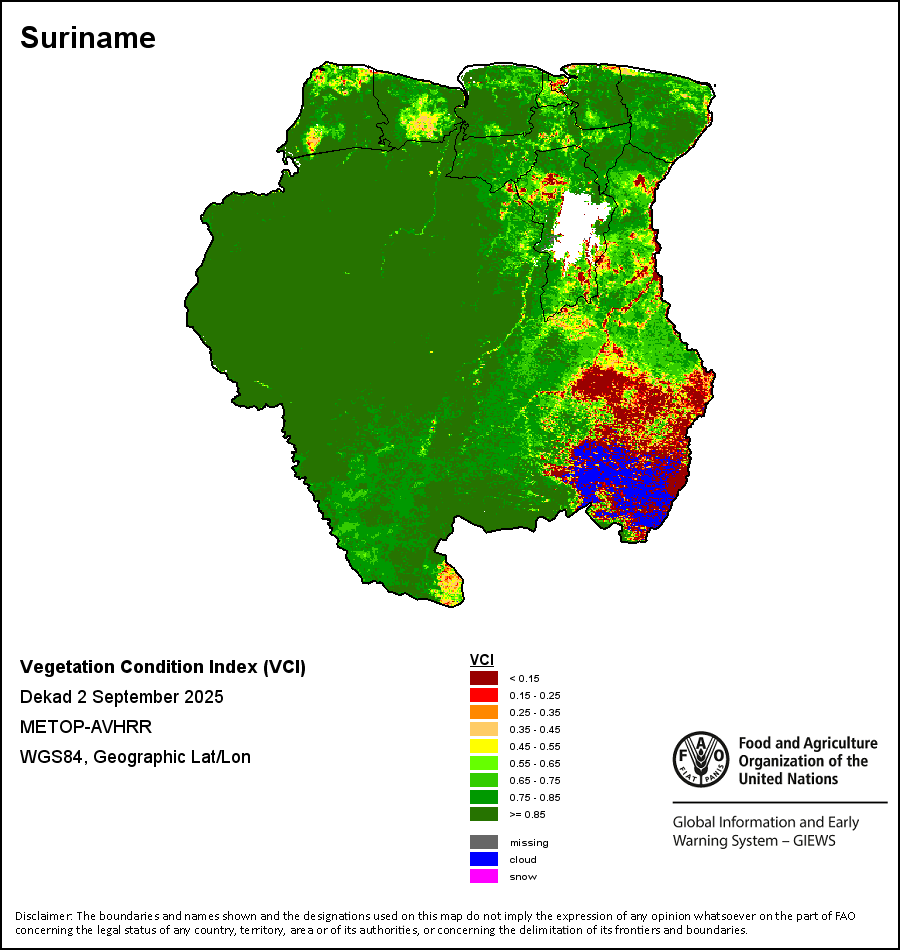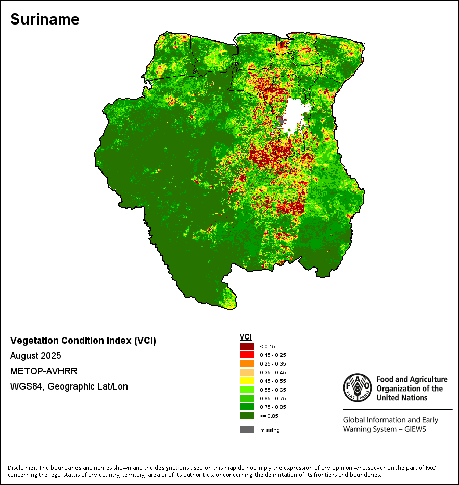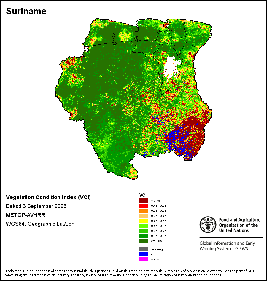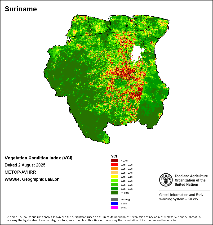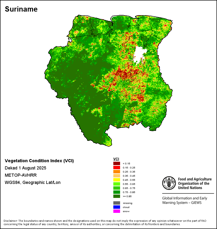 The Vegetation Condition Index (VCI) evaluates the current vegetation health in comparison to the historical trends. The VCI relates current dekadal Normalized Difference Vegetation Index (NDVI) to its long-term minimum and maximum, normalized by the historical range of NDVI values for the same dekad. The VCI was designed to separate the weather-related component of the NDVI from the ecological element.