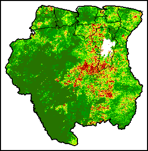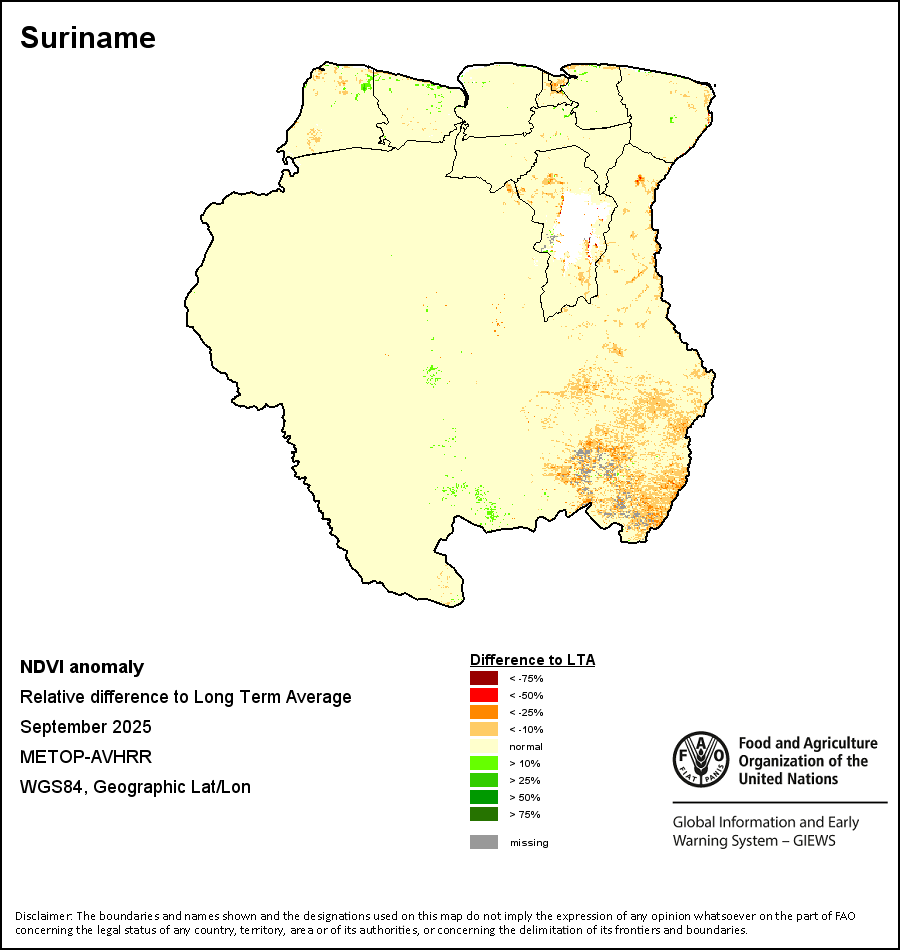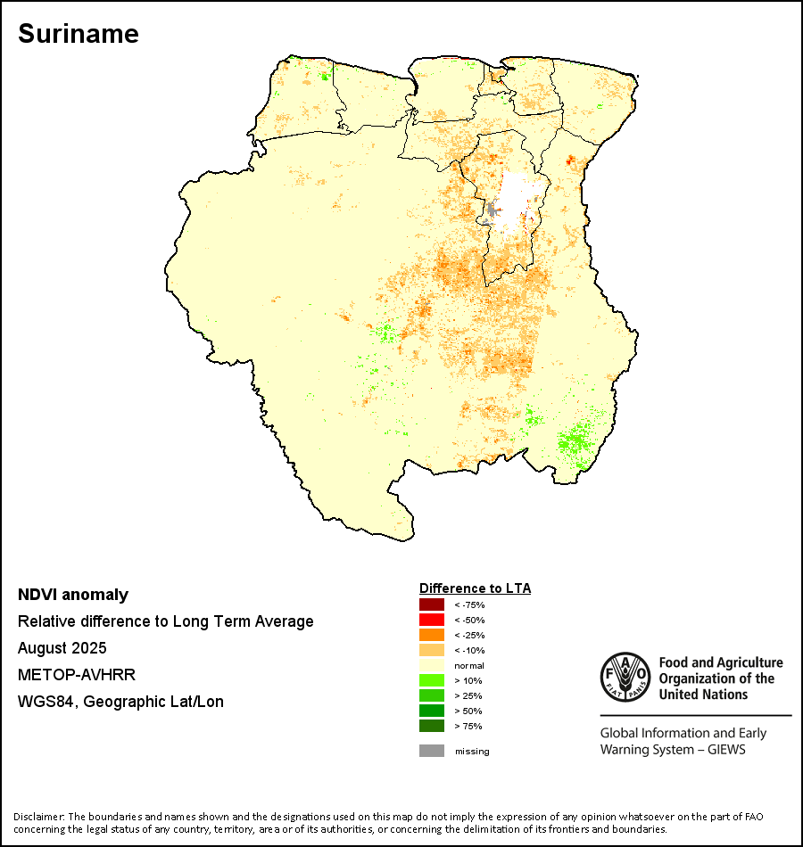 The Normalized Difference Vegetation Index (NDVI) measures the “greenness” of ground cover and is used as a proxy to indicate the density and health of vegetation. NDVI values range from +1 to -1, with high positive values corresponding to dense and healthy vegetation, and low and/or negative NDVI values indicating poor vegetation conditions or sparse vegetative cover. The NDVI anomaly indicates the variation of the current dekad to the long-term average, where a positive value (for example 20 percent) would signify enhanced vegetation conditions compared to the average, while a negative value (for instance -40 percent) would indicate comparatively poor vegetation conditions.