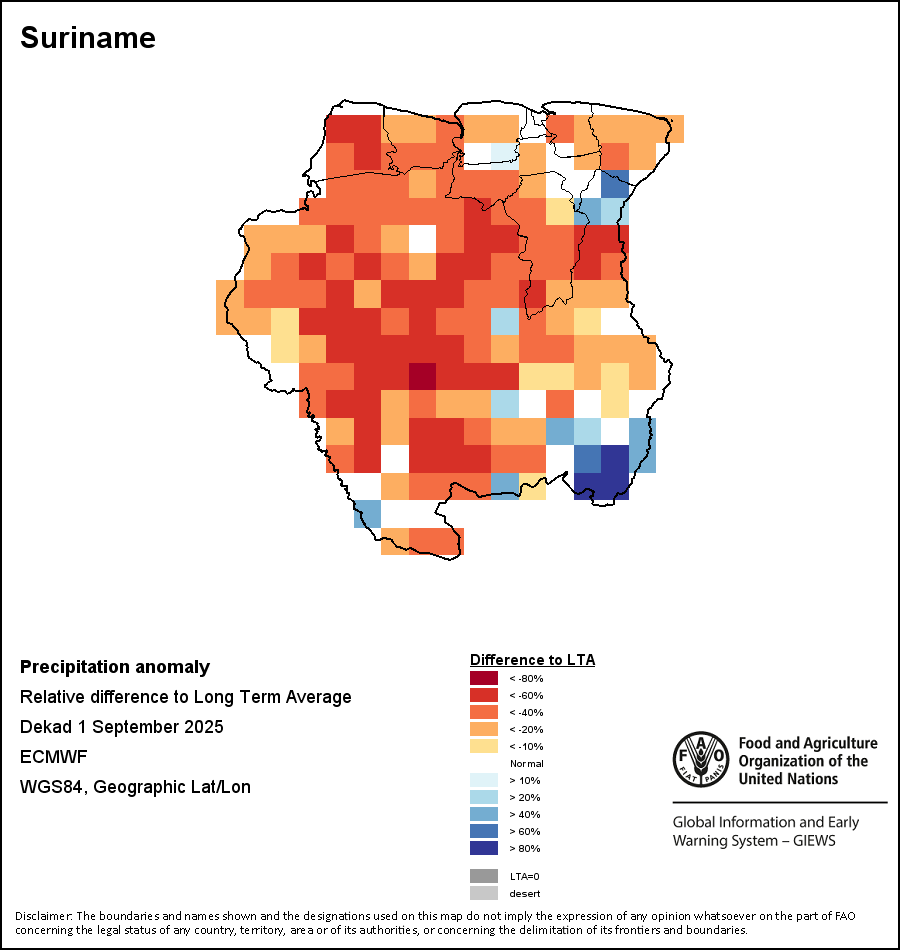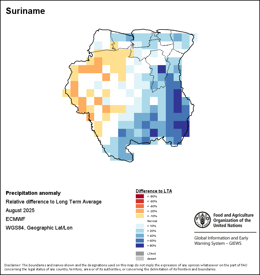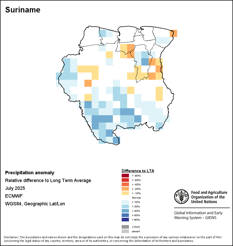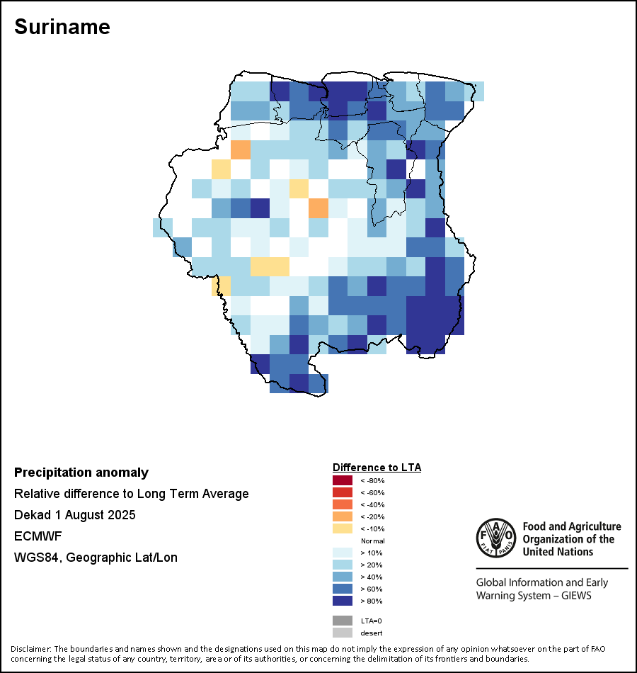 The map illustrates the difference between the current rainfall volume and the average level. Rainfall levels are compared with the Long-Term Average (LTA), which refers to the period 1989-2015. Warmer colours identify areas which have received lower-than-average rainfall, while colder colours are given to areas where precipitation has been above average.