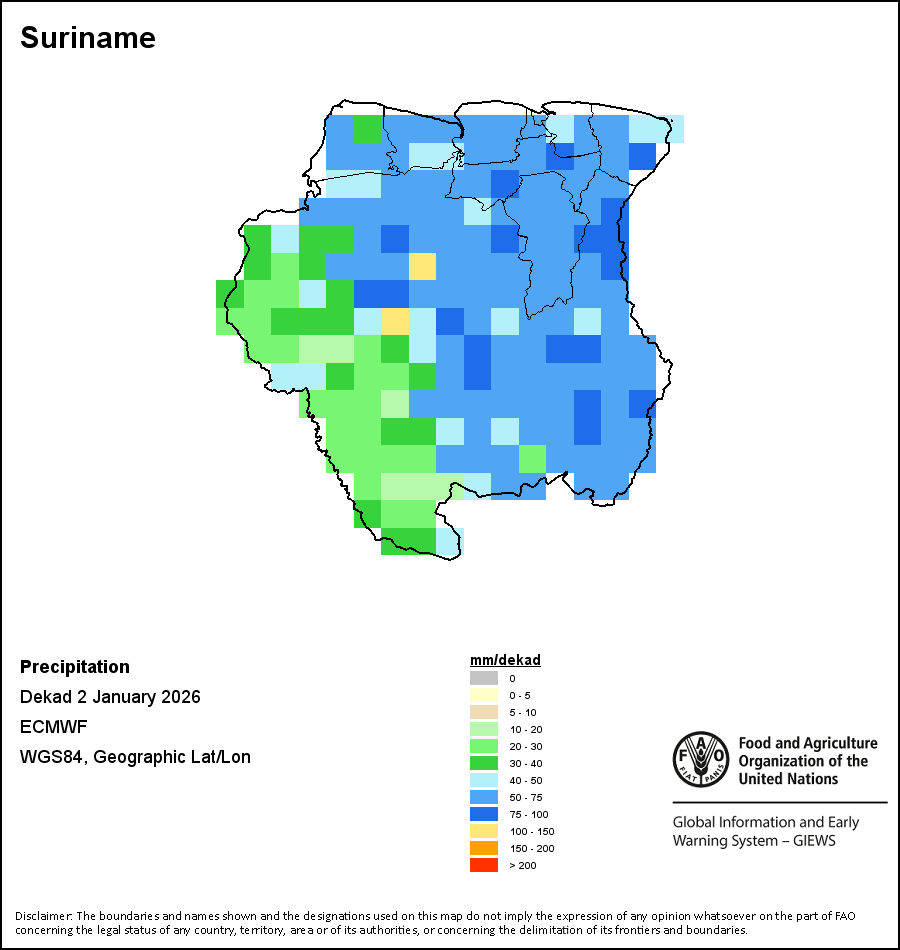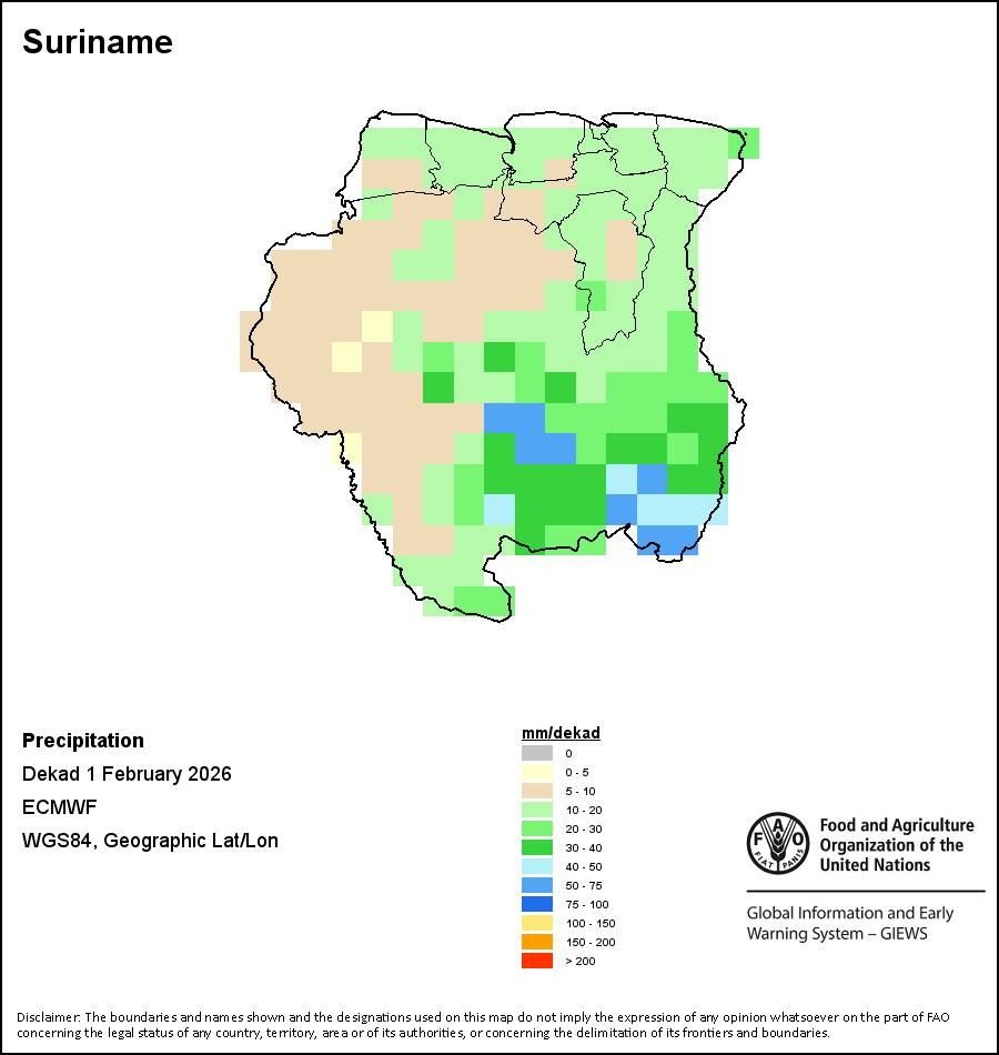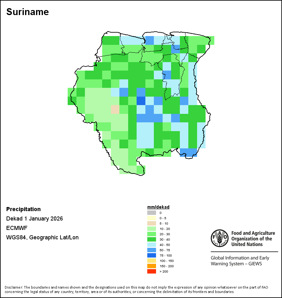 Los mapas y gráficos nacionales representan el último periodo de 36 meses de los indicadores estacionales, de vegetación y de precipitación. Los datos se presentan por periodos de 10 días y por meses. Los tres indicadores de vegetación se basan en datos de vegetación registrados cada diez días por el sensor METOP-AVHRR con una resolución de 1km (2007 y posterior). Los datos con una resolución de 1km del período 1984-2006 se extrapolaron a partir del conjunto de datos NOAA-AVHRR con 16km de resolución. Las estimaciones de precipitación de todos los países africanos (excepto Cabo Verde y Mauricio) se obtienen de NOAA/FEWSNet (16km de resolución), mientras que para los restantes países los datos se obtienen Centro Europeo de Predicción Meteorológica a Plazo Medio (ECMWF siglas en Inglés, 25km de resolución). Debido a la mayor resolución de los indicadores de vegetación (p.ej., NDVI, VHI) en comparación con los indicadores de precipitación de resolución más gruesa, el número de unidades subnacionales para las que se pueden generar estadísticas zonales válidas para los índices de vegetación es mayor que el número de unidades para los indicadores de precipitación en algunos países.