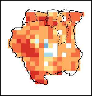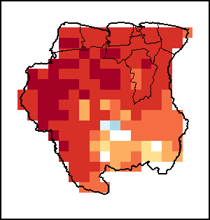 El Índice Normalizado Diferencial de la Vegetación (NDVI, por sus siglas en inglés) mide el “verdor” de la cubierta vegetal, y se utiliza como indicador de la densidad y salud de la vegetación. Los valores del NDVI oscilan entre +1 y -1. Los valores positivos elevados corresponden a vegetación densa y saludable, mientras que los valores bajos y/o negativos reflejan condiciones deficientes de vegetación o cubierta vegetal escasa. La anomalía del NDVI representa la variación del periodo actual de 10 días con respecto al valor medio a largo plazo. Un valor positivo (por ejemplo, 20 por ciento) implicaría mejores condiciones de vegetación con respecto a la media, mientras que un valor negativo (por ejemplo, -40 por ciento) indicaría condiciones de vegetación comparativamente peores.
