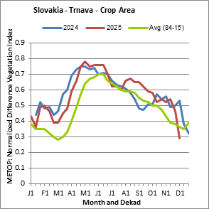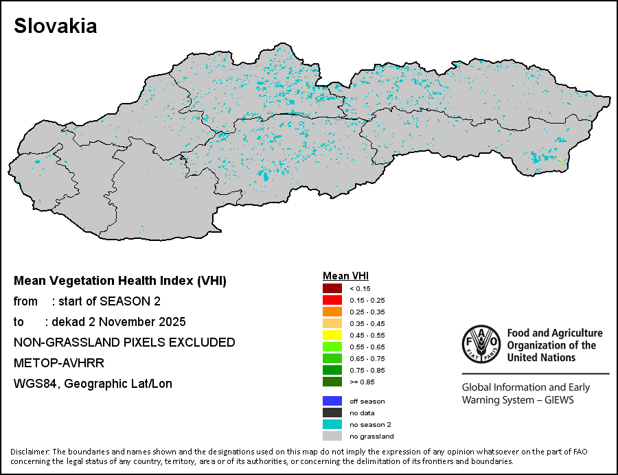 The Weighted Mean Vegetation Health Index (Weighted Mean VHI) allows the user to assess the severity of the drought from the start of the growing season, examining the vegetation health and the influence of temperature on plant conditions. The Mean VHI is an average of the dekadal VHI values over the crop growing season (from the start until the last dekad of analysis), weighted by crop coefficients (Kc), assigned to VHI values at the dekads corresponding to the Start of the Season (SOS), Maximum of the Season (MOS) and End of the Season (EOS). Crop coefficient is applied for the purpose of reflecting the crop’s water sensitivity at different phenology stages.