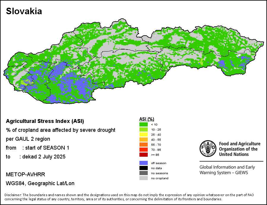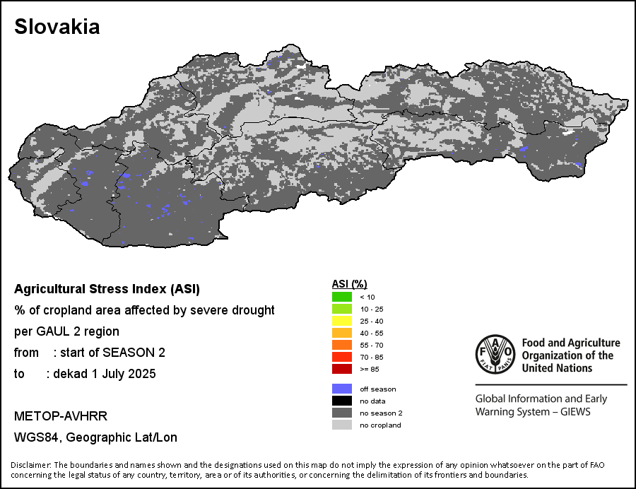 农业干旱胁迫指数(ASI)是一项速览指数,有助于在早期甄别较大可能发生水胁迫(干旱)的耕地。 该指数通过整合植被健康指数(VHI)在评估农业旱情方面具有关键意义的两个维度,即时间和空间维度,而得出。计算农业干旱胁迫指数的第一步是求植被健康指数的时间平均值,对作物周期内旱情的强度和时长进行像素级评估;这项计算包括采用作物系数衡量某种作物在各物候阶段对干旱胁迫的敏感度。第二步是确定旱情的空间广度,方法是计算植被健康指数值低于35%(Kogan前期研究将这一数值确定为评估干旱程度的临界值,1995年)的耕地的像素百分比。然后把各个行政区域根据受影响面积的百分比进行划分,便于对结果进行快速解读。