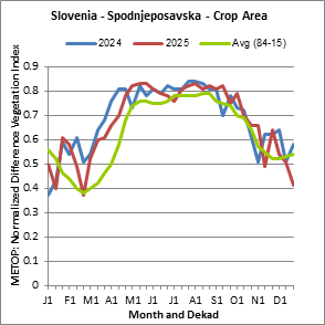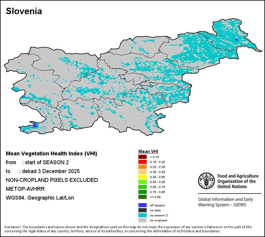 The Weighted Mean Vegetation Health Index (Weighted Mean VHI) allows the user to assess the severity of the drought from the start of the growing season, examining the vegetation health and the influence of temperature on plant conditions. The Mean VHI is an average of the dekadal VHI values over the crop growing season (from the start until the last dekad of analysis), weighted by crop coefficients (Kc), assigned to VHI values at the dekads corresponding to the Start of the Season (SOS), Maximum of the Season (MOS) and End of the Season (EOS). Crop coefficient is applied for the purpose of reflecting the crop’s water sensitivity at different phenology stages.