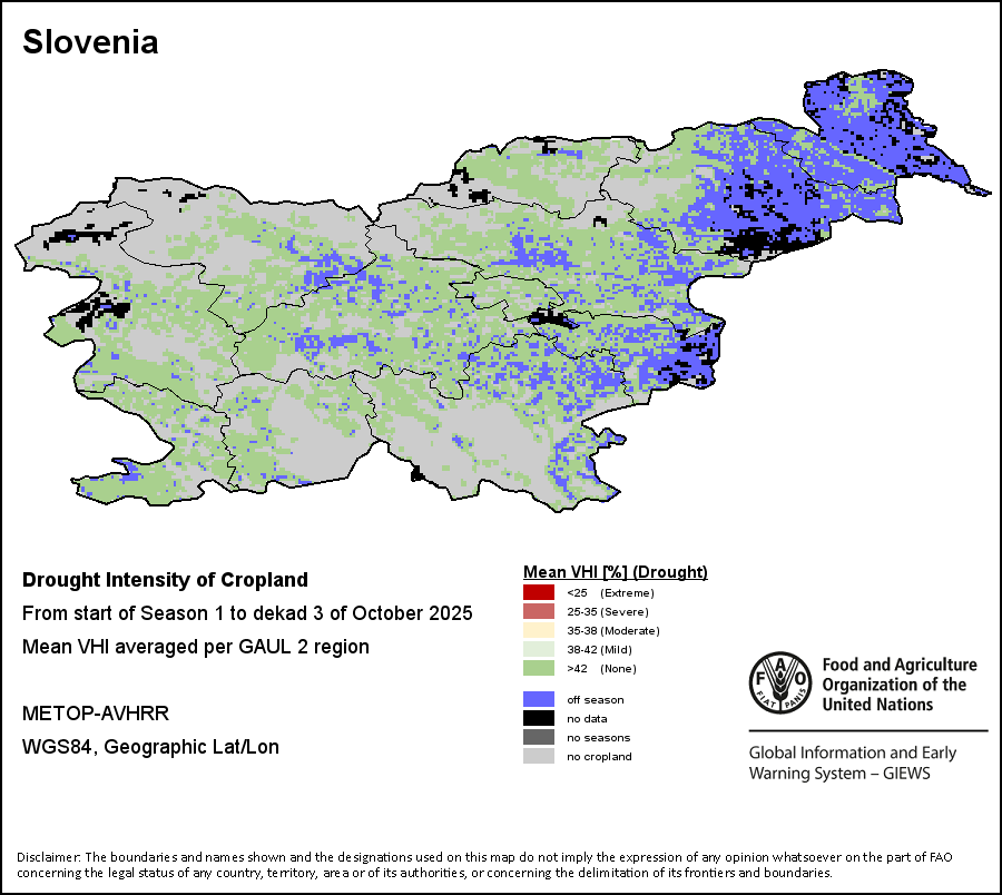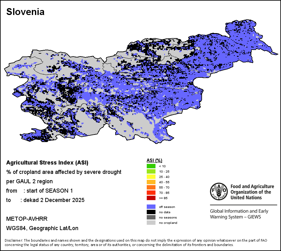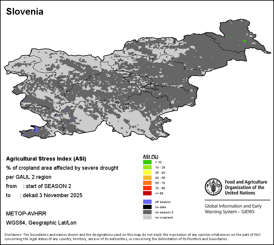 The Agricultural Stress Index (ASI) is a quick-look indicator that facilitates the early identification of cropped land with a high likelihood of water stress (drought). The Index is based on the integration of the Vegetation Health Index (VHI) in two dimensions that are critical in the assessment of a drought event in agriculture: temporal and spatial. The first step of the ASI calculation is a temporal averaging of the VHI, assessing the intensity and duration of dry periods occurring during the crop cycle at the pixel level; this calculation includes the use of crop coefficients, which introduces sensitivity of a crop to water stress during each phenological phase. The second step determines the spatial extent of drought events by calculating the percentage of pixels in arable areas with a VHI value below 35 percent (this value was identified as a critical threshold in assessing the extent of drought in previous research by Kogan, 1995). Each administrative area is classified according to the percentage of the affected area to facilitate the quick interpretation of results.