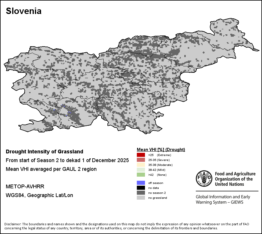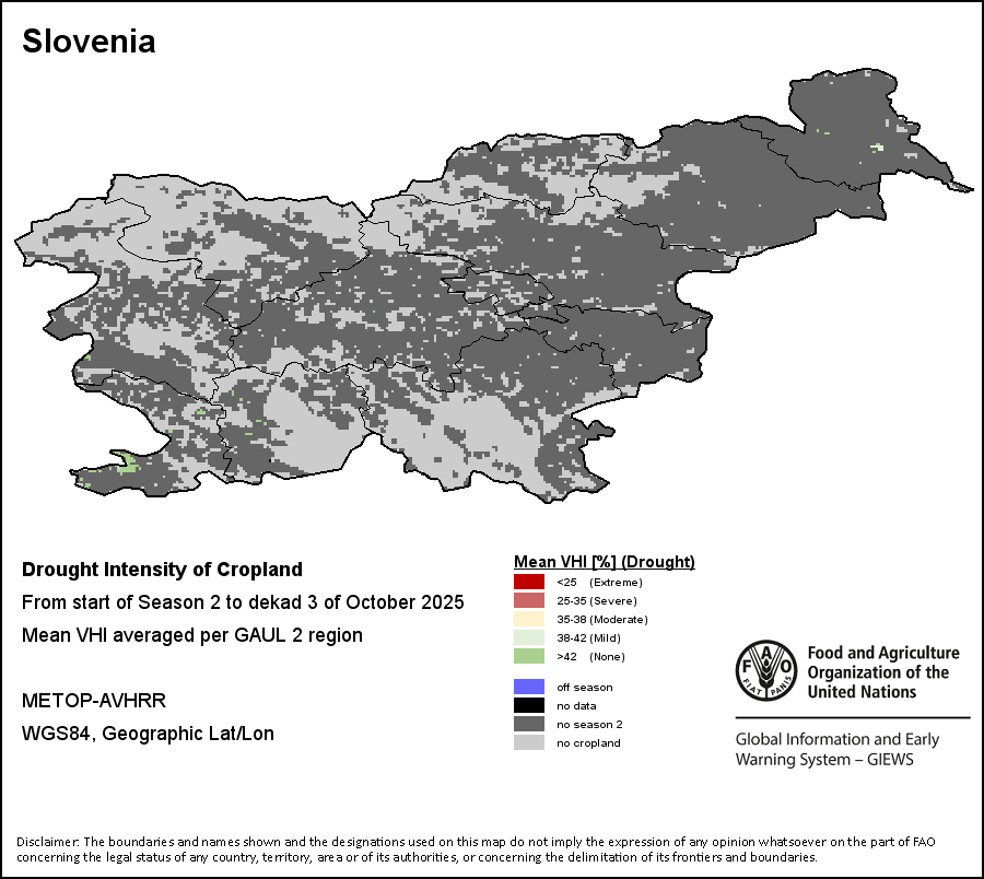 Agricultural droughts are classified by their intensity and are categorized into four classes: Extreme, Severe, Moderate or Mild. The intensity of the drought is calculated through the Weighted Mean Vegetation Health Index aggregated per GAUL 2 region, indicating that the poorer the vegetation health the more severe the drought.
