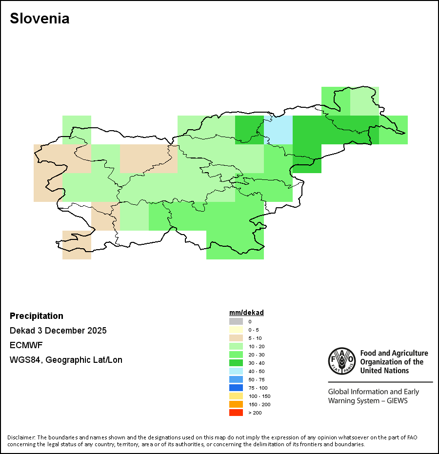 The map depicts cumulative rainfall volumes over a dekad (a 10-day period). Precipitation estimates for all African countries (except Cabo Verde and Mauritius) are taken from NOAA/FEWSNet, while for the remaining countries data is obtained from ECMWF.