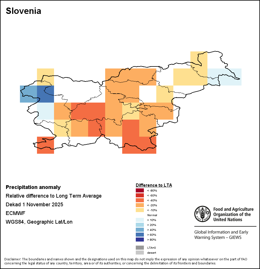 The map illustrates the difference between the current rainfall volume and the average level. Rainfall levels are compared with the Long-Term Average (LTA), which refers to the period 1989-2015. Warmer colours identify areas which have received lower-than-average rainfall, while colder colours are given to areas where precipitation has been above average.