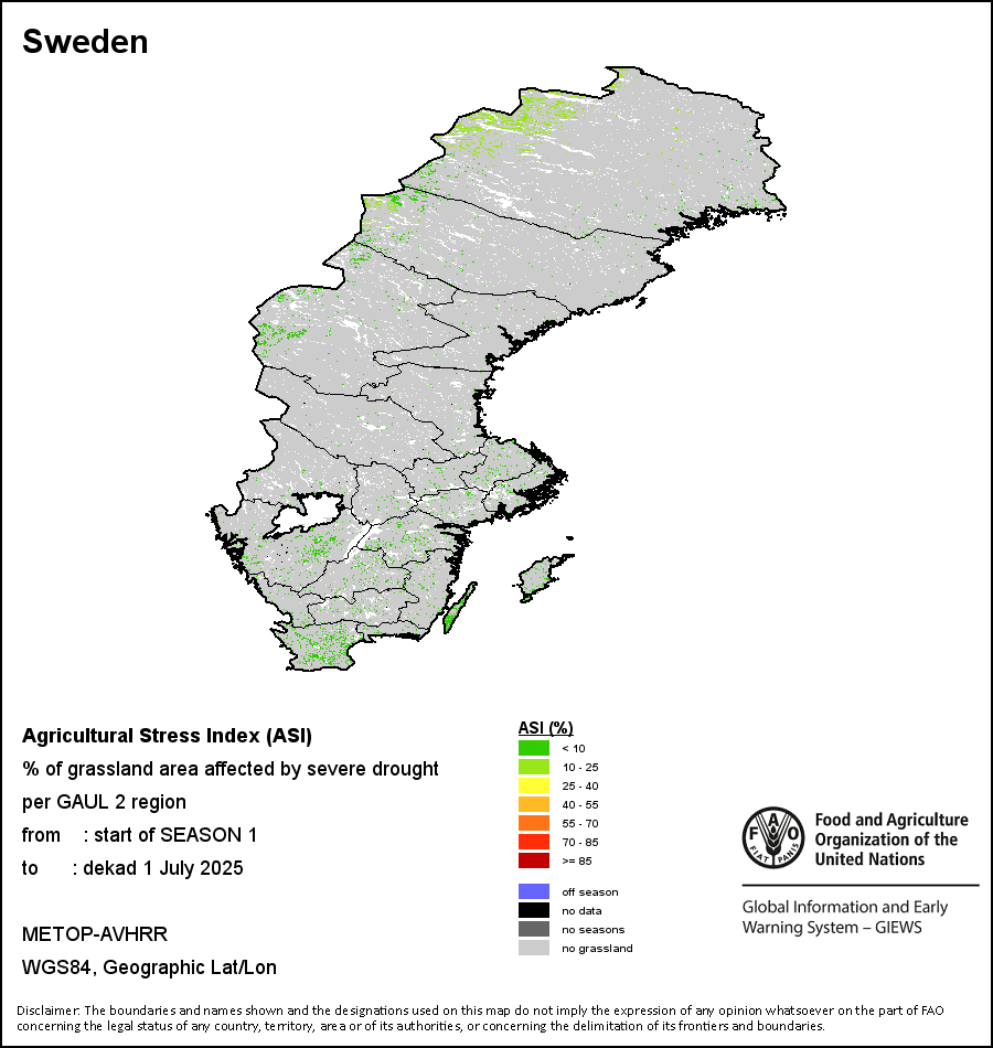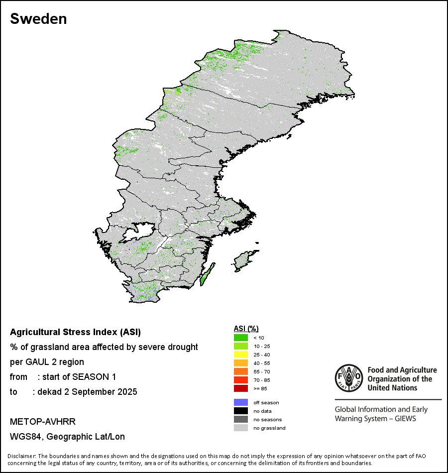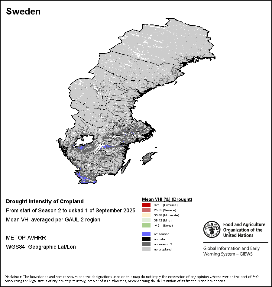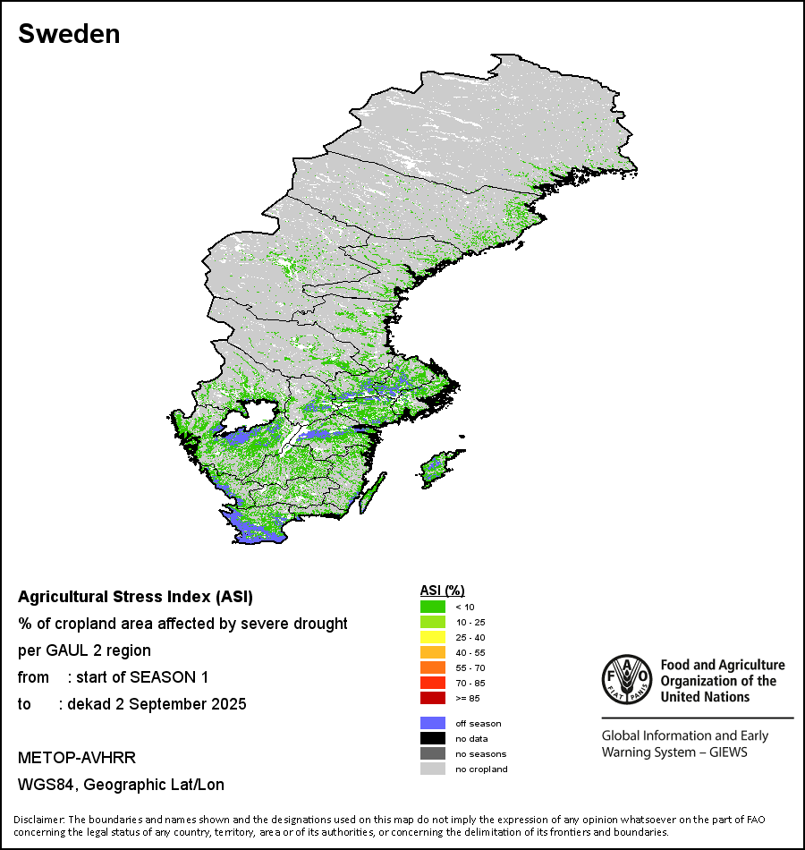 تصور الخرائط تكرار موجات الجفاف الشديدة في المناطق التي (1) تضررت فيها نسبة 30 في المائة من الأراضي المزروعة بالمحاصيل؛ أو (2) نسبة 50 في المائة من الأراضي المزروعة بالمحاصيل. يعتمد تكرار موجات الجفاف الشديدة عبر التاريخ بالكامل (بحسب تعريف مؤشر الإجهاد الزراعي) على تسلسل عدد مراته (1984-2024).
