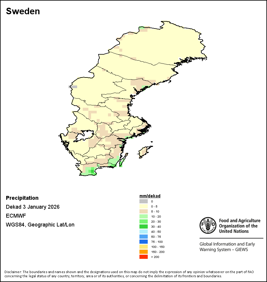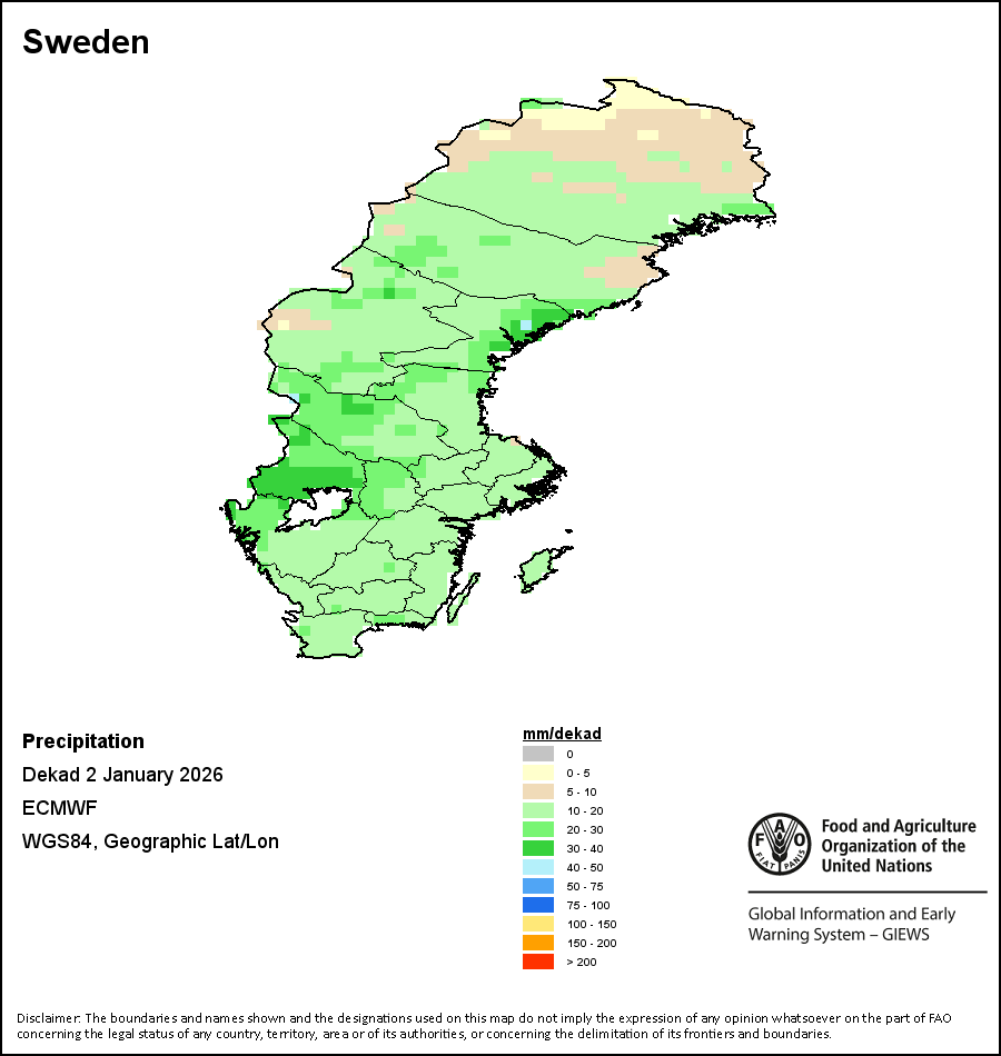 Los mapas y gráficos nacionales representan el último periodo de 36 meses de los indicadores estacionales, de vegetación y de precipitación. Los datos se presentan por periodos de 10 días y por meses. Los tres indicadores de vegetación se basan en datos de vegetación registrados cada diez días por el sensor METOP-AVHRR con una resolución de 1km (2007 y posterior). Los datos con una resolución de 1km del período 1984-2006 se extrapolaron a partir del conjunto de datos NOAA-AVHRR con 16km de resolución. Las estimaciones de precipitación de todos los países africanos (excepto Cabo Verde y Mauricio) se obtienen de NOAA/FEWSNet (16km de resolución), mientras que para los restantes países los datos se obtienen Centro Europeo de Predicción Meteorológica a Plazo Medio (ECMWF siglas en Inglés, 25km de resolución). Debido a la mayor resolución de los indicadores de vegetación (p.ej., NDVI, VHI) en comparación con los indicadores de precipitación de resolución más gruesa, el número de unidades subnacionales para las que se pueden generar estadísticas zonales válidas para los índices de vegetación es mayor que el número de unidades para los indicadores de precipitación en algunos países.