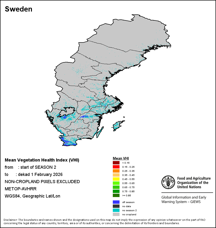 L'indicateur de santé de la végétation (VHI – Vegetation Health Index) illustre la gravité des sécheresses en se fondant sur l'état de la végétation et l'influence des températures sur les conditions des plantes. Le VHI est un indice composite et l'indicateur primaire utilisé pour calculer l’ASI. Les composantes du VHI (VCI et TCI) reçoivent la même pondération dans le calcul de l'indice. Il combine à la fois le VCI et l'Indice des conditions de température (TCI – Temperature Condition Index). Le TCI est calculé à l’aide d’une équation similaire au VCI, mais rapporte les températures actuelles à leur maximum et minimum à long terme, en supposant qu’une élévation des températures tend à provoquer une détérioration des conditions de la végétation. Une diminution du VHI indique, par exemple, un état de la végétation relativement mauvais et une augmentation des températures, ce qui signifie que les conditions de végétation sont soumises à un stress, voire une sécheresse sur une période longue. Les données du VHI sont calculées pour les deux principales campagnes et sous trois formes: décadaires, mensuelles et annuelles.
