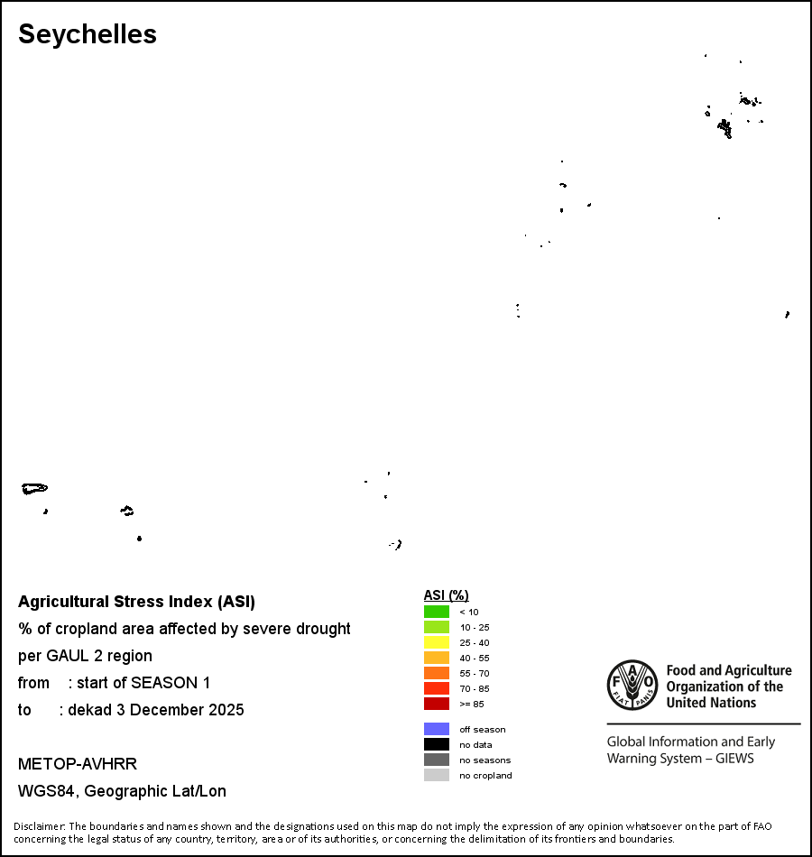 The Agricultural Stress Index (ASI) is a quick-look indicator that facilitates the early identification of cropped land with a high likelihood of water stress (drought). The Index is based on the integration of the Vegetation Health Index (VHI) in two dimensions that are critical in the assessment of a drought event in agriculture: temporal and spatial. The first step of the ASI calculation is a temporal averaging of the VHI, assessing the intensity and duration of dry periods occurring during the crop cycle at the pixel level; this calculation includes the use of crop coefficients, which introduces sensitivity of a crop to water stress during each phenological phase. The second step determines the spatial extent of drought events by calculating the percentage of pixels in arable areas with a VHI value below 35 percent (this value was identified as a critical threshold in assessing the extent of drought in previous research by Kogan, 1995). Each administrative area is classified according to the percentage of the affected area to facilitate the quick interpretation of results.