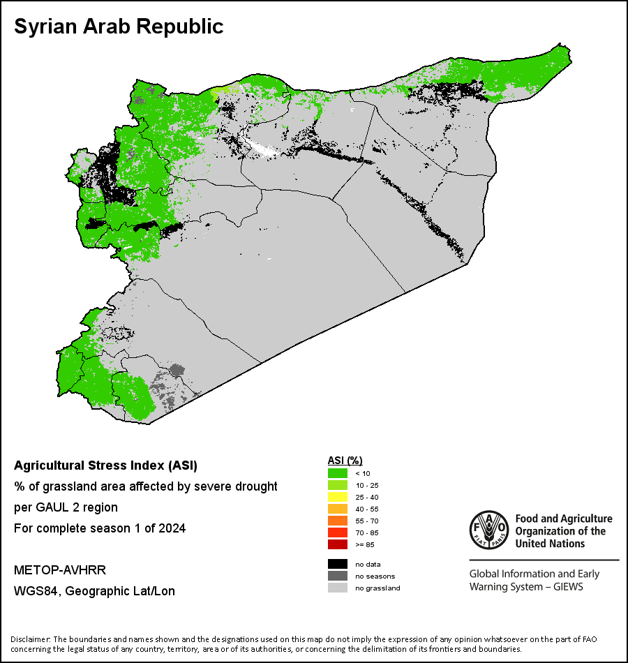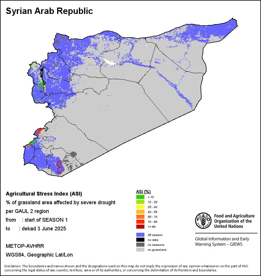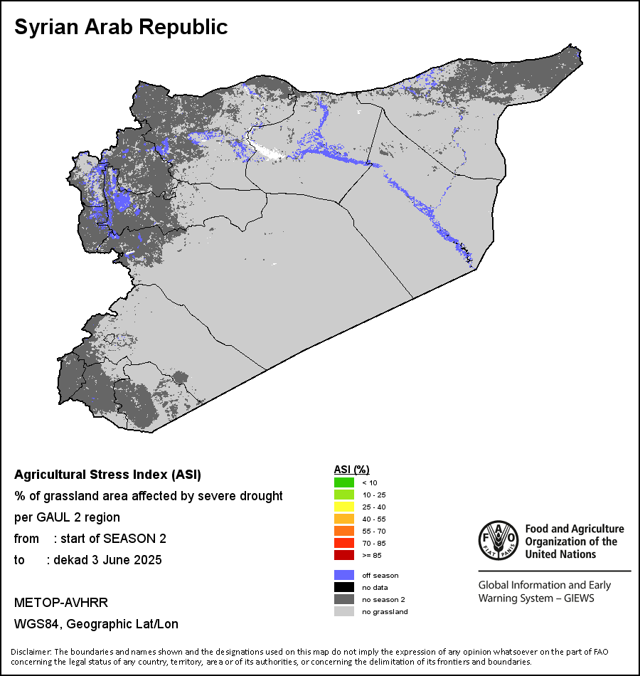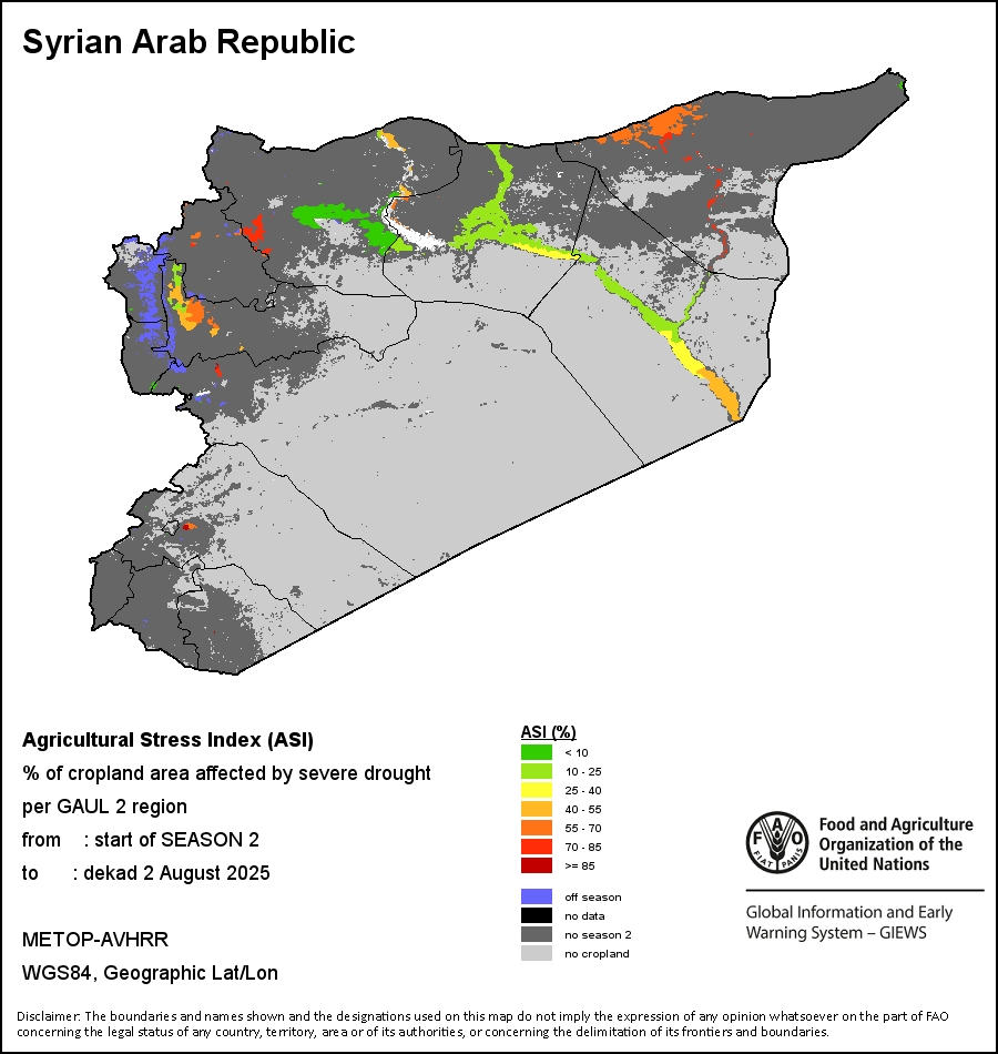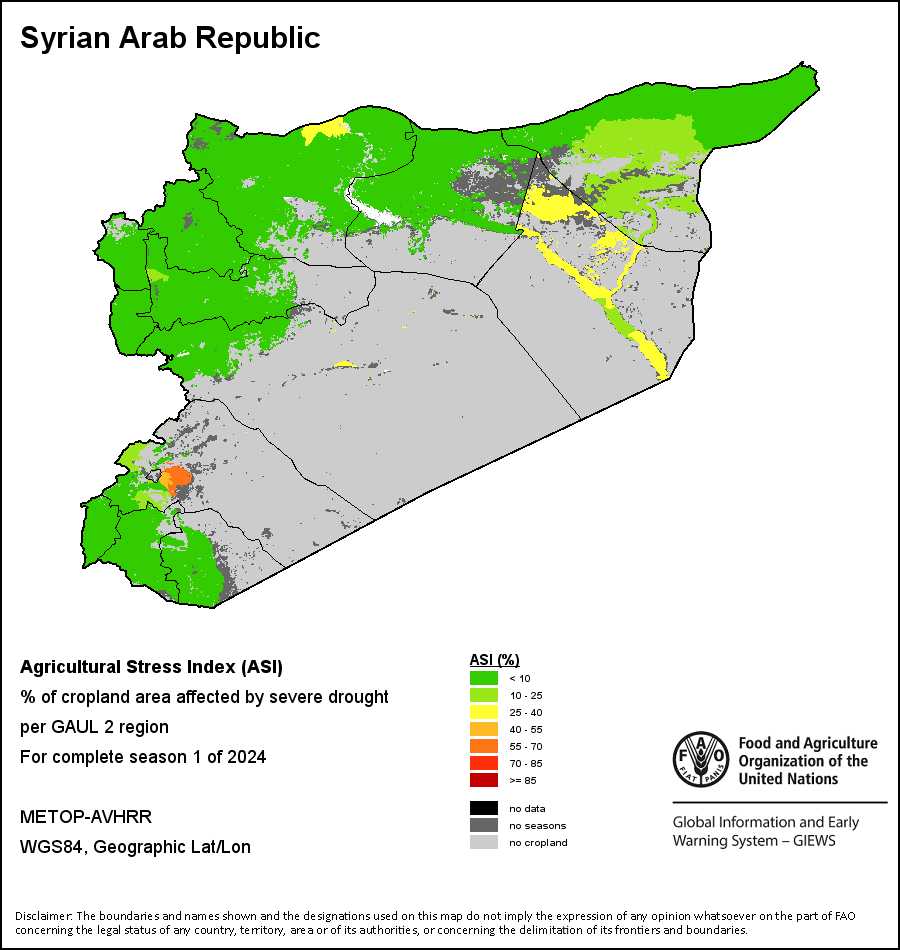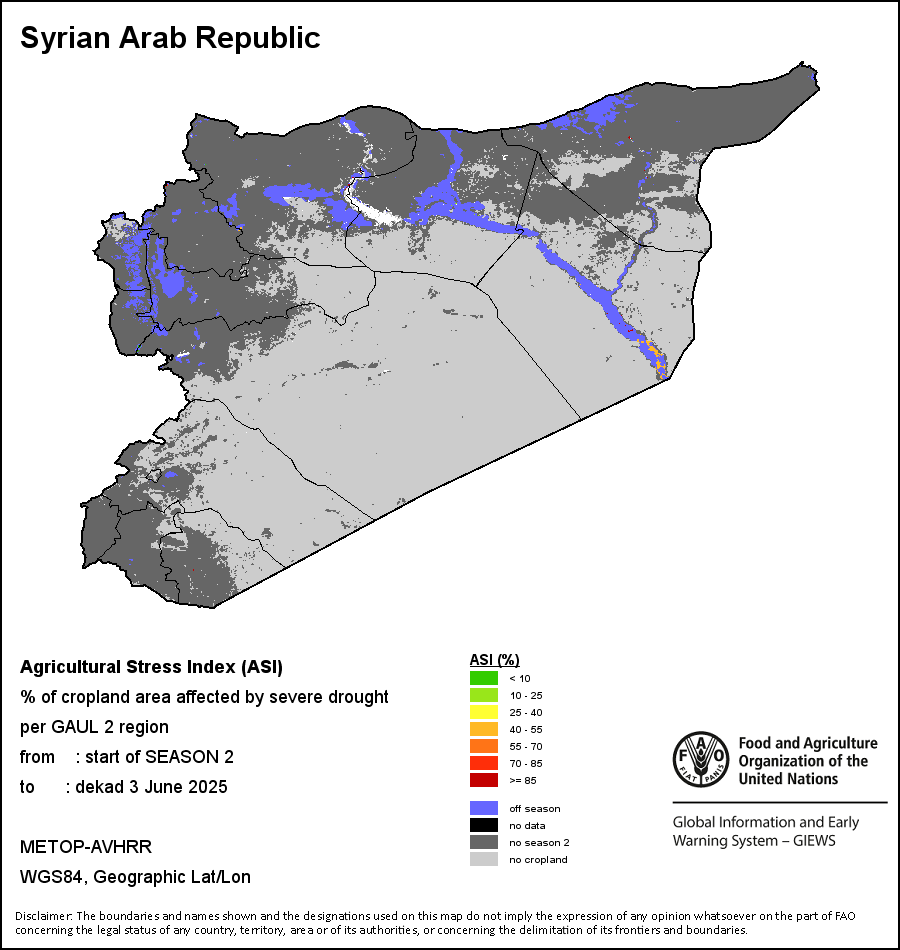 The Agricultural Stress Index (ASI) is a quick-look indicator that facilitates the early identification of cropped land with a high likelihood of water stress (drought). The Index is based on the integration of the Vegetation Health Index (VHI) in two dimensions that are critical in the assessment of a drought event in agriculture: temporal and spatial. The first step of the ASI calculation is a temporal averaging of the VHI, assessing the intensity and duration of dry periods occurring during the crop cycle at the pixel level; this calculation includes the use of crop coefficients, which introduces sensitivity of a crop to water stress during each phenological phase. The second step determines the spatial extent of drought events by calculating the percentage of pixels in arable areas with a VHI value below 35 percent (this value was identified as a critical threshold in assessing the extent of drought in previous research by Kogan, 1995). Each administrative area is classified according to the percentage of the affected area to facilitate the quick interpretation of results.