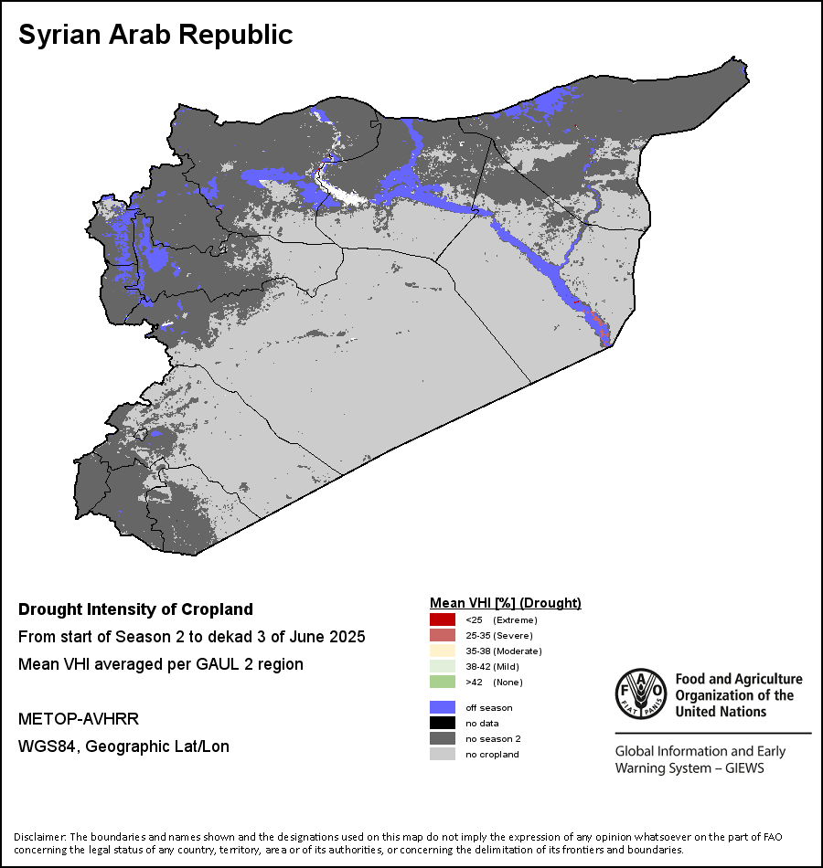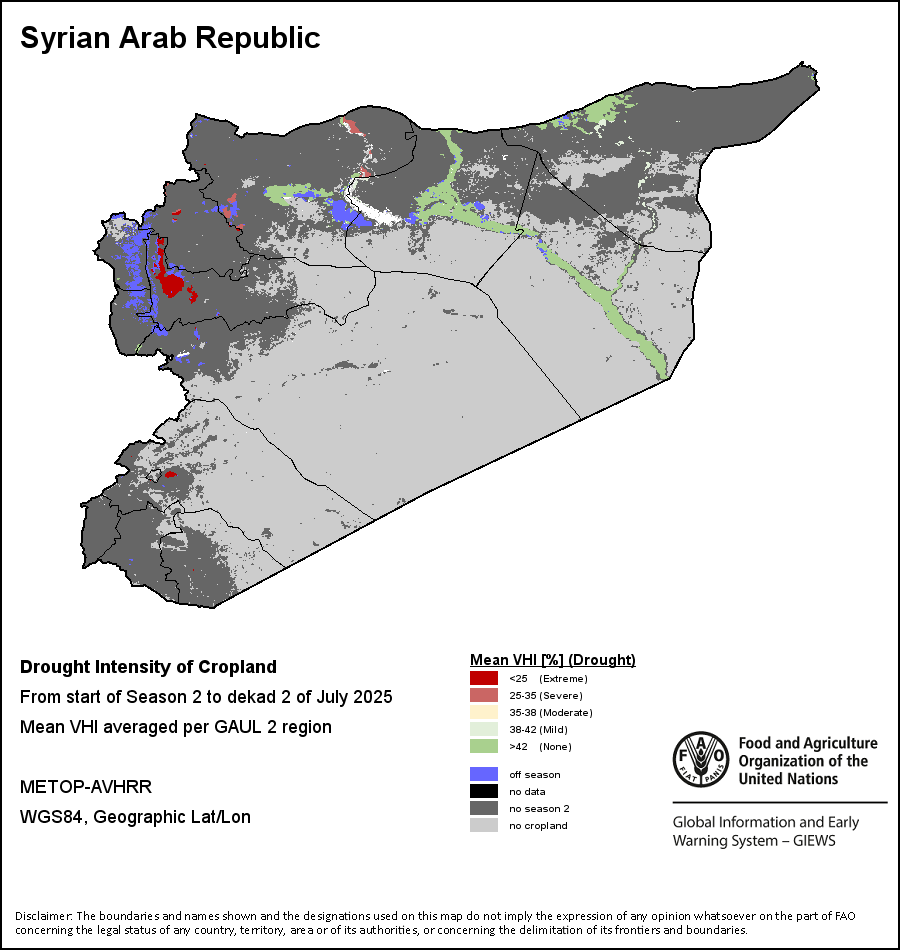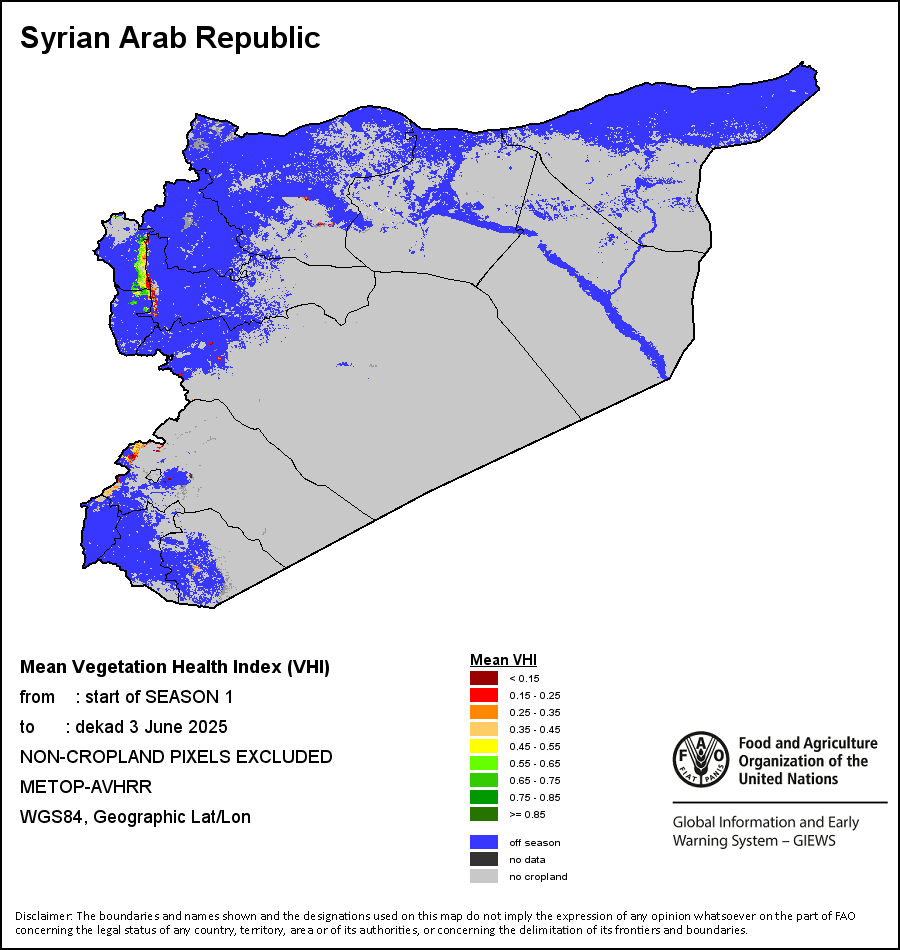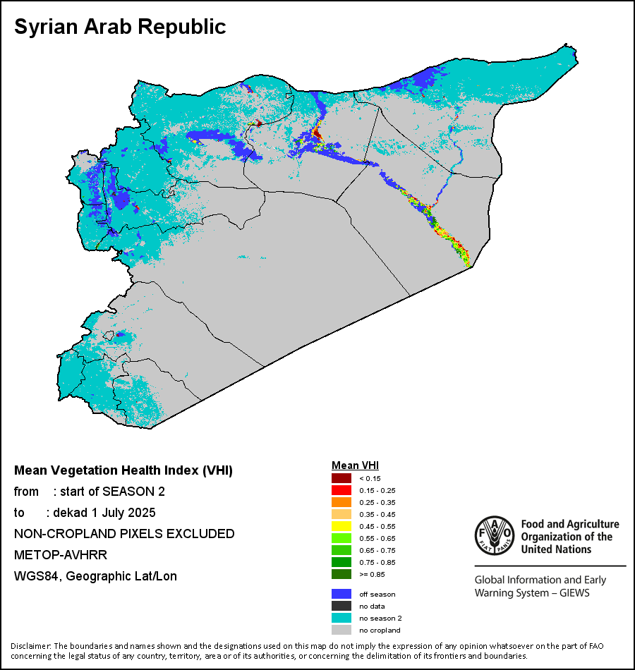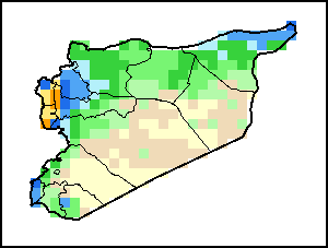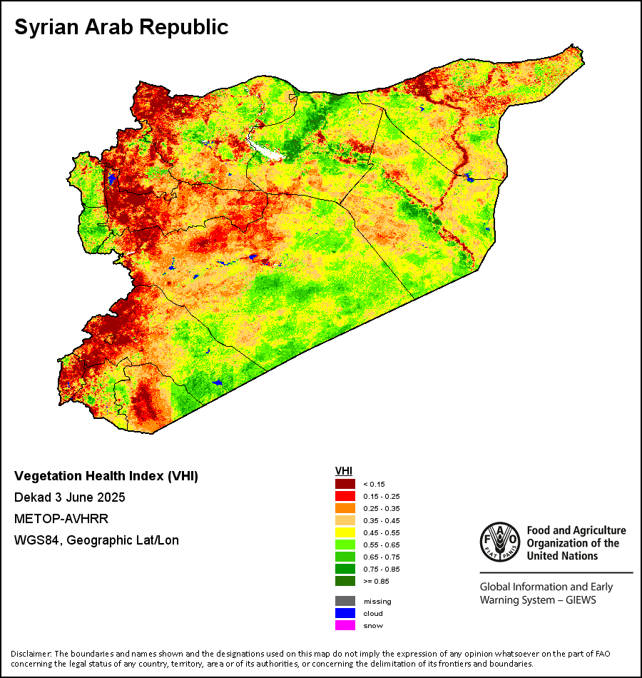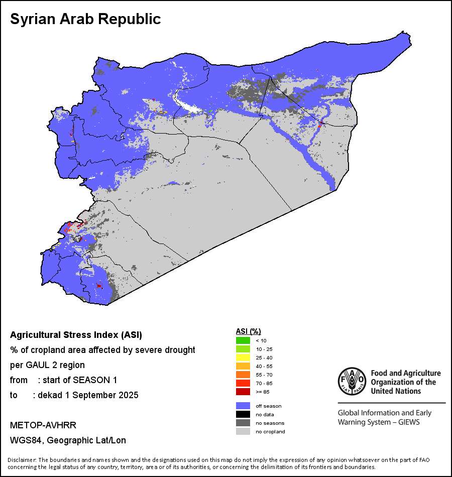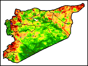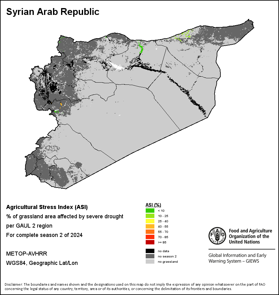 The Agricultural Stress Index (ASI) is a quick-look indicator that facilitates the early identification of cropped land with a high likelihood of water stress (drought). The Index is based on the integration of the Vegetation Health Index (VHI) in two dimensions that are critical in the assessment of a drought event in agriculture: temporal and spatial. The first step of the ASI calculation is a temporal averaging of the VHI, assessing the intensity and duration of dry periods occurring during the crop cycle at the pixel level; this calculation includes the use of crop coefficients, which introduces sensitivity of a crop to water stress during each phenological phase. The second step determines the spatial extent of drought events by calculating the percentage of pixels in arable areas with a VHI value below 35 percent (this value was identified as a critical threshold in assessing the extent of drought in previous research by Kogan, 1995). Each administrative area is classified according to the percentage of the affected area to facilitate the quick interpretation of results.