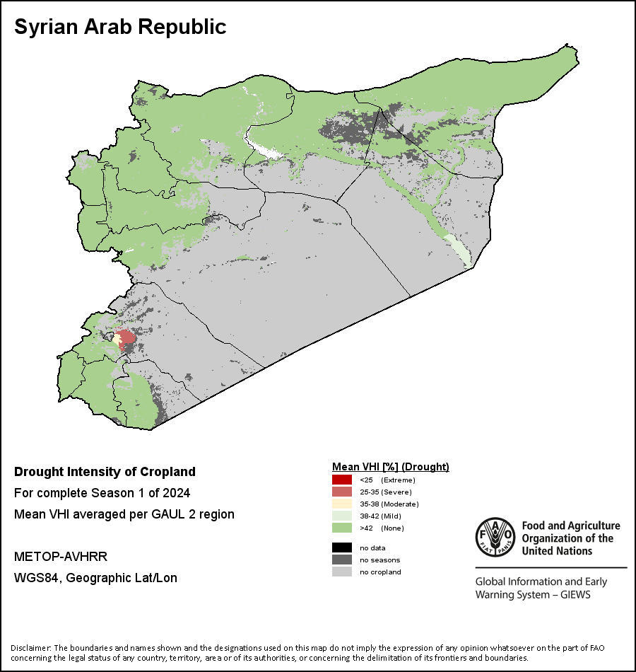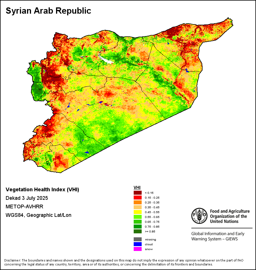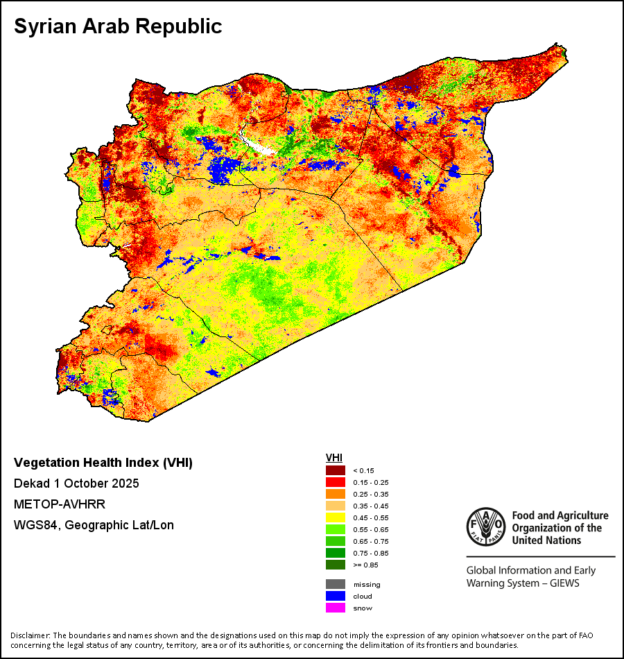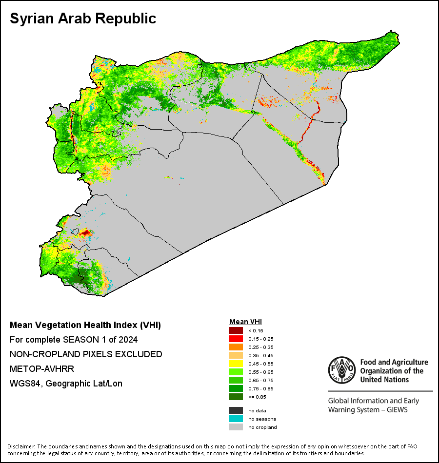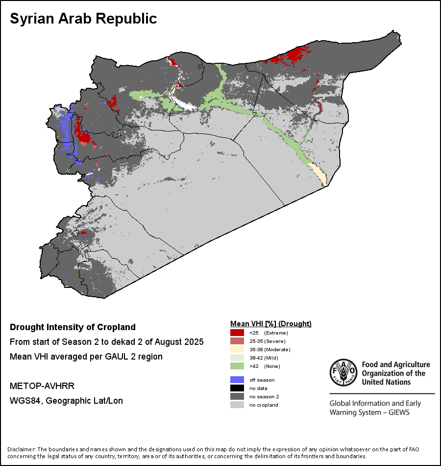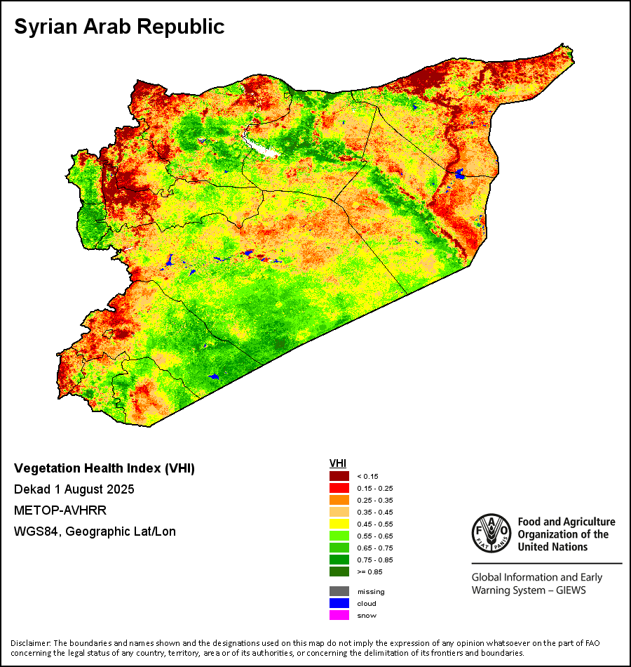 The Agricultural Stress Index (ASI) is a quick-look indicator that facilitates the early identification of cropped land with a high likelihood of water stress (drought). The Index is based on the integration of the Vegetation Health Index (VHI) in two dimensions that are critical in the assessment of a drought event in agriculture: temporal and spatial. The first step of the ASI calculation is a temporal averaging of the VHI, assessing the intensity and duration of dry periods occurring during the crop cycle at the pixel level; this calculation includes the use of crop coefficients, which introduces sensitivity of a crop to water stress during each phenological phase. The second step determines the spatial extent of drought events by calculating the percentage of pixels in arable areas with a VHI value below 35 percent (this value was identified as a critical threshold in assessing the extent of drought in previous research by Kogan, 1995). Each administrative area is classified according to the percentage of the affected area to facilitate the quick interpretation of results.