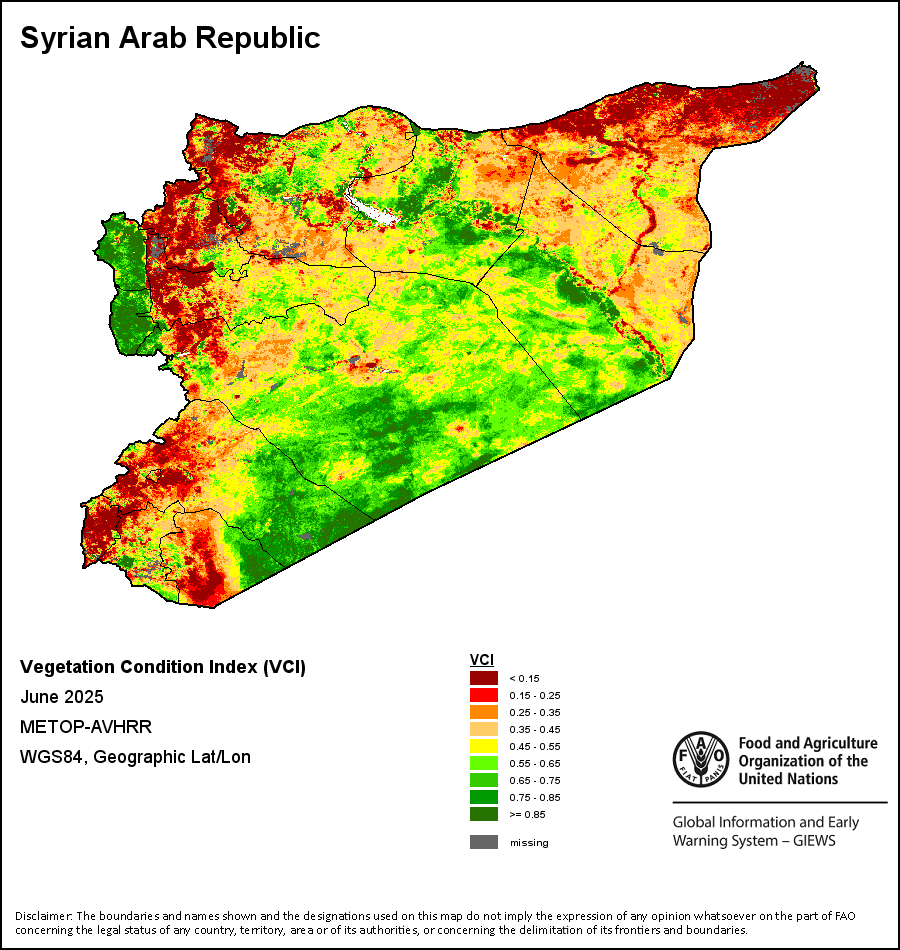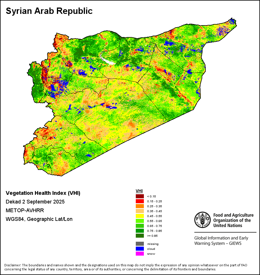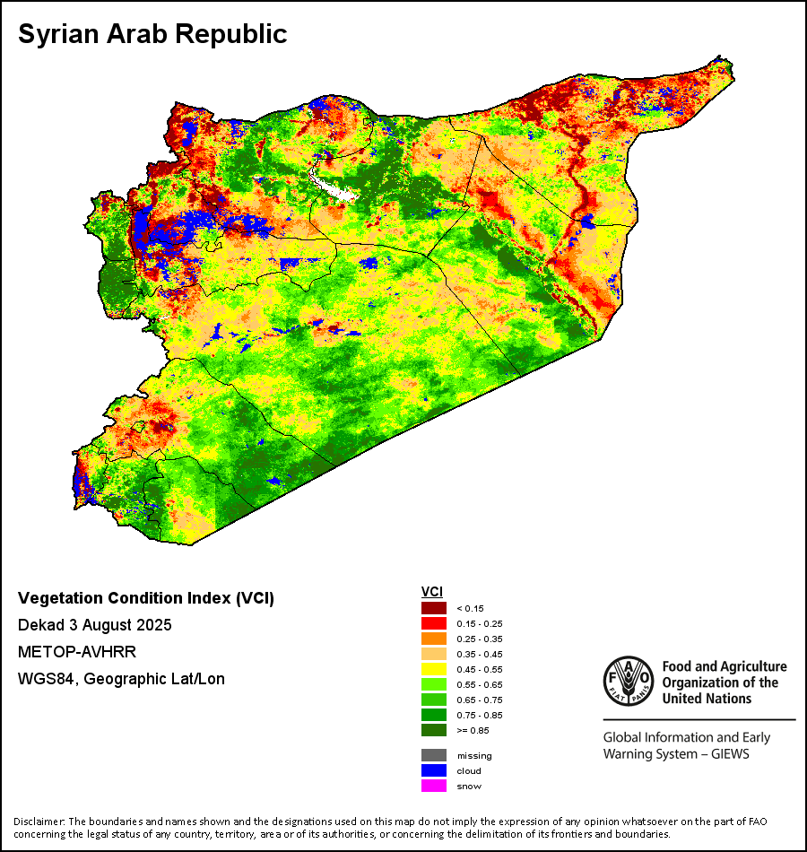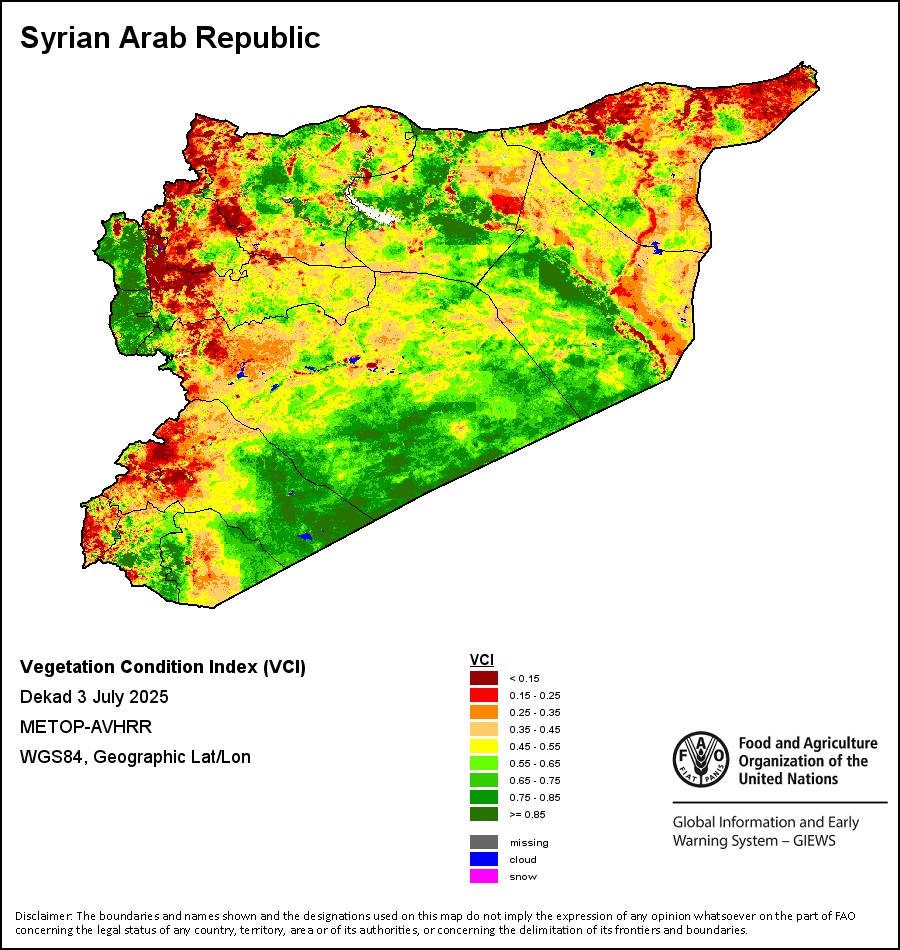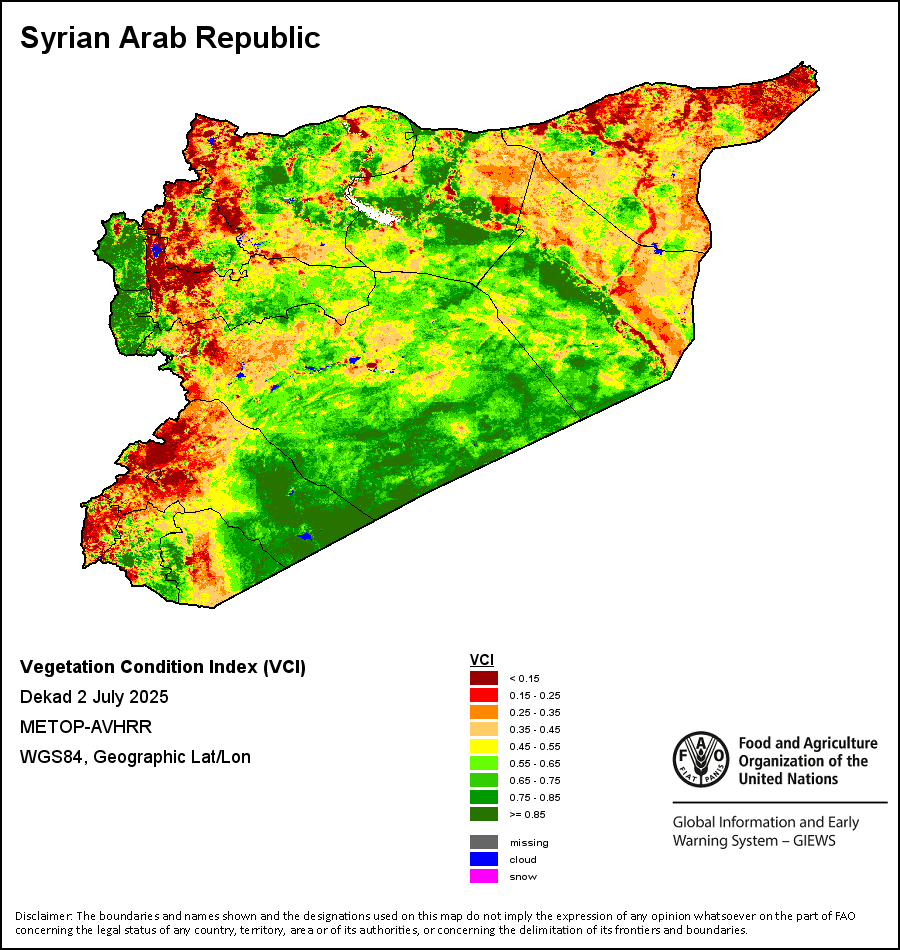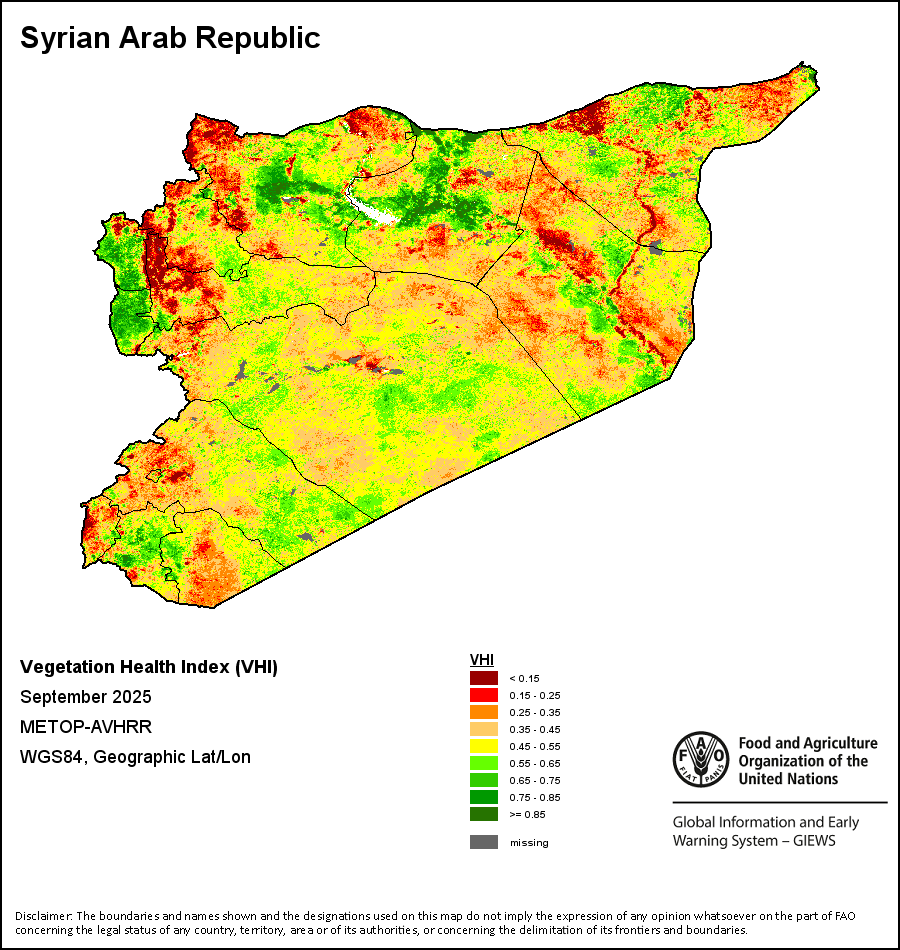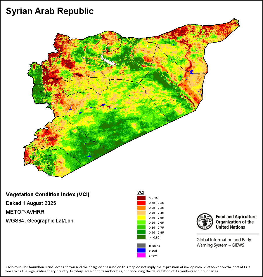 The Agricultural Stress Index (ASI) is a quick-look indicator that facilitates the early identification of cropped land with a high likelihood of water stress (drought). The Index is based on the integration of the Vegetation Health Index (VHI) in two dimensions that are critical in the assessment of a drought event in agriculture: temporal and spatial. The first step of the ASI calculation is a temporal averaging of the VHI, assessing the intensity and duration of dry periods occurring during the crop cycle at the pixel level; this calculation includes the use of crop coefficients, which introduces sensitivity of a crop to water stress during each phenological phase. The second step determines the spatial extent of drought events by calculating the percentage of pixels in arable areas with a VHI value below 35 percent (this value was identified as a critical threshold in assessing the extent of drought in previous research by Kogan, 1995). Each administrative area is classified according to the percentage of the affected area to facilitate the quick interpretation of results.