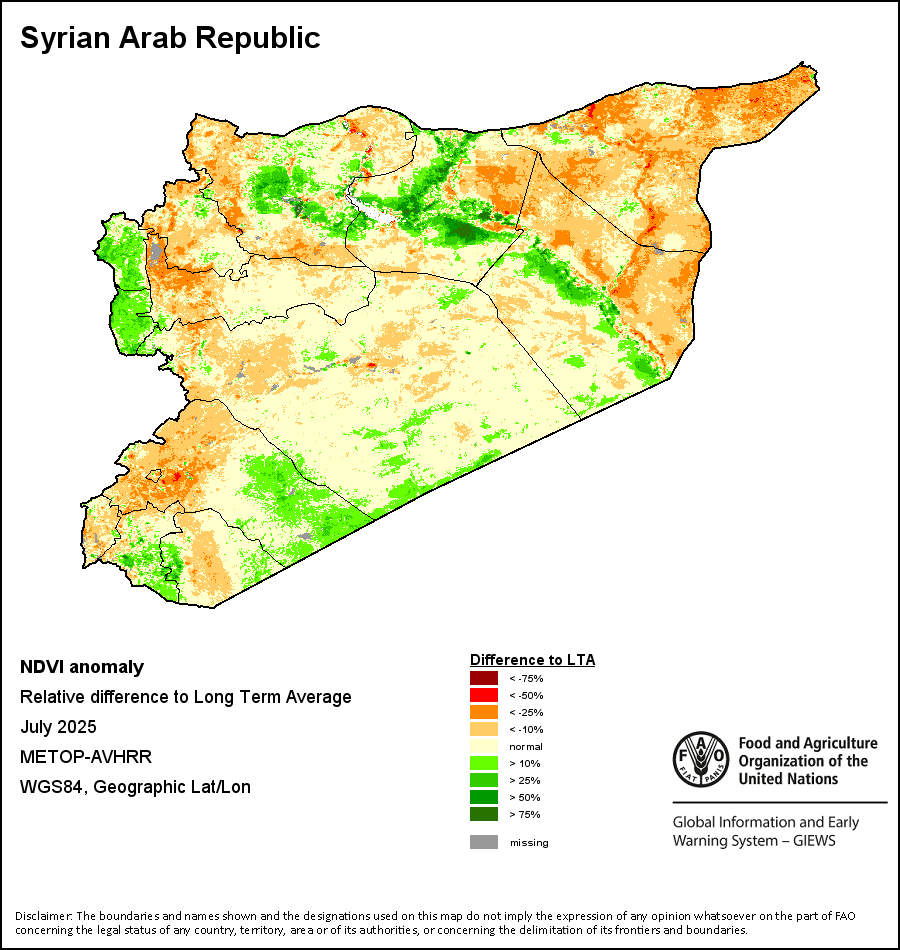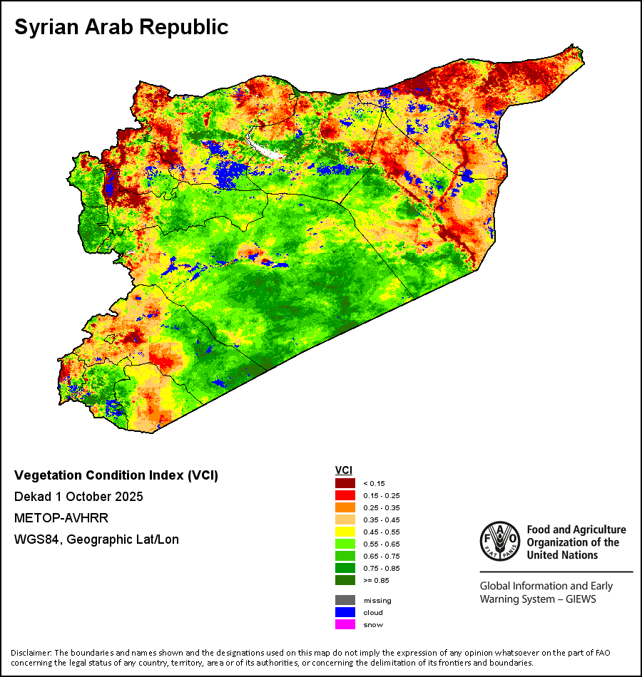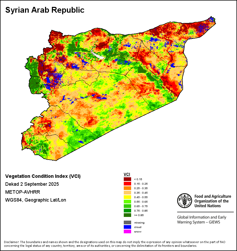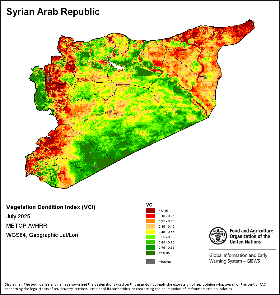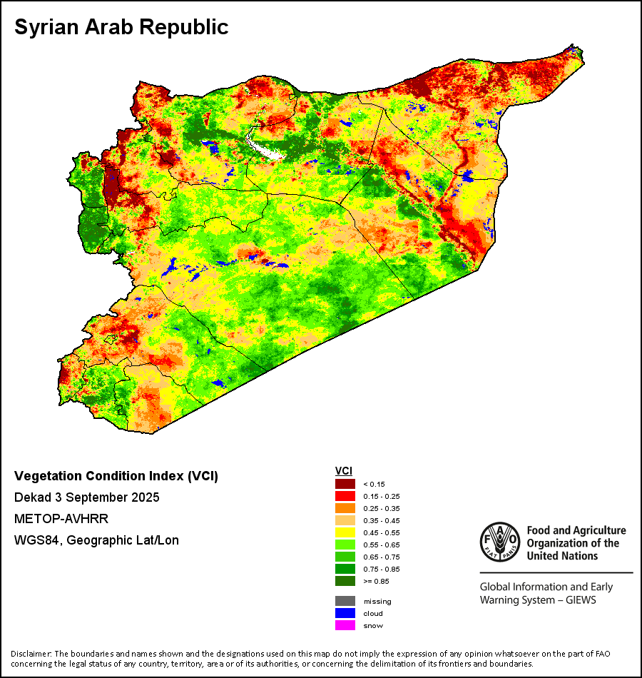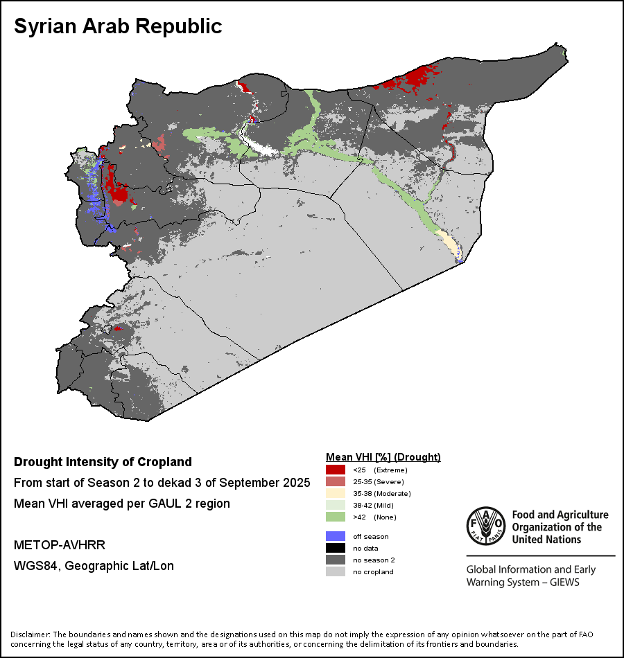 The Agricultural Stress Index (ASI) is a quick-look indicator that facilitates the early identification of cropped land with a high likelihood of water stress (drought). The Index is based on the integration of the Vegetation Health Index (VHI) in two dimensions that are critical in the assessment of a drought event in agriculture: temporal and spatial. The first step of the ASI calculation is a temporal averaging of the VHI, assessing the intensity and duration of dry periods occurring during the crop cycle at the pixel level; this calculation includes the use of crop coefficients, which introduces sensitivity of a crop to water stress during each phenological phase. The second step determines the spatial extent of drought events by calculating the percentage of pixels in arable areas with a VHI value below 35 percent (this value was identified as a critical threshold in assessing the extent of drought in previous research by Kogan, 1995). Each administrative area is classified according to the percentage of the affected area to facilitate the quick interpretation of results.