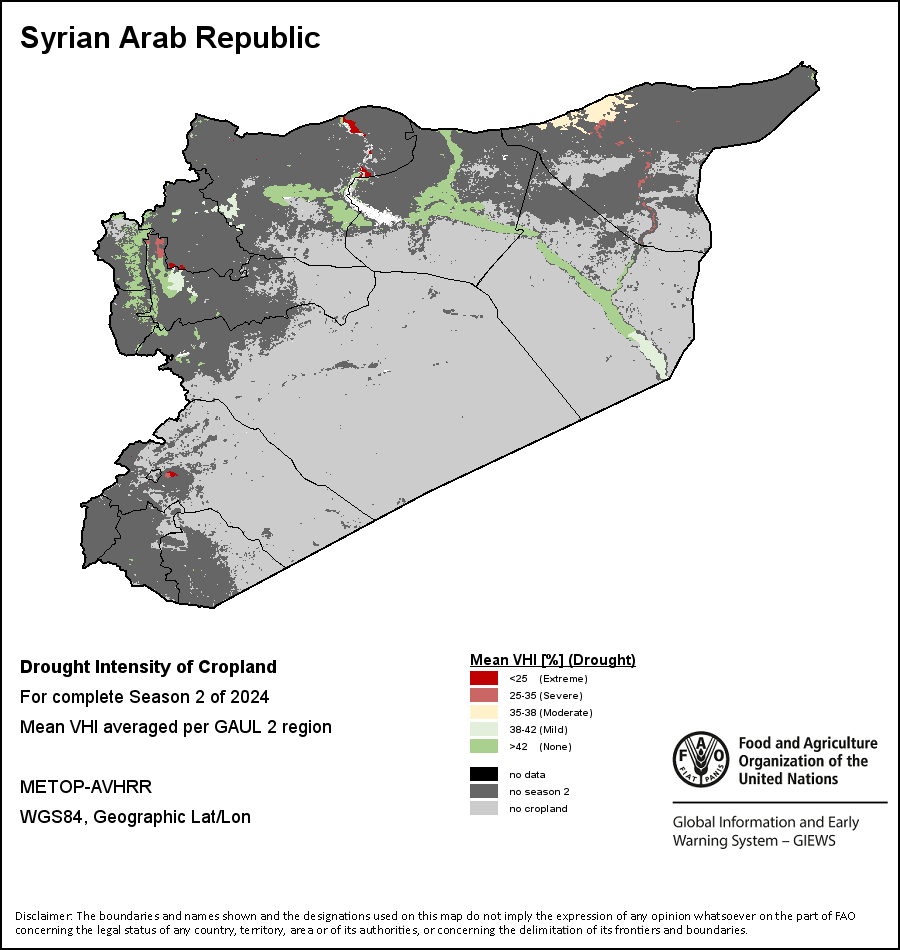 Agricultural droughts are classified by their intensity and are categorized into four classes: Extreme, Severe, Moderate or Mild. The intensity of the drought is calculated through the Weighted Mean Vegetation Health Index aggregated per GAUL 2 region, indicating that the poorer the vegetation health the more severe the drought.