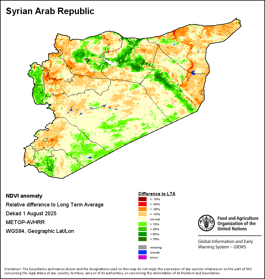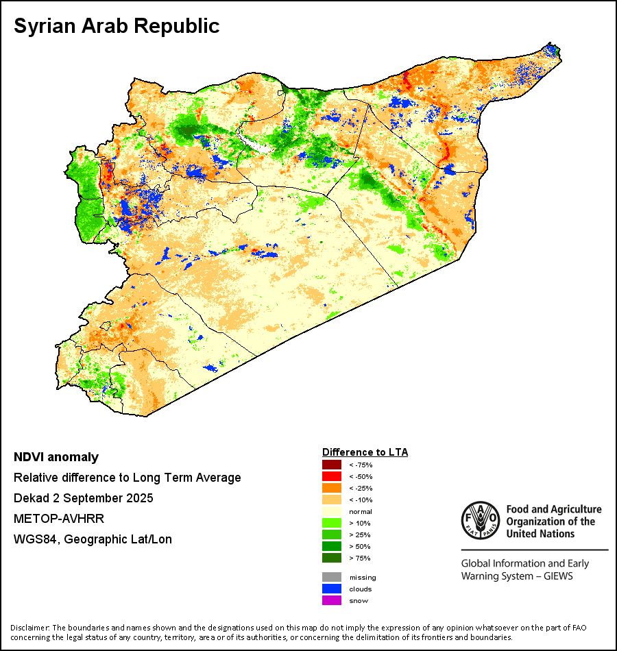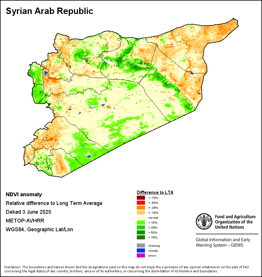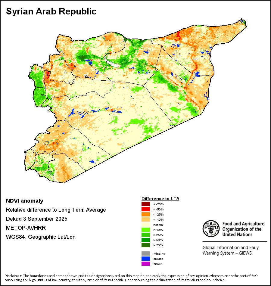 The Normalized Difference Vegetation Index (NDVI) measures the “greenness” of ground cover and is used as a proxy to indicate the density and health of vegetation. NDVI values range from +1 to -1, with high positive values corresponding to dense and healthy vegetation, and low and/or negative NDVI values indicating poor vegetation conditions or sparse vegetative cover. The NDVI anomaly indicates the variation of the current dekad to the long-term average, where a positive value (for example 20 percent) would signify enhanced vegetation conditions compared to the average, while a negative value (for instance -40 percent) would indicate comparatively poor vegetation conditions.