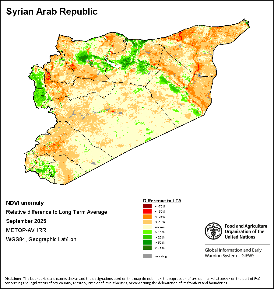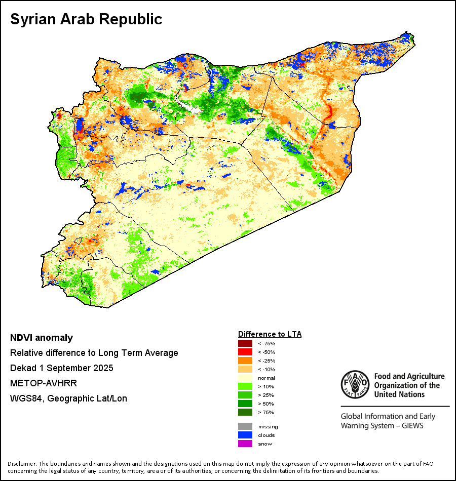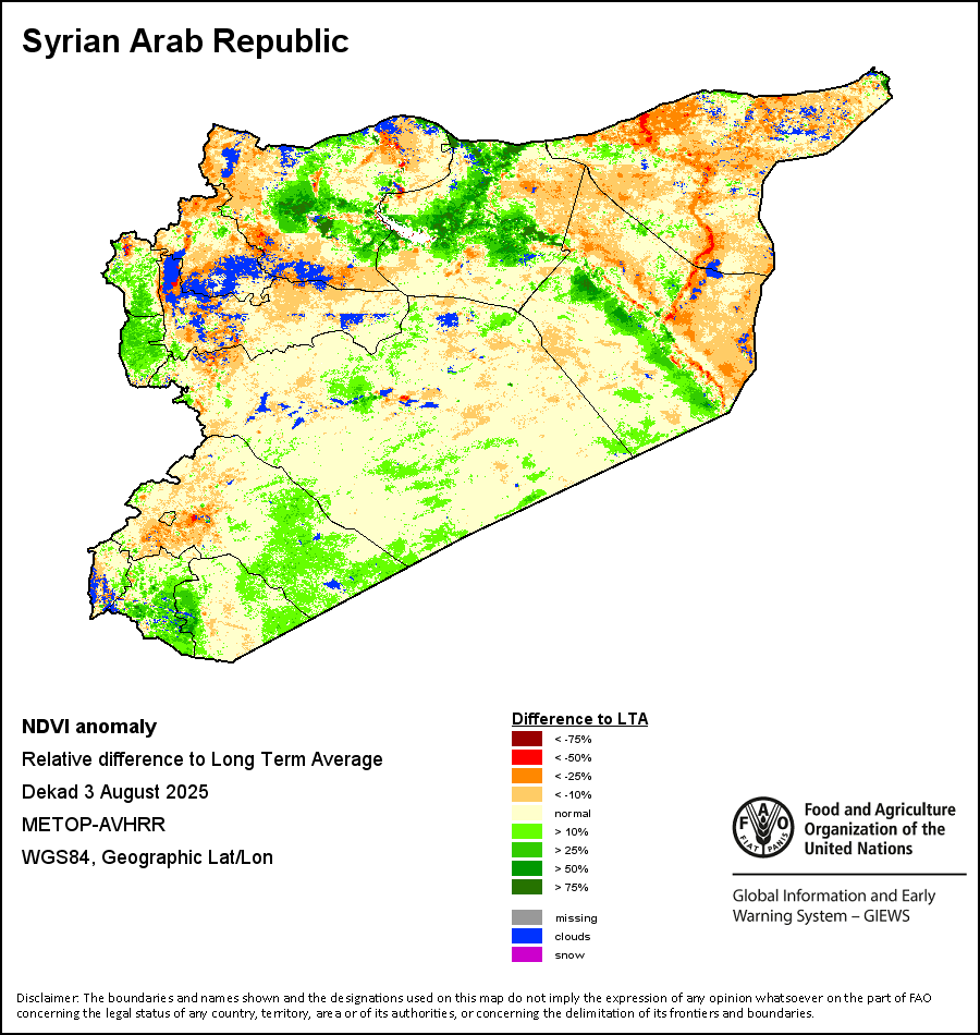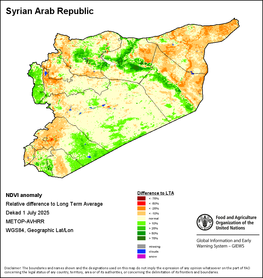 The Normalized Difference Vegetation Index (NDVI) measures the “greenness” of ground cover and is used as a proxy to indicate the density and health of vegetation. NDVI values range from +1 to -1, with high positive values corresponding to dense and healthy vegetation, and low and/or negative NDVI values indicating poor vegetation conditions or sparse vegetative cover. The NDVI anomaly indicates the variation of the current dekad to the long-term average, where a positive value (for example 20 percent) would signify enhanced vegetation conditions compared to the average, while a negative value (for instance -40 percent) would indicate comparatively poor vegetation conditions.