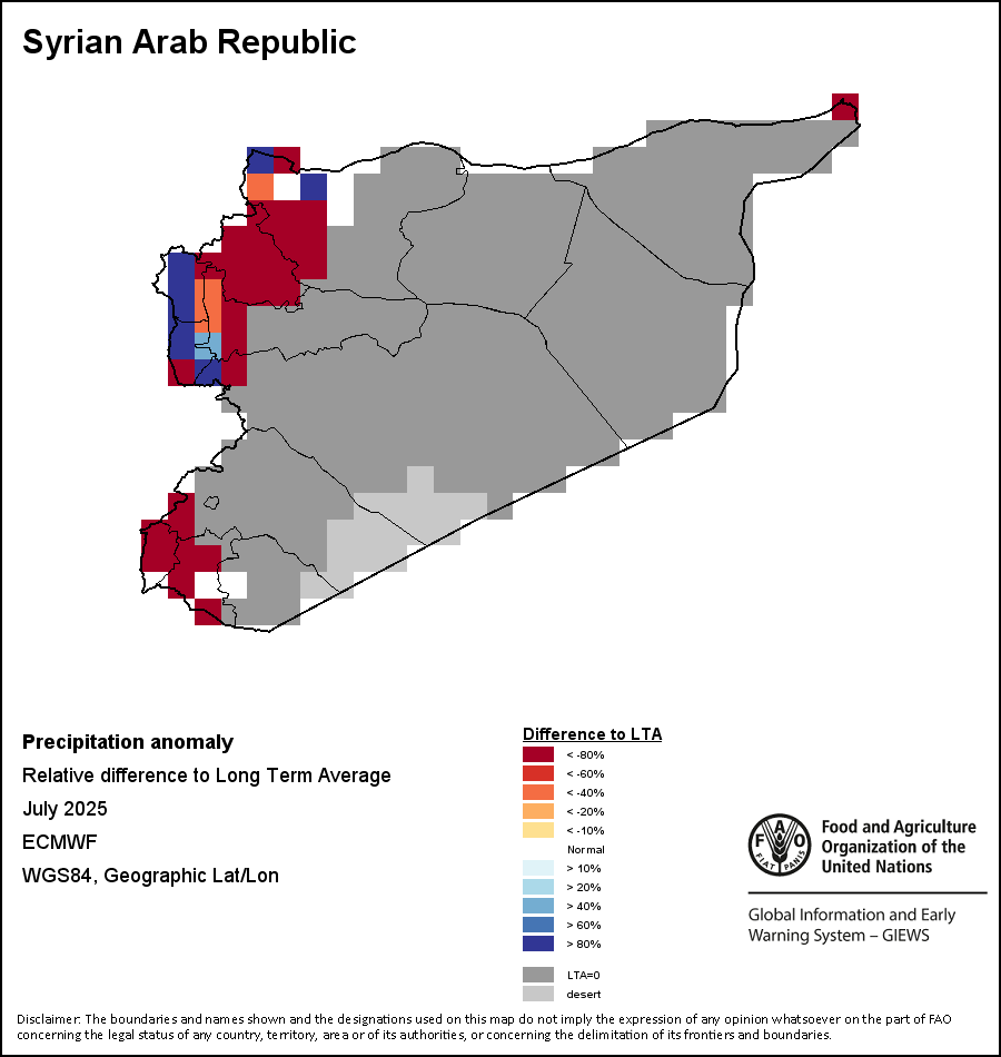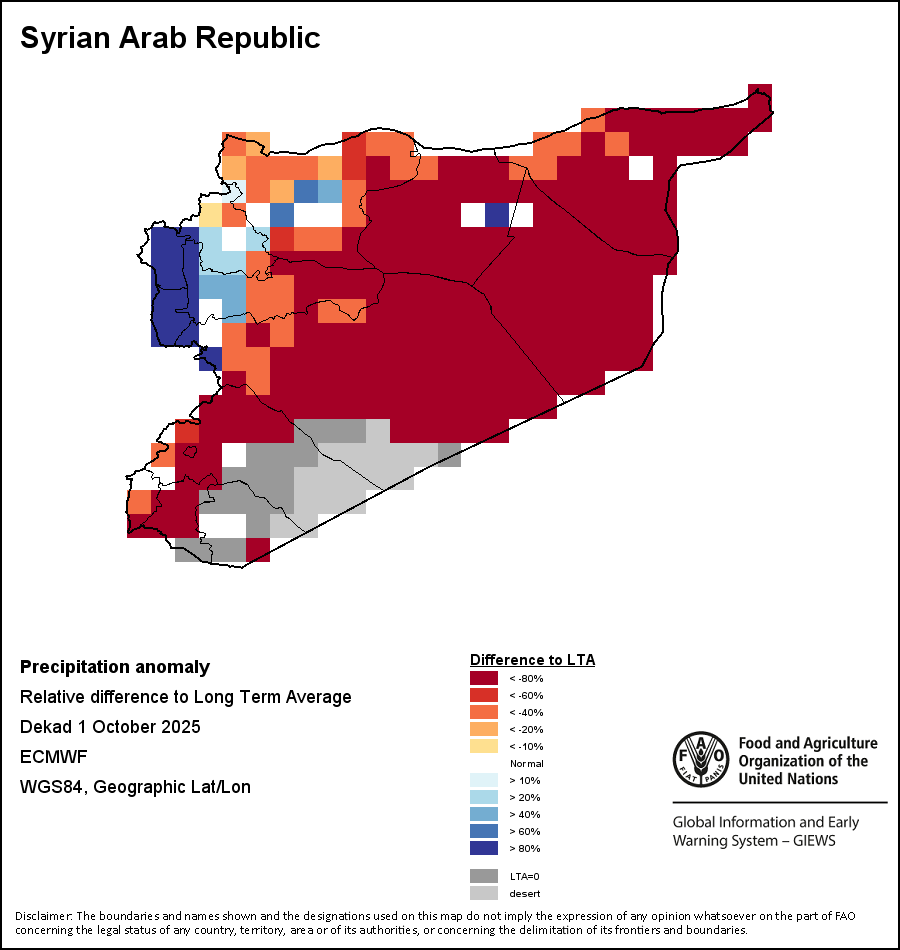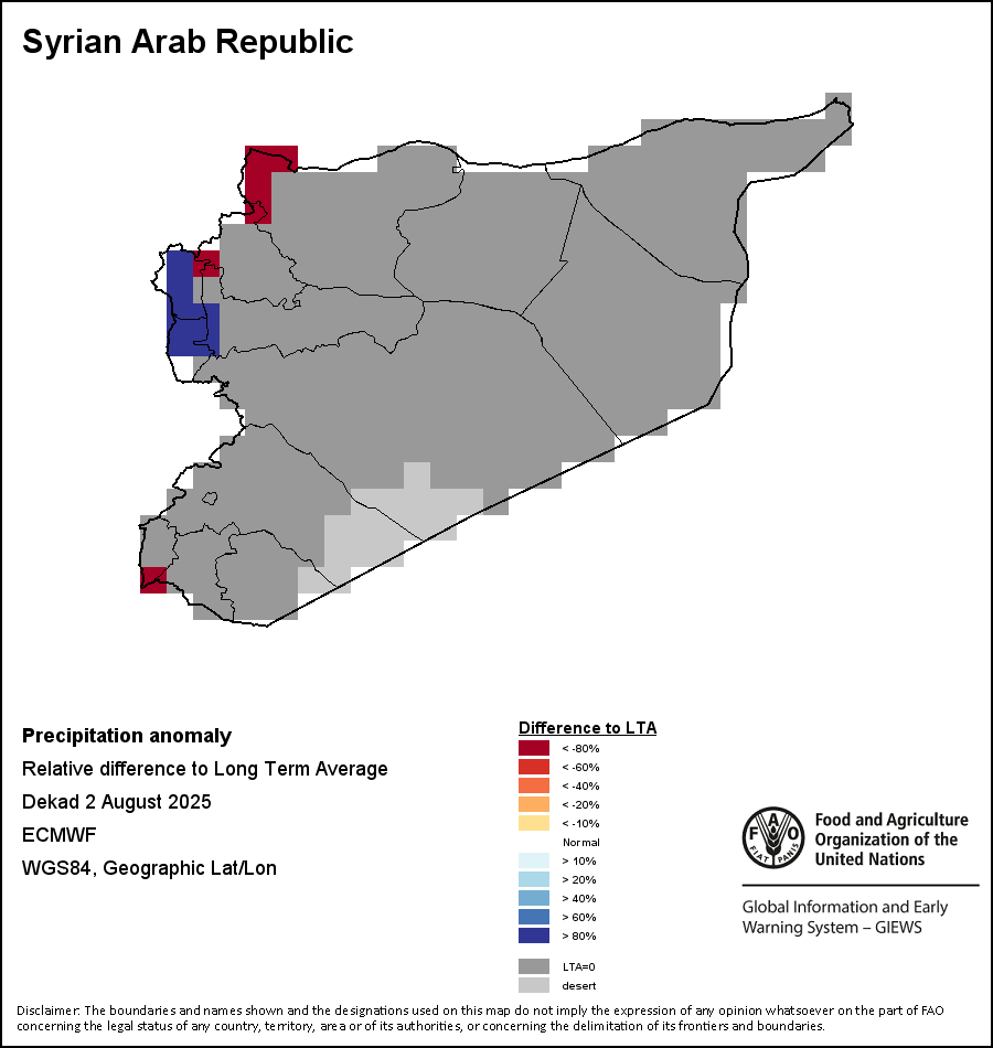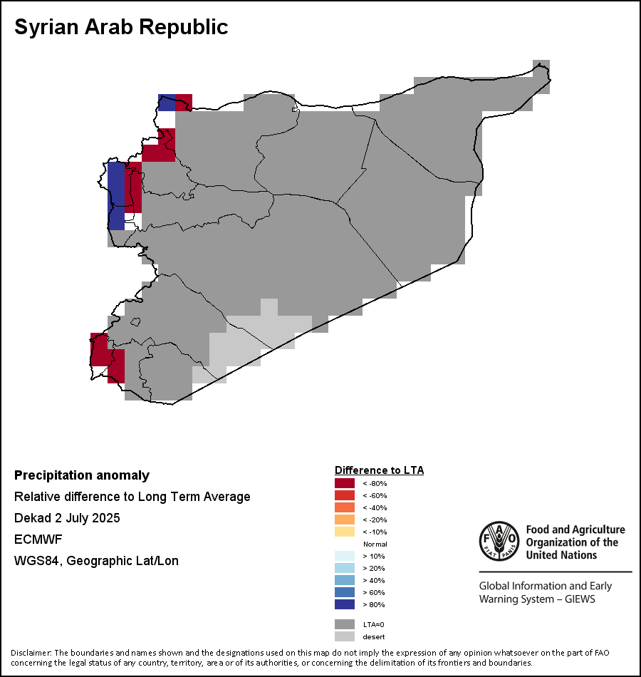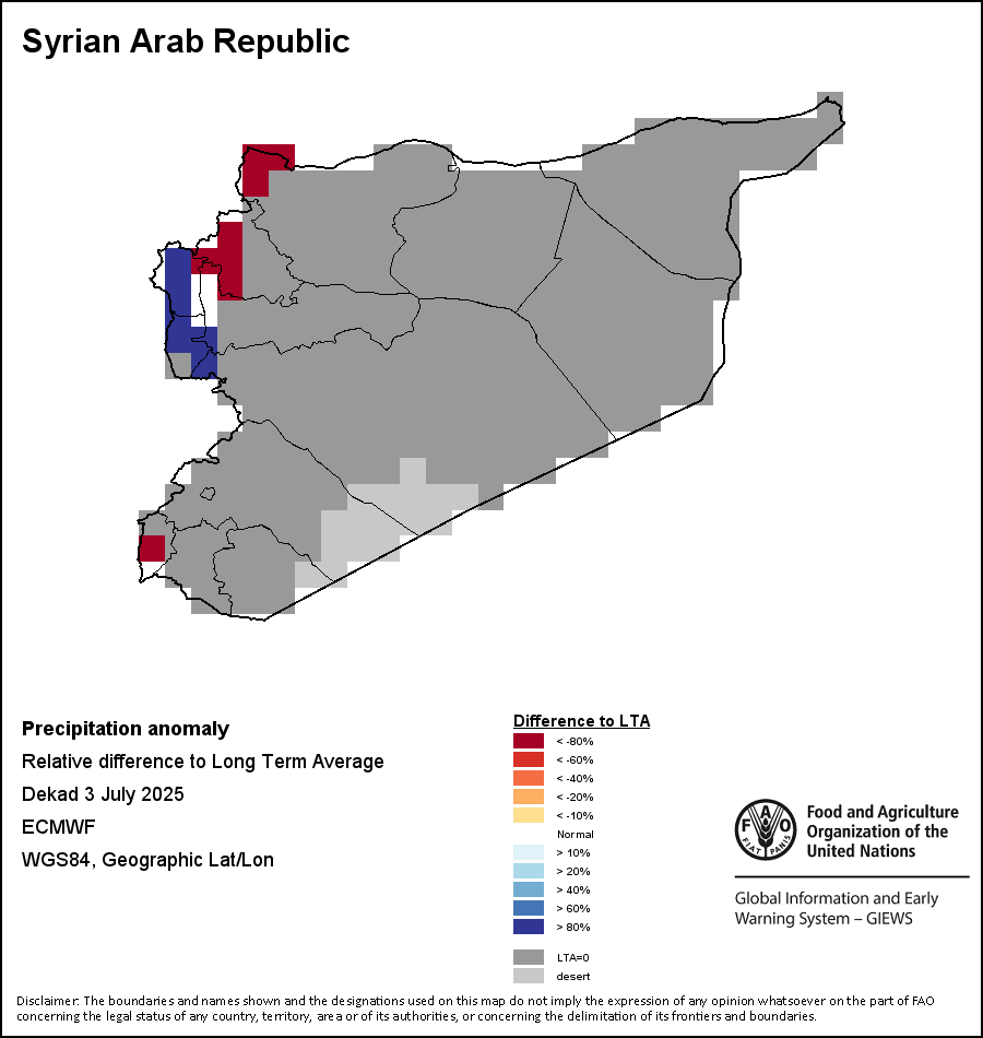 The map illustrates the difference between the current rainfall volume and the average level. Rainfall levels are compared with the Long-Term Average (LTA), which refers to the period 1989-2015. Warmer colours identify areas which have received lower-than-average rainfall, while colder colours are given to areas where precipitation has been above average.