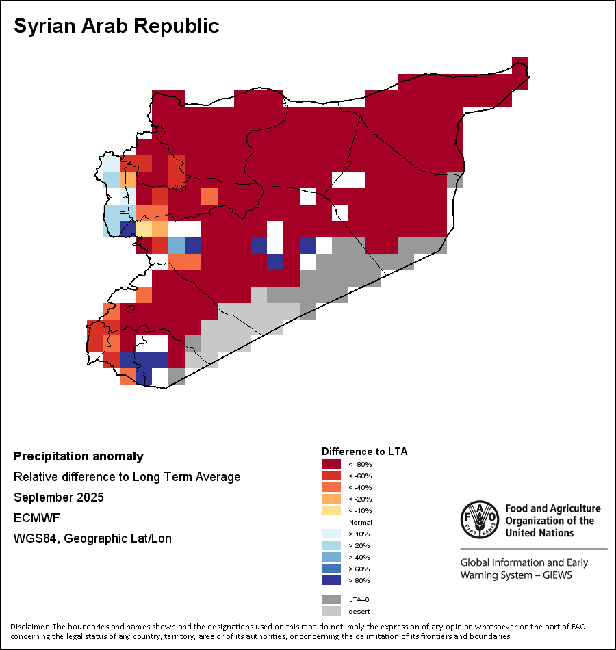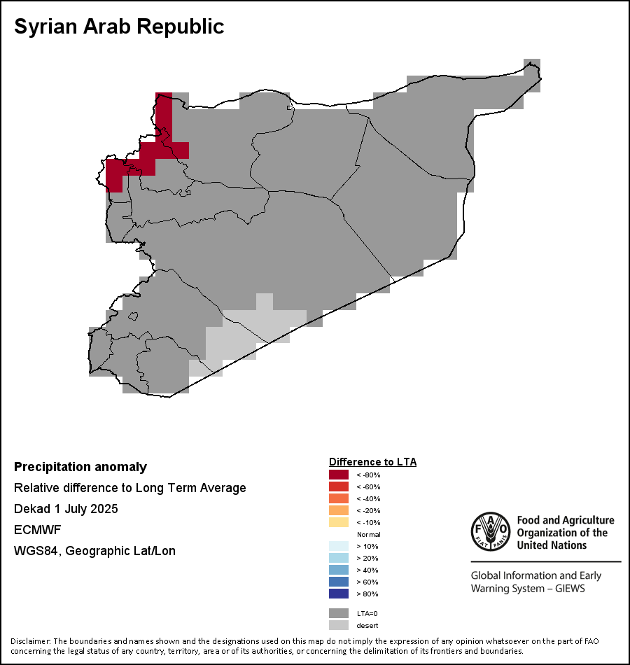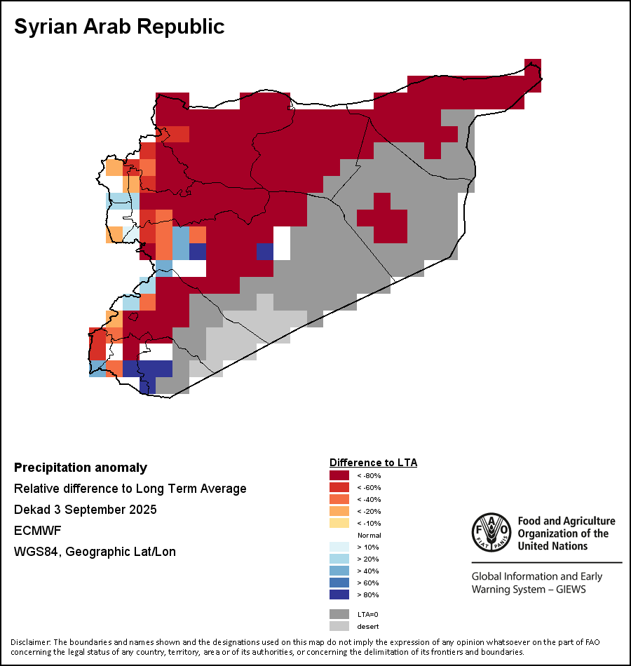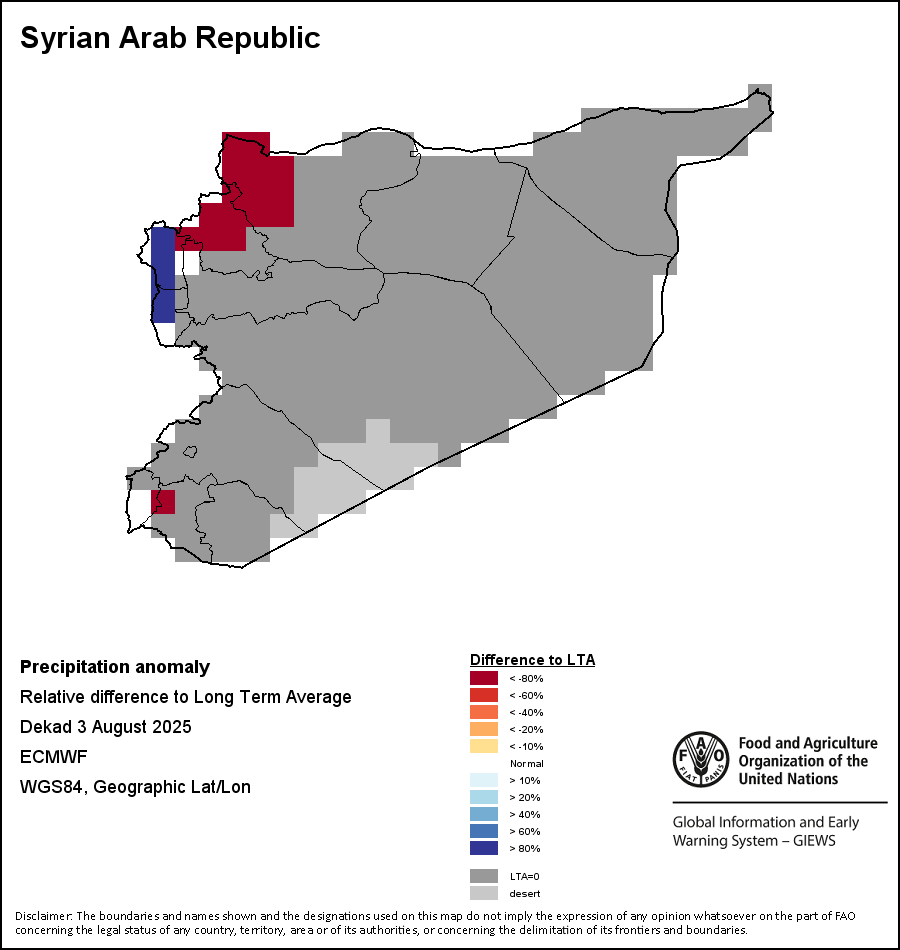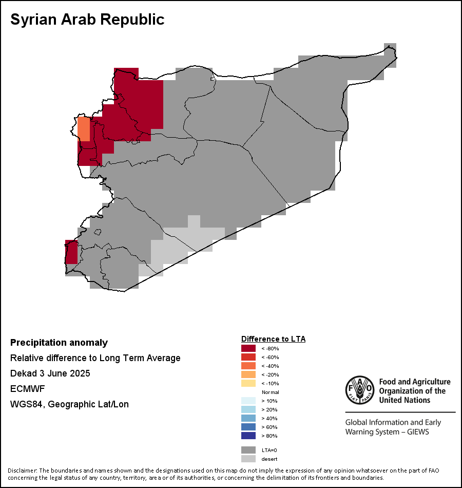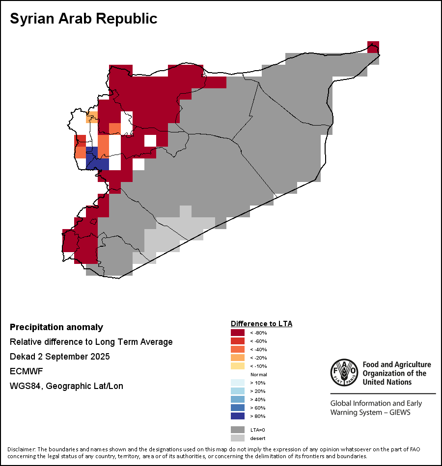 The map illustrates the difference between the current rainfall volume and the average level. Rainfall levels are compared with the Long-Term Average (LTA), which refers to the period 1989-2015. Warmer colours identify areas which have received lower-than-average rainfall, while colder colours are given to areas where precipitation has been above average.