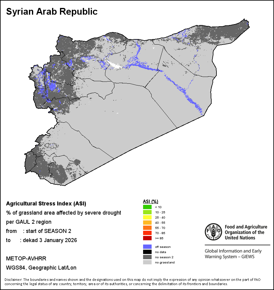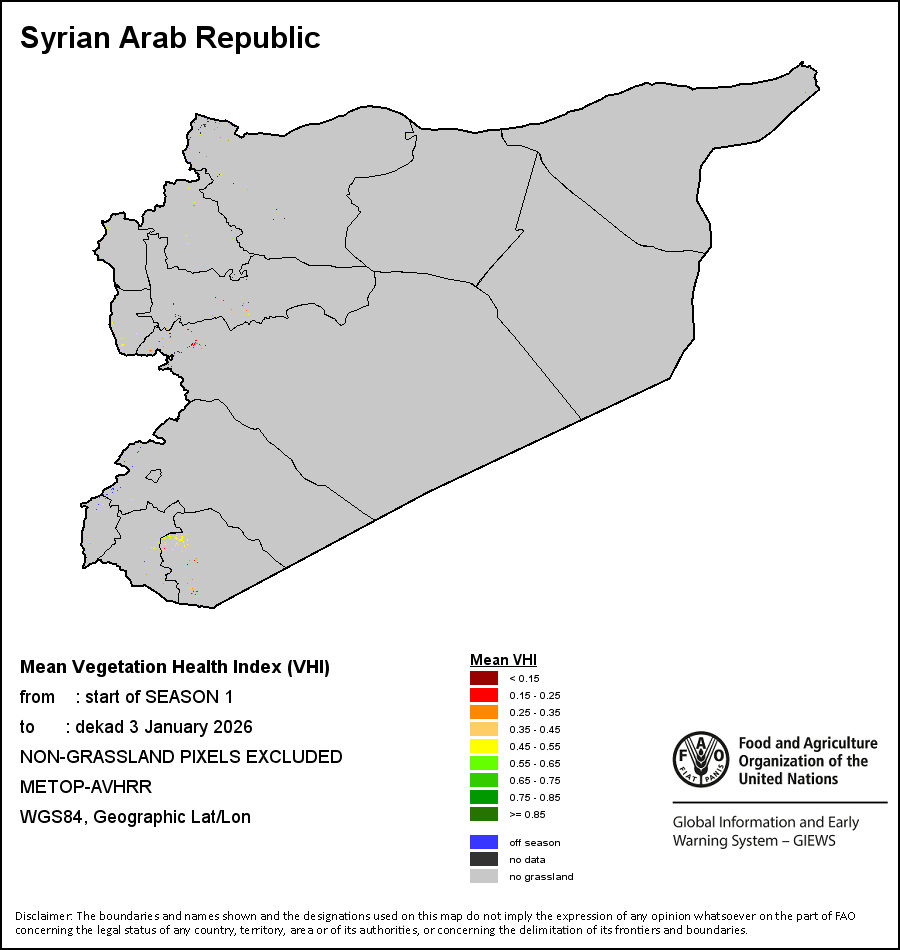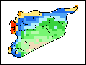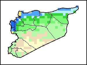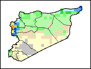 Индекс здоровья растительности (VHI) иллюстрирует серьезность засухи, основанной на здоровье растительности и влиянии температуры на состояние растений. VHI является составным индексом и элементарным индикатором, используемым для вычисления ASI. Он сочетает в себе как Индекс Состояния Растительности (VCI), так и Индекс Состояния Температуры (TCI). TCI рассчитывается с использованием аналогичного уравнения с VCI, но связывает текущую температуру с долгосрочным максимумом и минимумом, так как предполагается, что более высокие температуры, как правило, вызывают ухудшение состояния растительности. Например, уменьшение VHI будет означать относительно слабое состояние растительности и более высокие температуры, означающее ухудшение состояния растительности, что в течение более длительного периода будет свидетельствовать о засухе. Изображения VHI вычисляются для двух основных сезонов и трех модальностей: по-декадный, ежемесячный и годовой. |