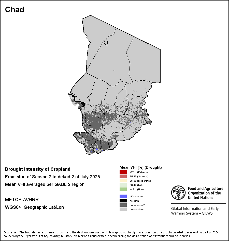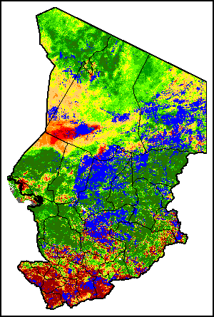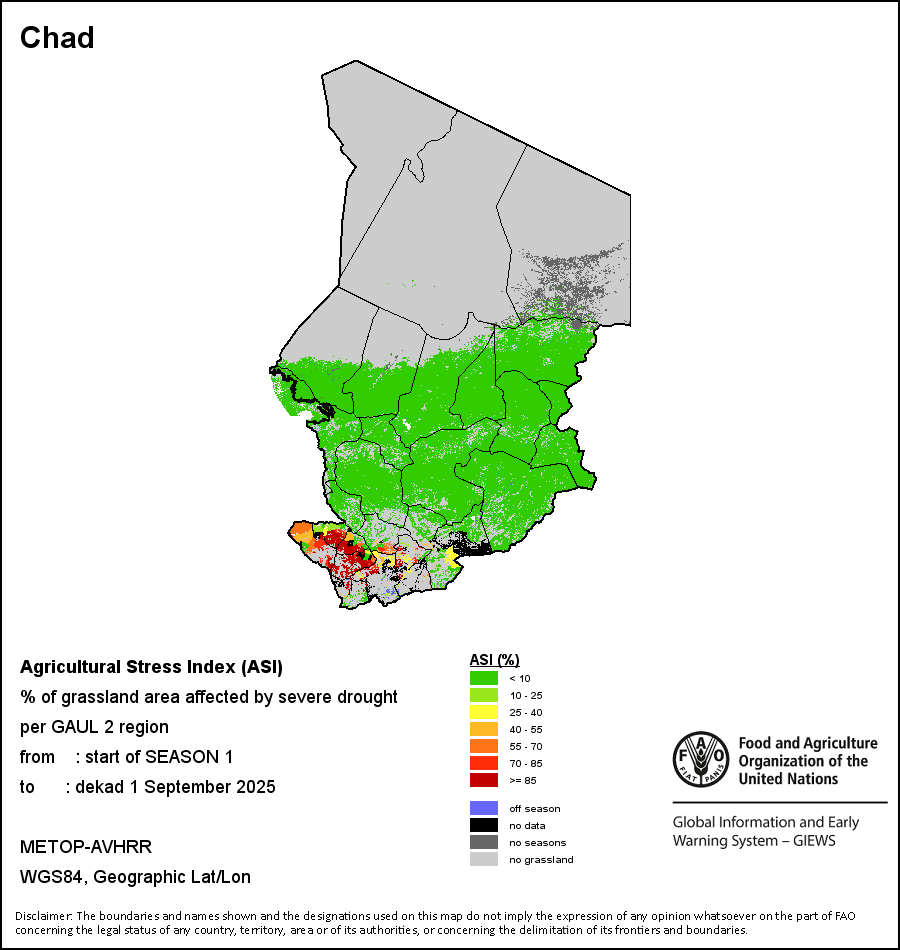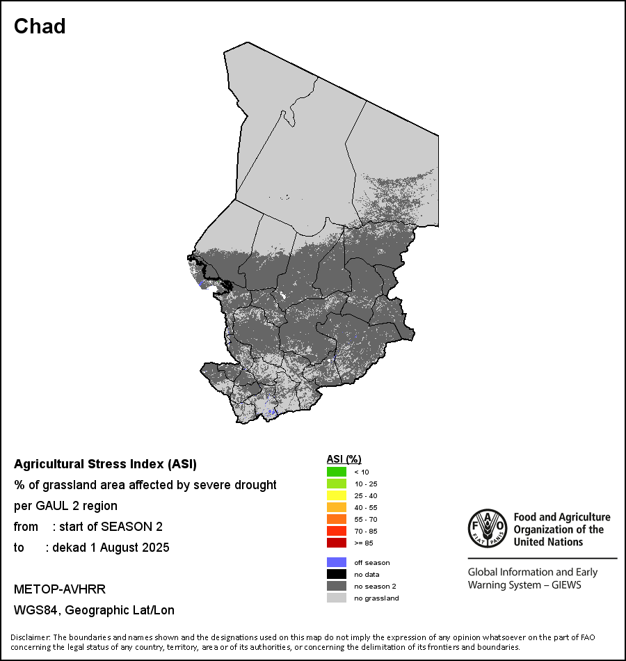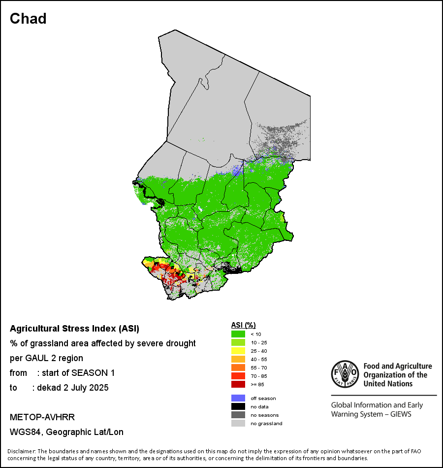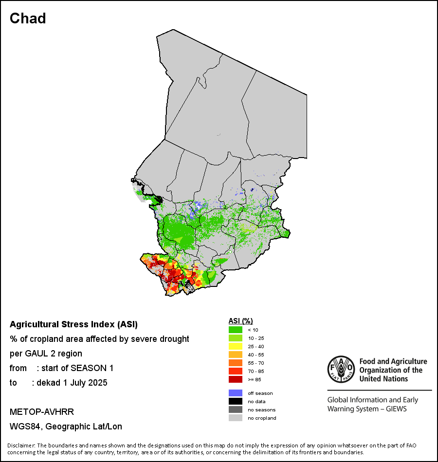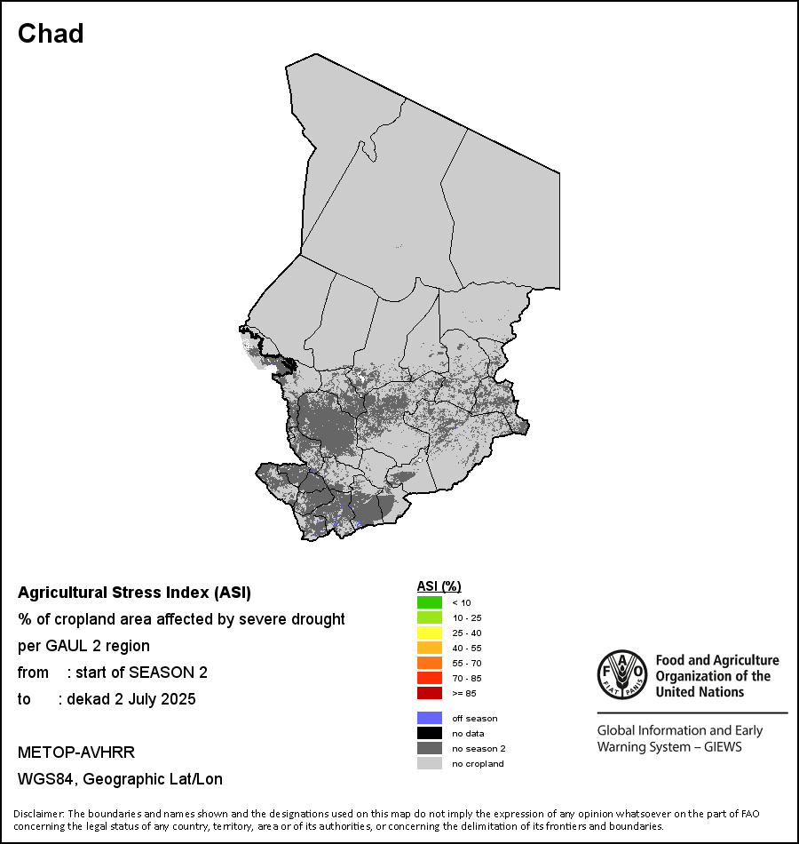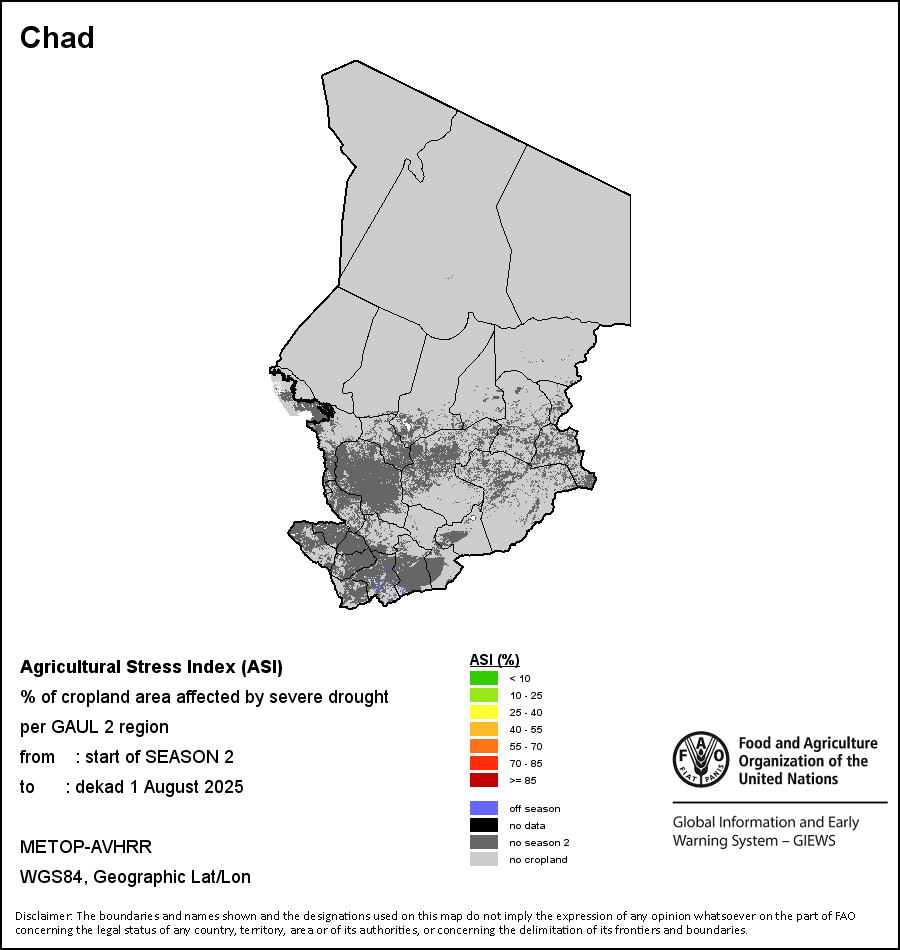 The Agricultural Stress Index (ASI) is a quick-look indicator that facilitates the early identification of cropped land with a high likelihood of water stress (drought). The Index is based on the integration of the Vegetation Health Index (VHI) in two dimensions that are critical in the assessment of a drought event in agriculture: temporal and spatial. The first step of the ASI calculation is a temporal averaging of the VHI, assessing the intensity and duration of dry periods occurring during the crop cycle at the pixel level; this calculation includes the use of crop coefficients, which introduces sensitivity of a crop to water stress during each phenological phase. The second step determines the spatial extent of drought events by calculating the percentage of pixels in arable areas with a VHI value below 35 percent (this value was identified as a critical threshold in assessing the extent of drought in previous research by Kogan, 1995). Each administrative area is classified according to the percentage of the affected area to facilitate the quick interpretation of results.
