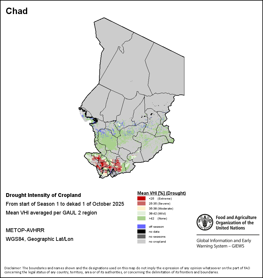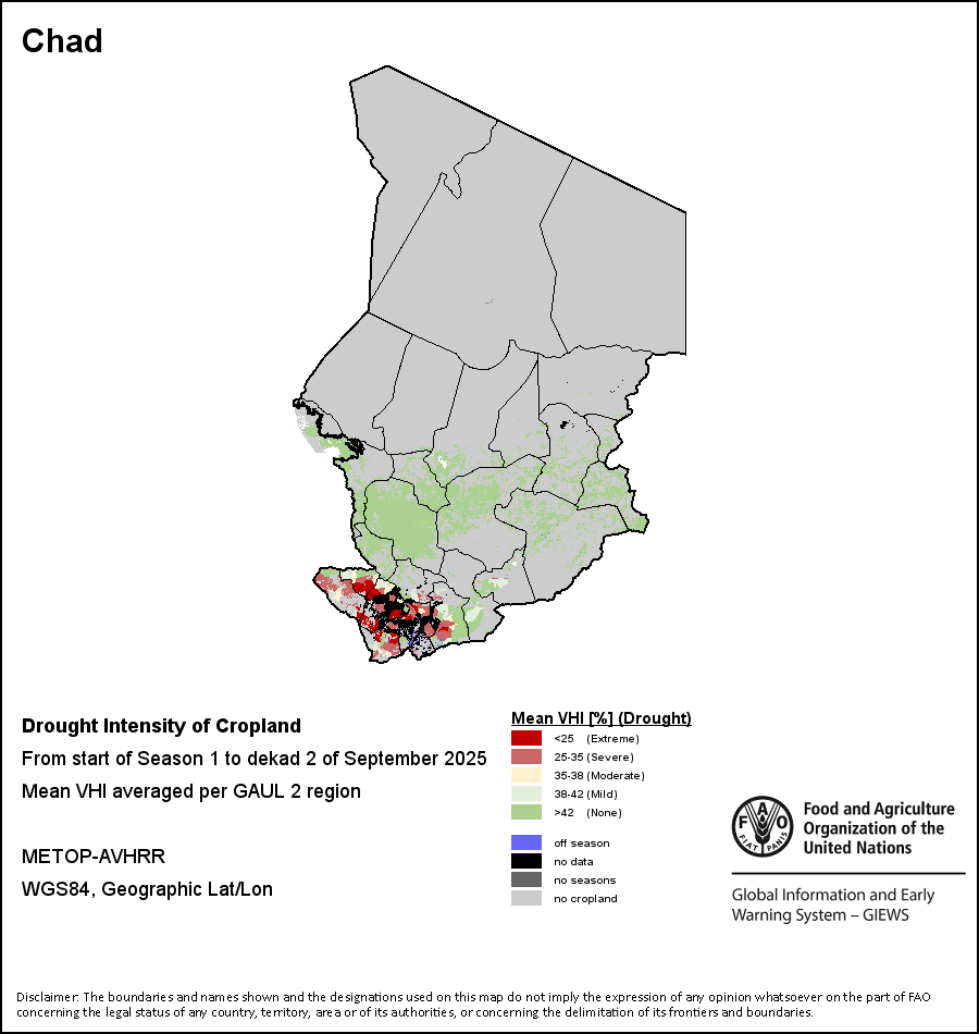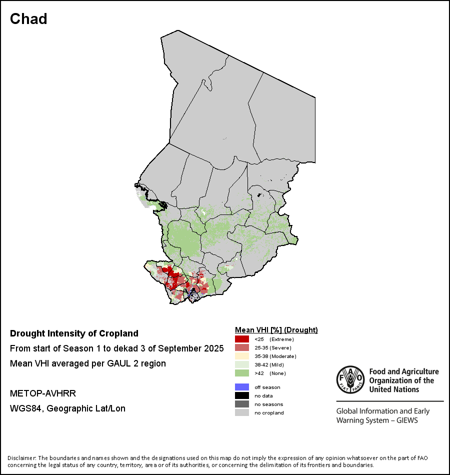 Agricultural droughts are classified by their intensity and are categorized into four classes: Extreme, Severe, Moderate or Mild. The intensity of the drought is calculated through the Weighted Mean Vegetation Health Index aggregated per GAUL 2 region, indicating that the poorer the vegetation health the more severe the drought.