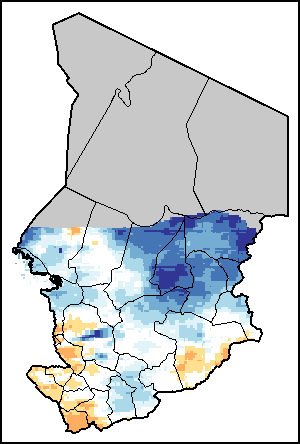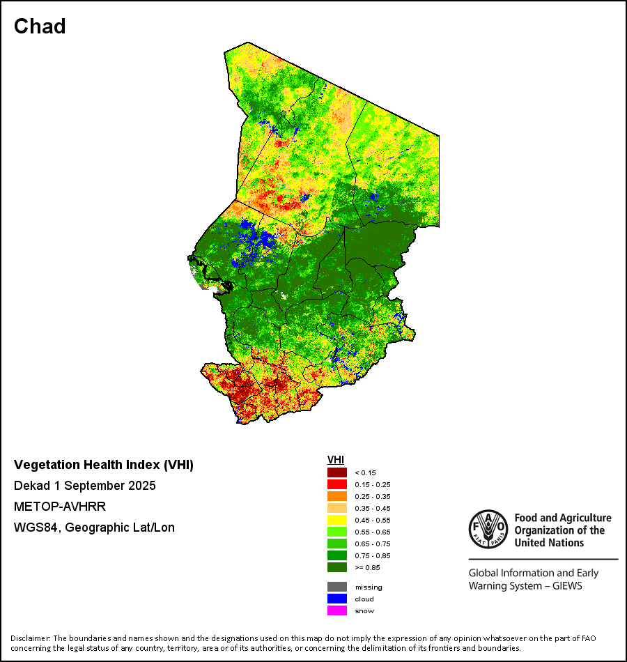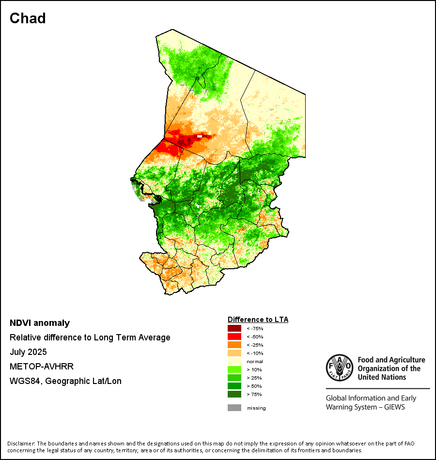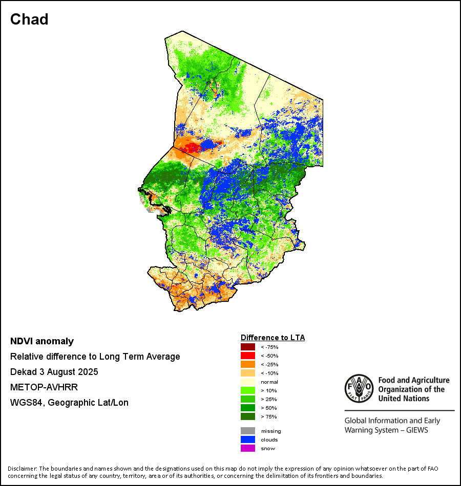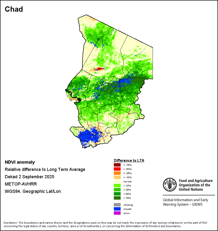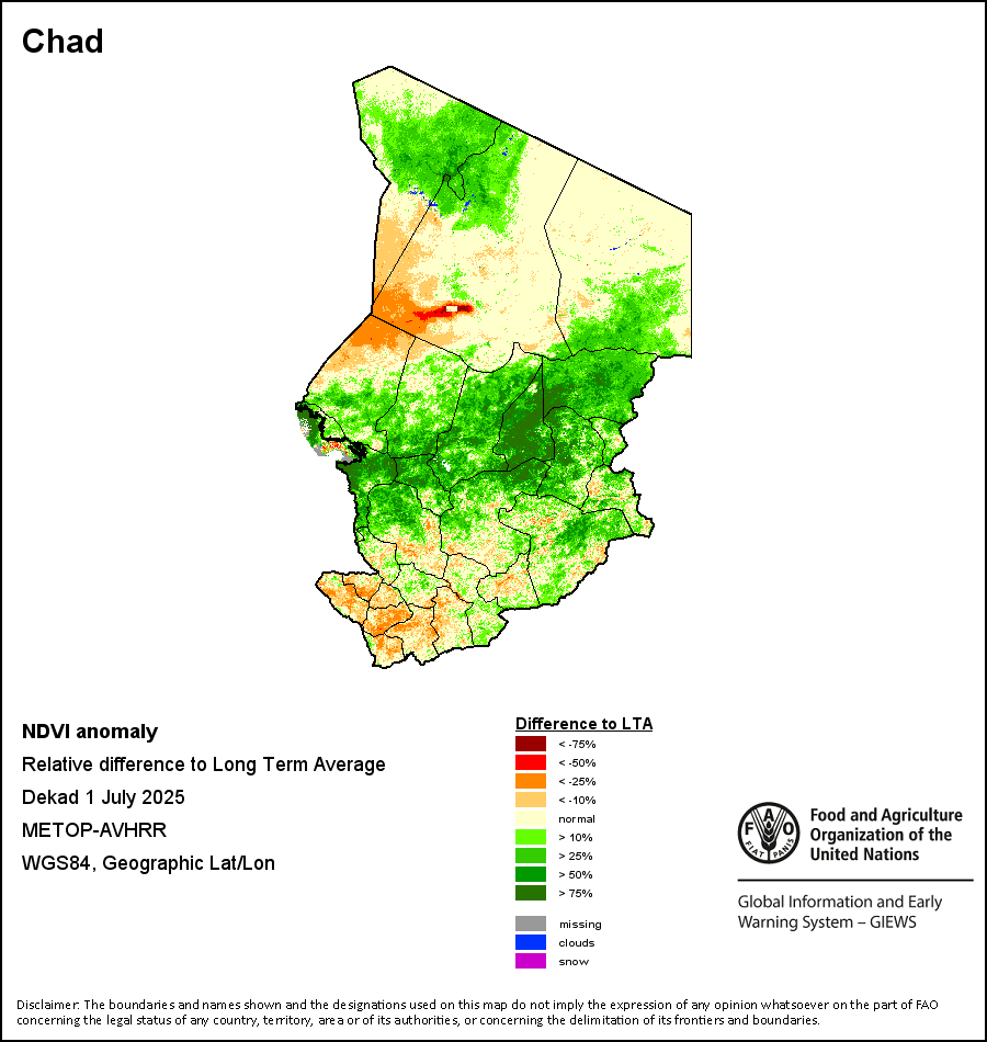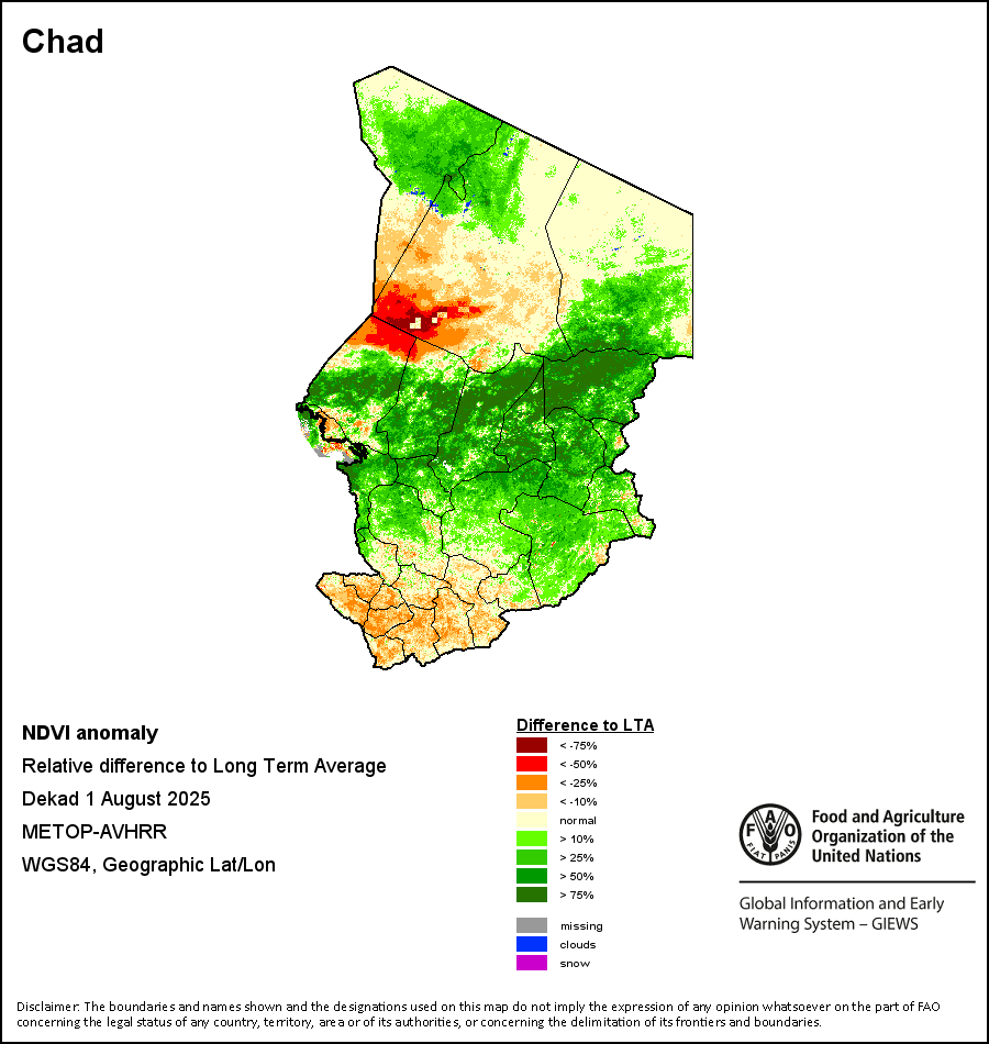 The Normalized Difference Vegetation Index (NDVI) measures the “greenness” of ground cover and is used as a proxy to indicate the density and health of vegetation. NDVI values range from +1 to -1, with high positive values corresponding to dense and healthy vegetation, and low and/or negative NDVI values indicating poor vegetation conditions or sparse vegetative cover. The NDVI anomaly indicates the variation of the current dekad to the long-term average, where a positive value (for example 20 percent) would signify enhanced vegetation conditions compared to the average, while a negative value (for instance -40 percent) would indicate comparatively poor vegetation conditions.