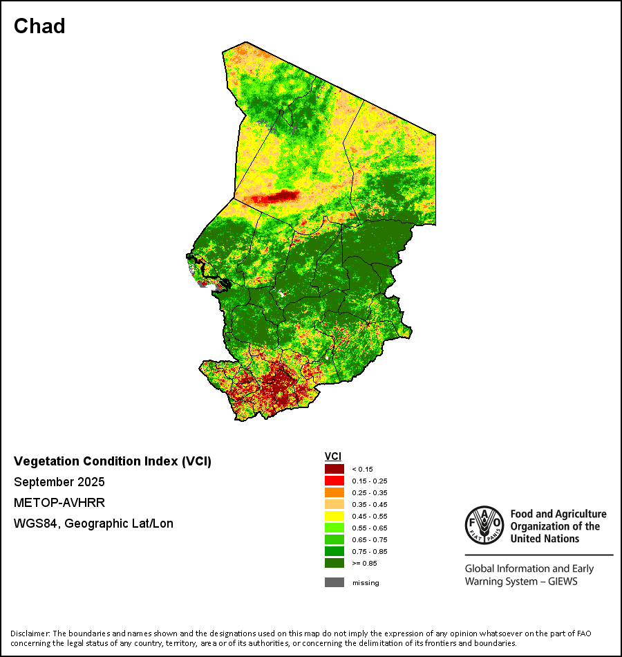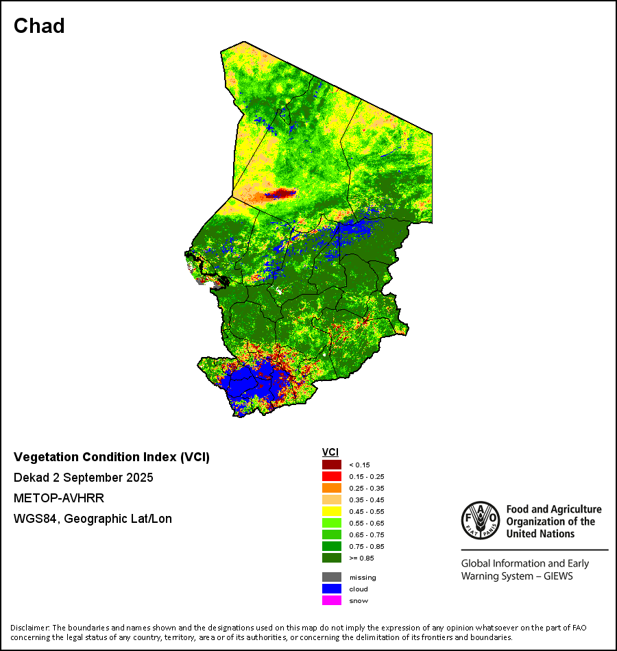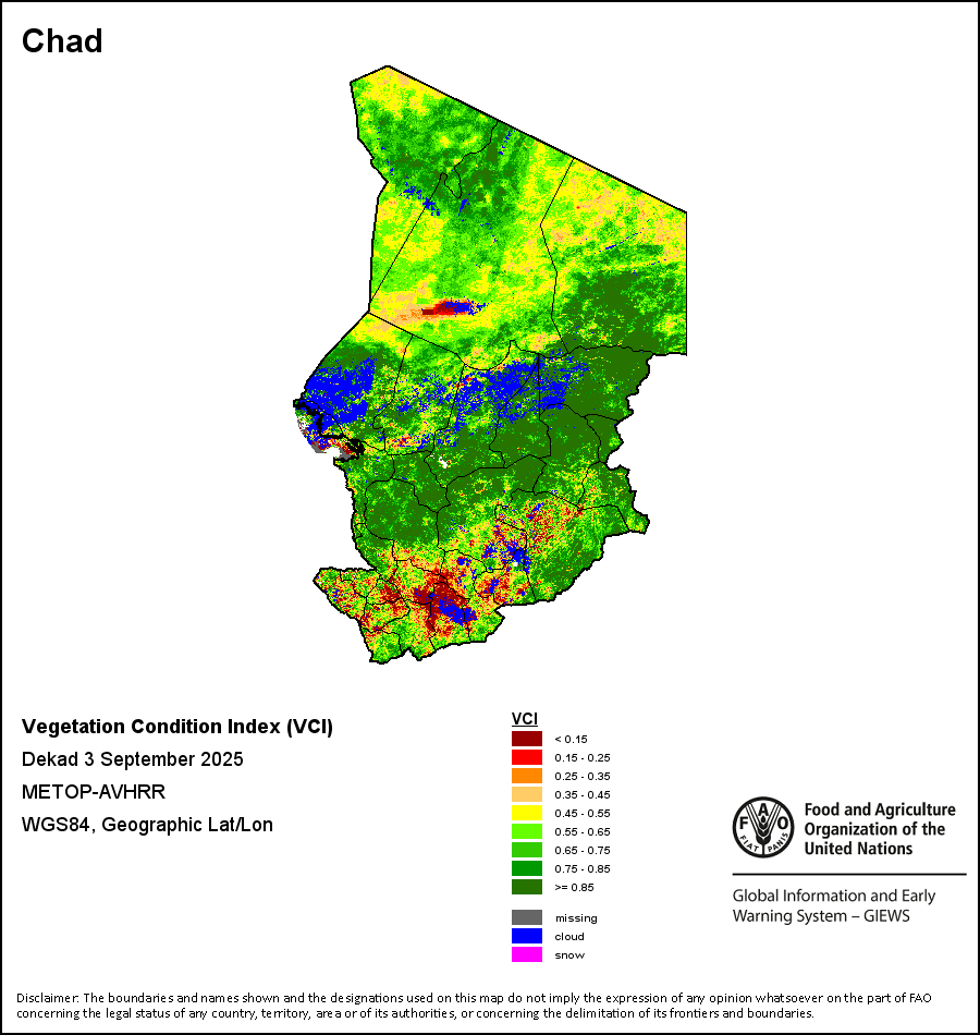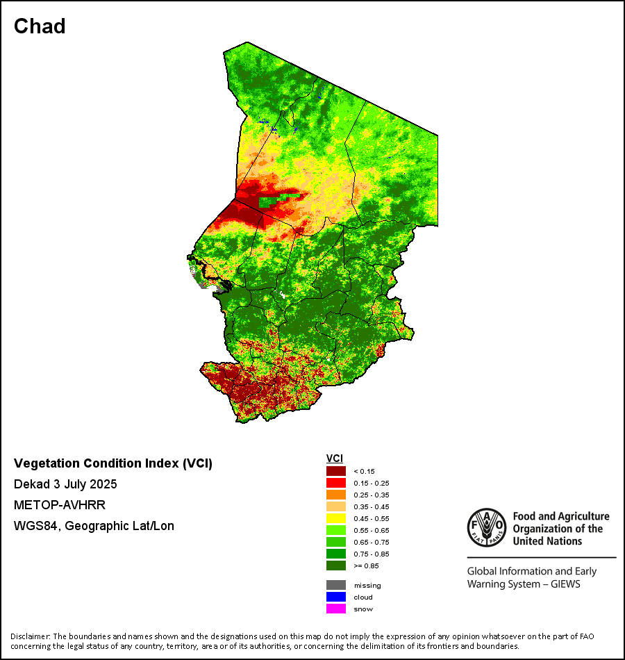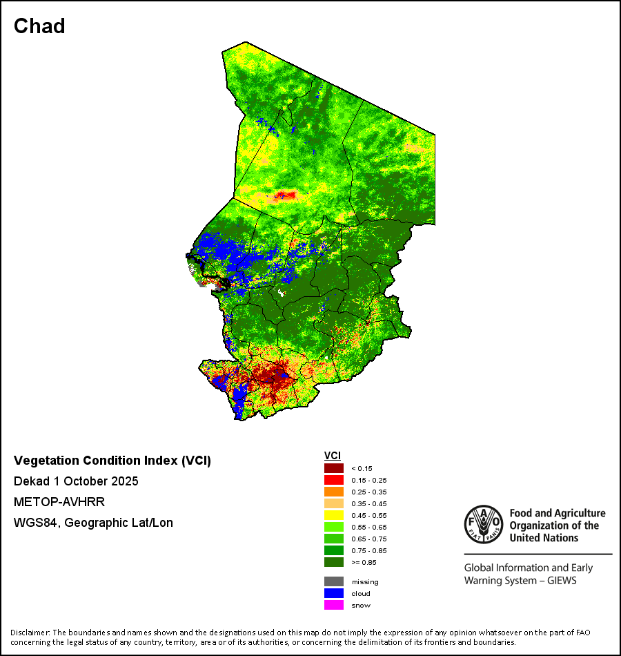 The Vegetation Condition Index (VCI) evaluates the current vegetation health in comparison to the historical trends. The VCI relates current dekadal Normalized Difference Vegetation Index (NDVI) to its long-term minimum and maximum, normalized by the historical range of NDVI values for the same dekad. The VCI was designed to separate the weather-related component of the NDVI from the ecological element.