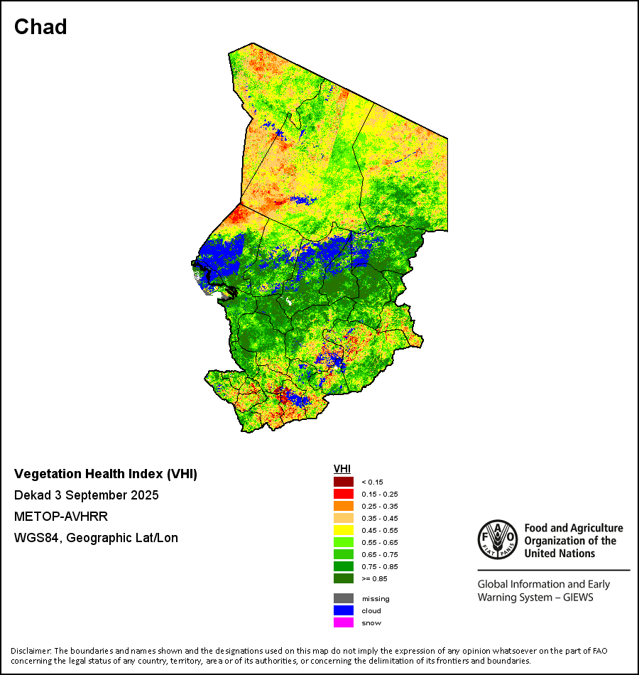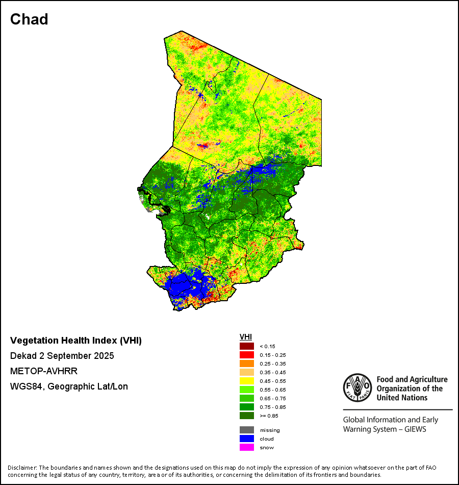 The Vegetation Health Index (VHI) illustrates the severity of drought based on the vegetation health and the influence of temperature on plant conditions. The VHI is a composite index and the elementary indicator used to compute the ASI. It combines both the Vegetation Condition Index (VCI) and the Temperature Condition Index (TCI). The TCI is calculated using a similar equation to the VCI, but relates the current temperature to the long-term maximum and minimum , as it is assumed that higher temperatures tend to cause a deterioration in vegetation conditions. A decrease in the VHI would, for example, indicate relatively poor vegetation conditions and warmer temperatures, signifying stressed vegetation conditions, and over a longer period would be indicative of drought. The VHI images are computed for the two main seasons and in three modalities: dekadal, monthly and annual.